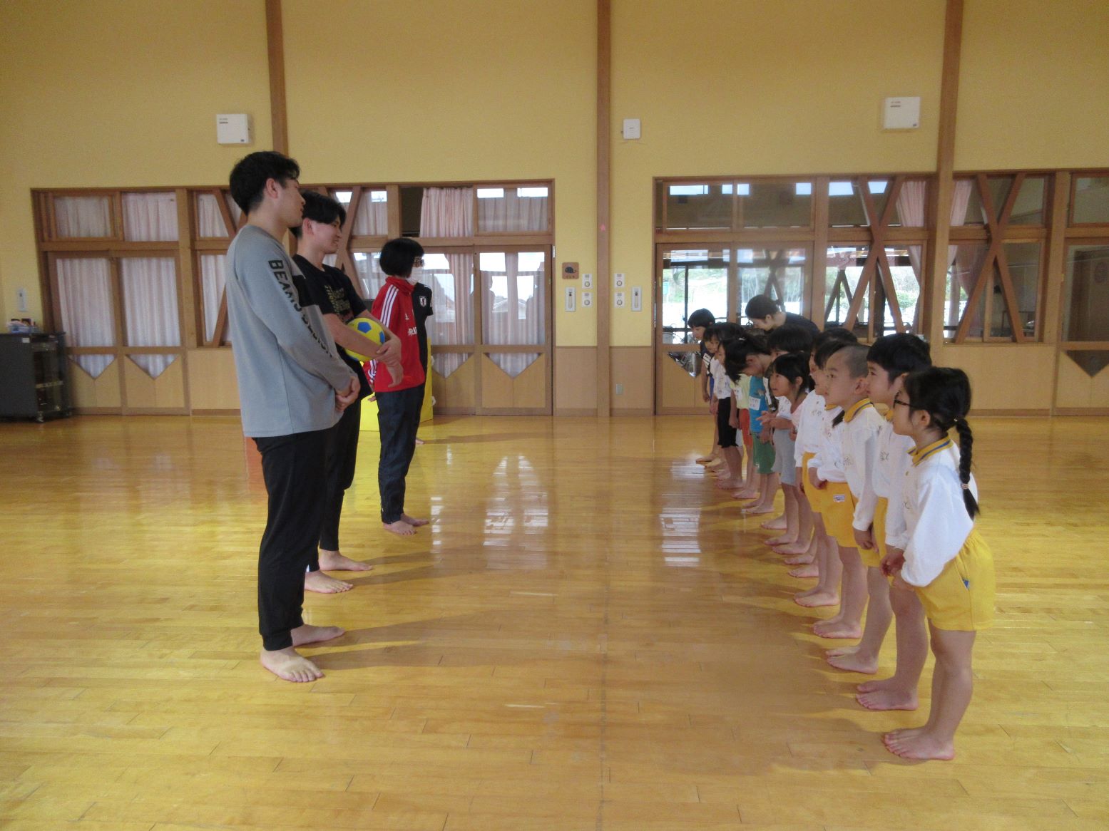 サッカー教室が始まる前に、くじら組の部屋で再会を喜び合いました。春夏頃の交流では緊張した表情が見られることもありましたが、今ではとても笑顔が増えました。