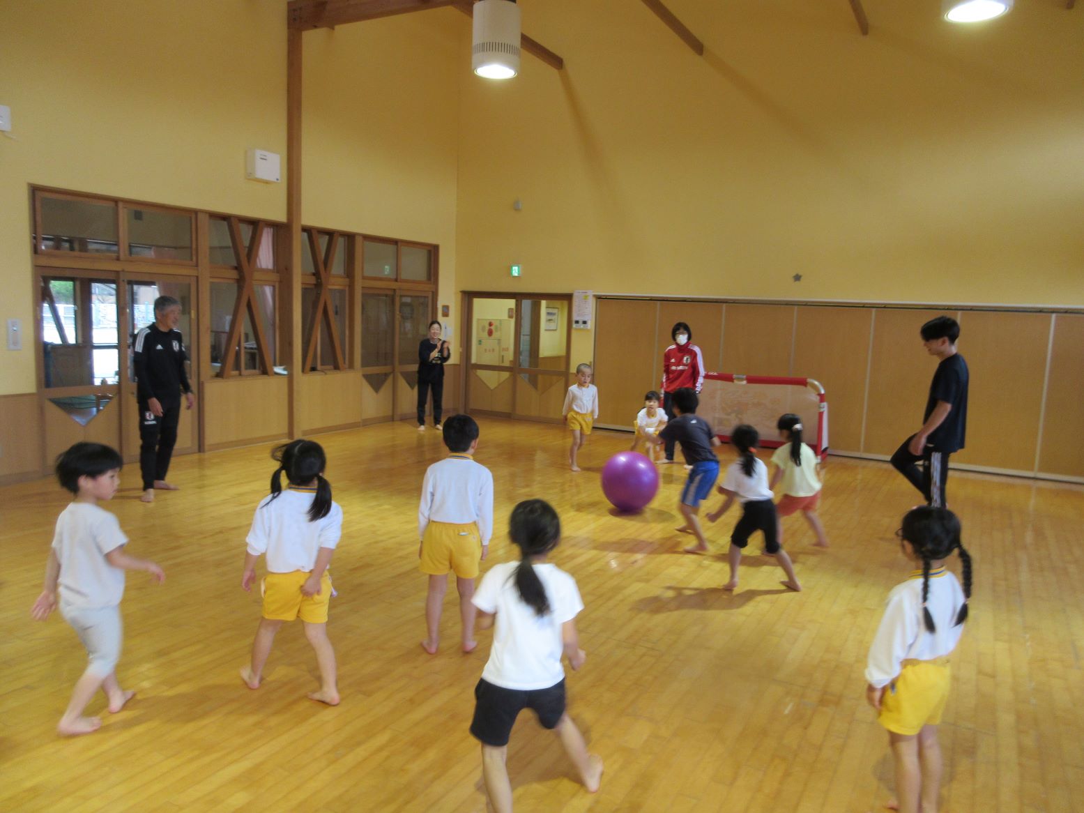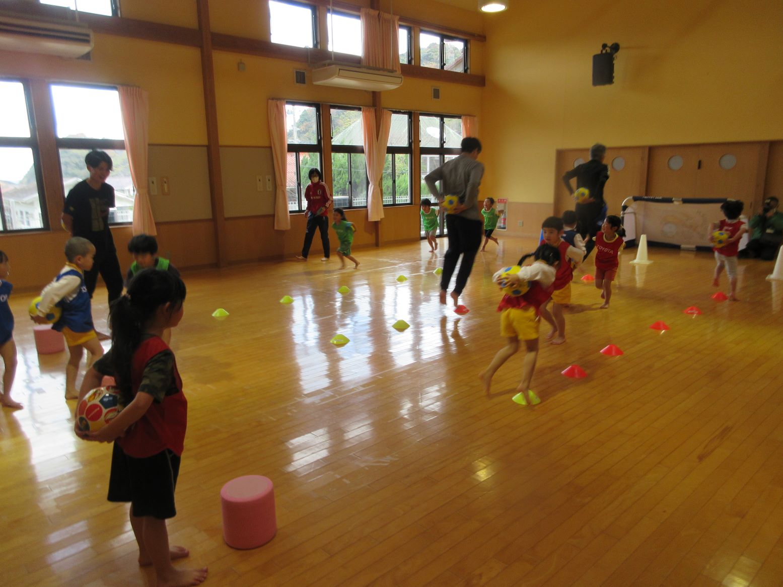 サッカー教室では、鬼ごっこや転がし大玉ドッチボールをしてボールに慣れるところから始まり、次にカラーコーンの間をボールをおんぶしジャンプで進んだり、ドリブルをしたりしました。最後に3チームに分かれて試合が行われました。この試合では、本気でゴールを守ったり果敢に攻め込んだりする姿が見られ、年長児の“たくましさ”を感じました。
