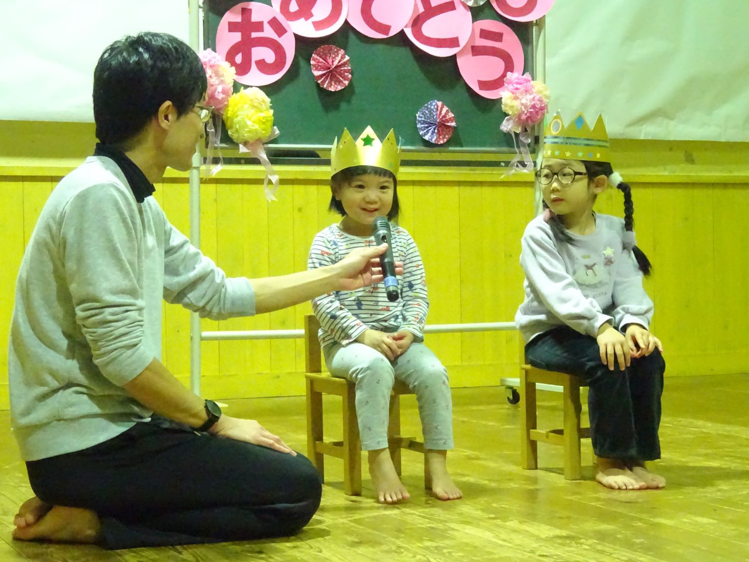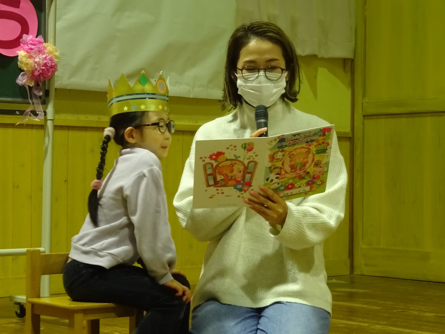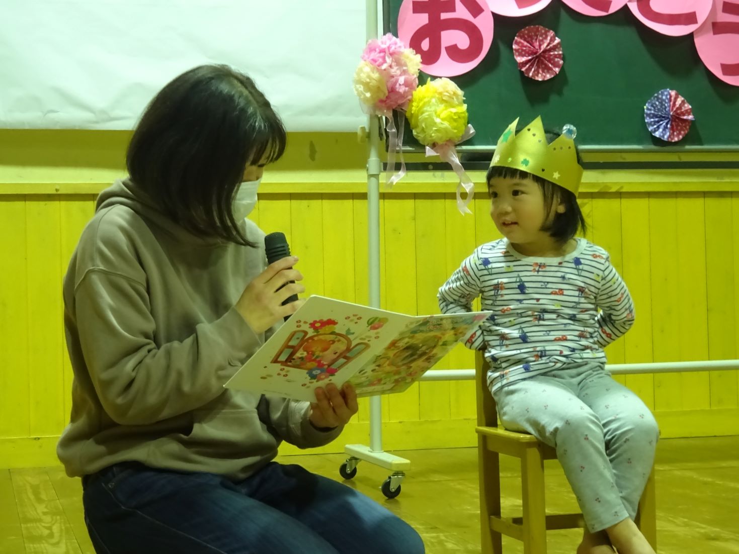 誕生児の自己紹介で『保育所で、好きな遊びは何ですか?』や『保育所の給食で、好きな食べ物は何ですか?』の質問に答えてくれました。大きなケーキと歌でお祝いした後は、保護者の方からメッセージをいただきました。我が子が生まれる時の様子や、我が子の名前の由来など“大切な思い出”“素敵な願い”などをお聴きしました。