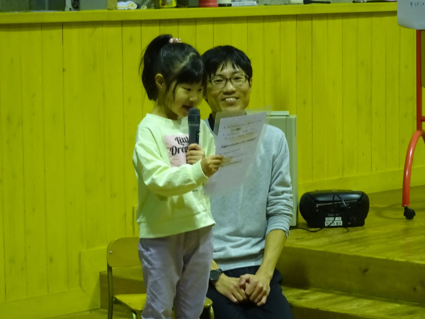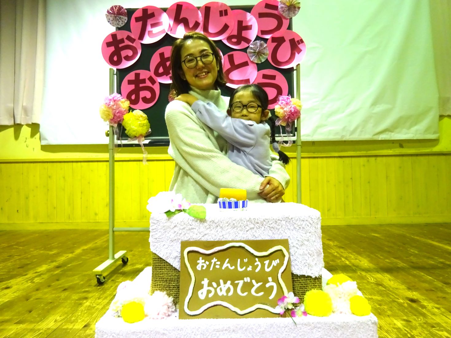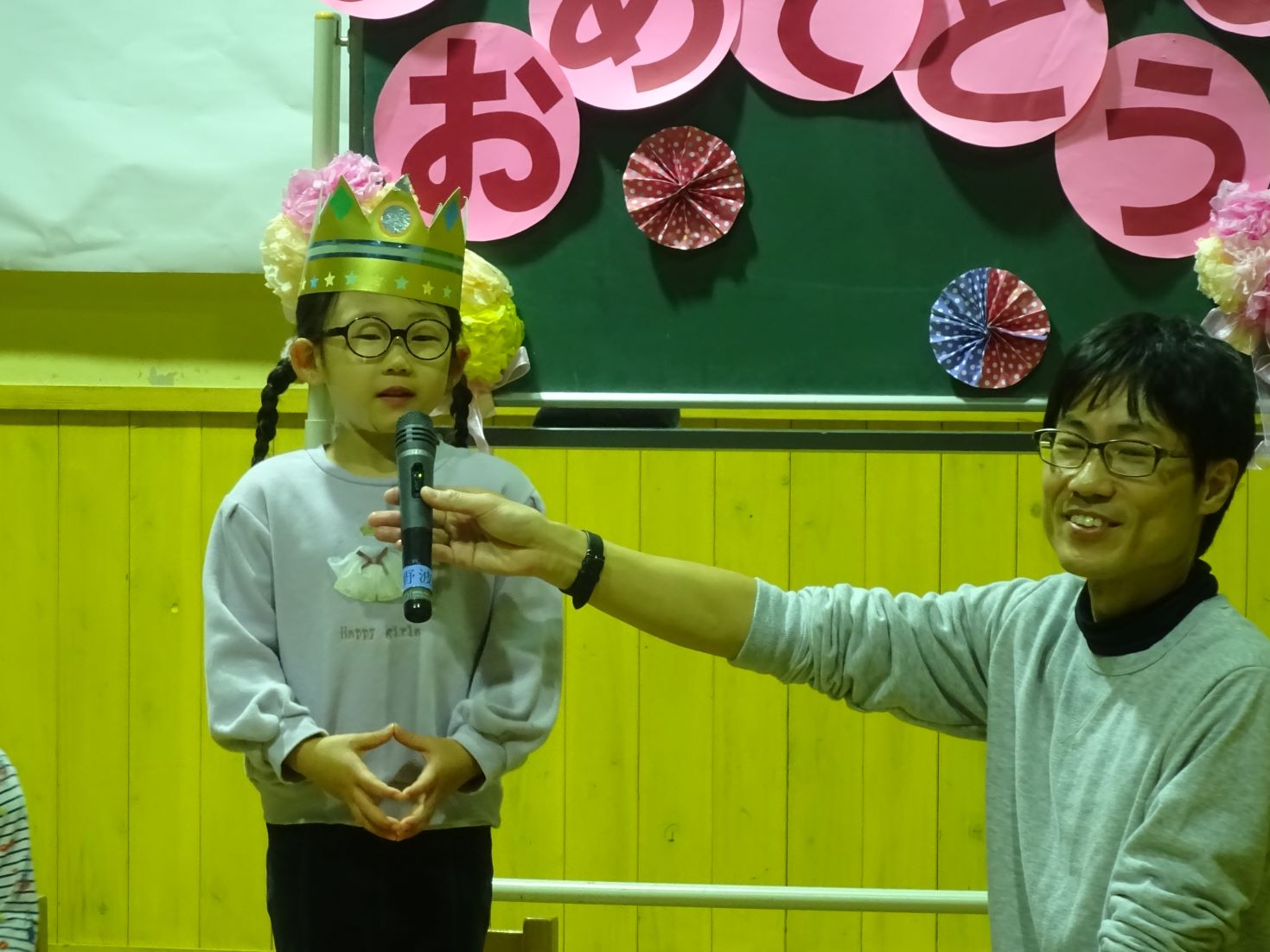 誕生児の自己紹介で『保育所で、好きな遊びは何ですか?』や『保育所の給食で、好きな食べ物は何ですか?』の質問に答えてくれました。大きなケーキと歌でお祝いした後は、保護者の方からメッセージをいただきました。我が子が生まれる時の様子や、我が子の名前の由来など“大切な思い出”“素敵な願い”などをお聴きしました。