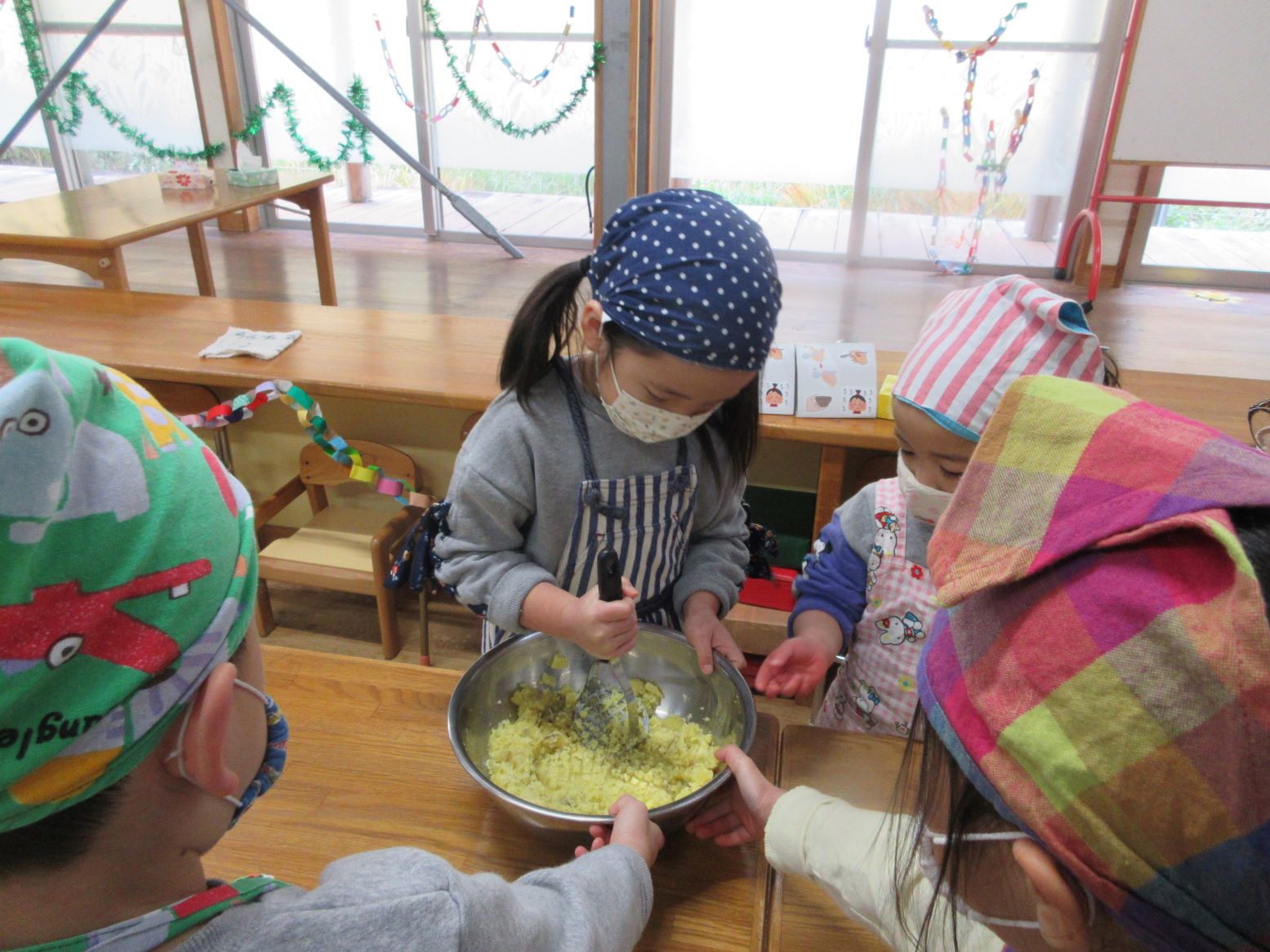 おいもを マッシャーでつぶしています