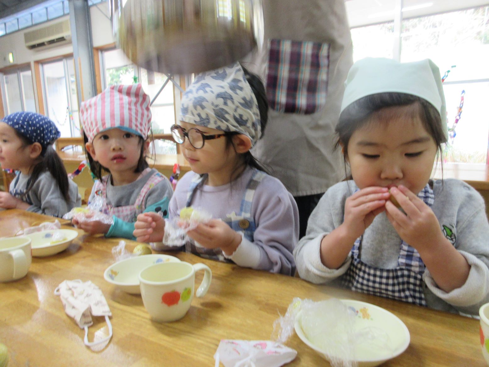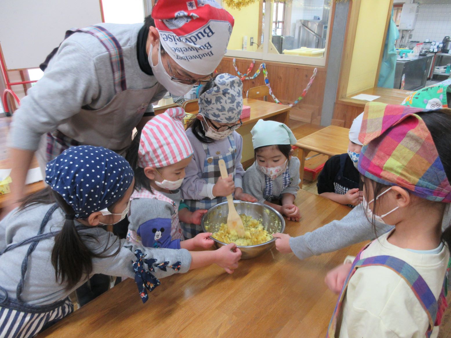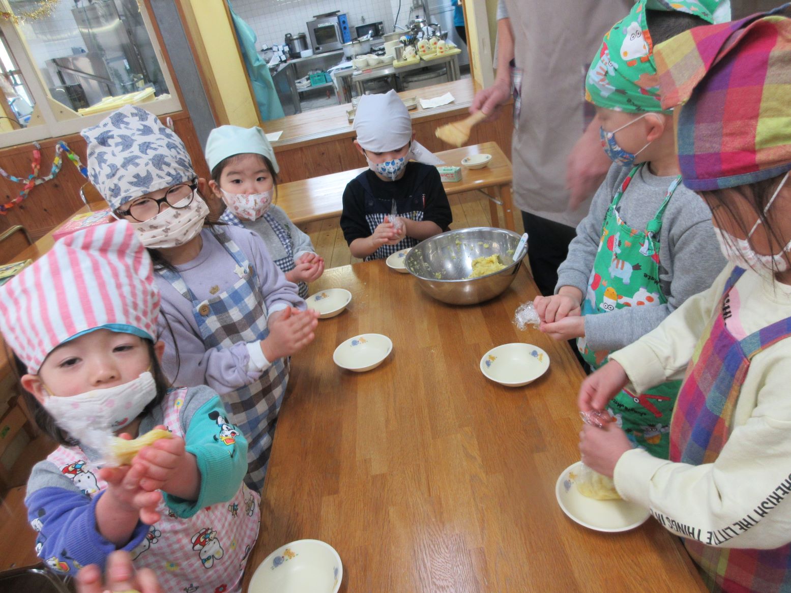 今回は保育所で収穫したさつまいもを利用して“茶巾絞り”を作りました。こども達に作れて、美味しく食べられるメニューとして紹介すると「たべた~い」と言って賛成してくれ、今回のメニューに決まりました。