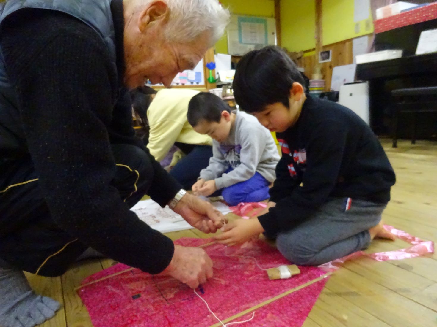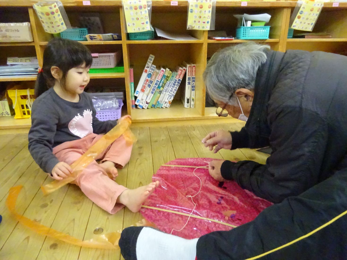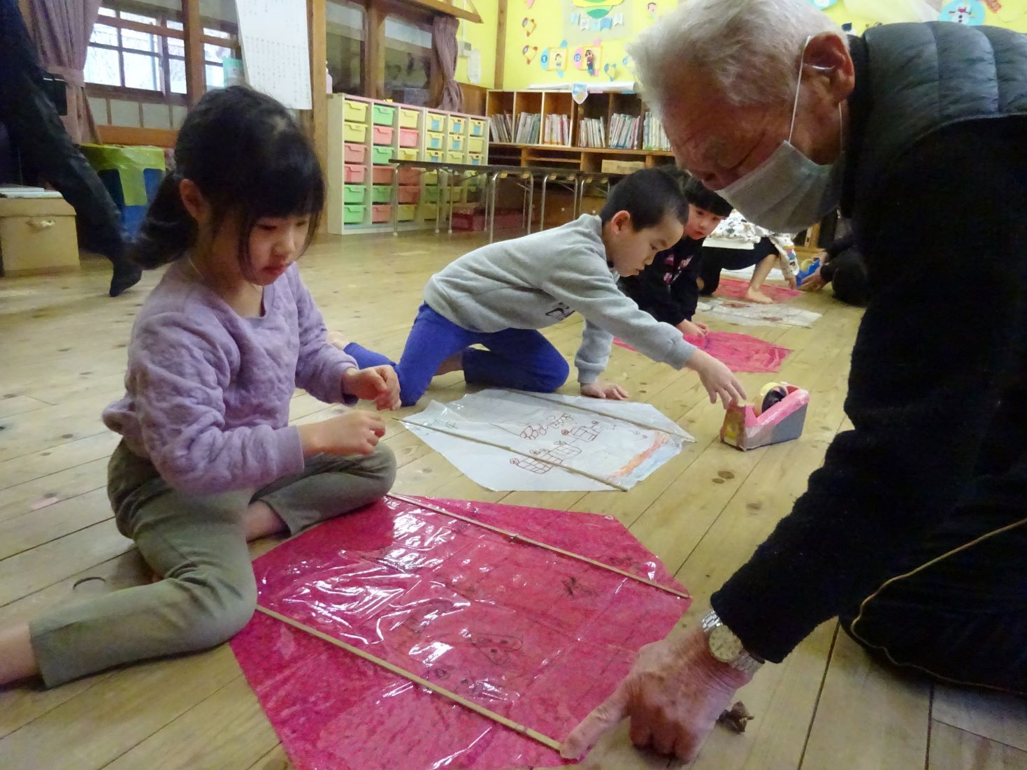 お正月と言えば、凧あげ!今日は、地域講師の幸泰おっちゃんと森田のおっちゃんに来て頂き、こども達に凧作りを教えてくださいました。こども達は地域講師のお二人から話を聞き、セロハンテープで竹ひごを付けたり、スズランテープの凧の足をつけたりしました。「竹ひごは、角と角を合わせて真っすぐに貼るんだよ!」とアドバイスを頂き、手を添えながら優しく手伝ってくださいました。