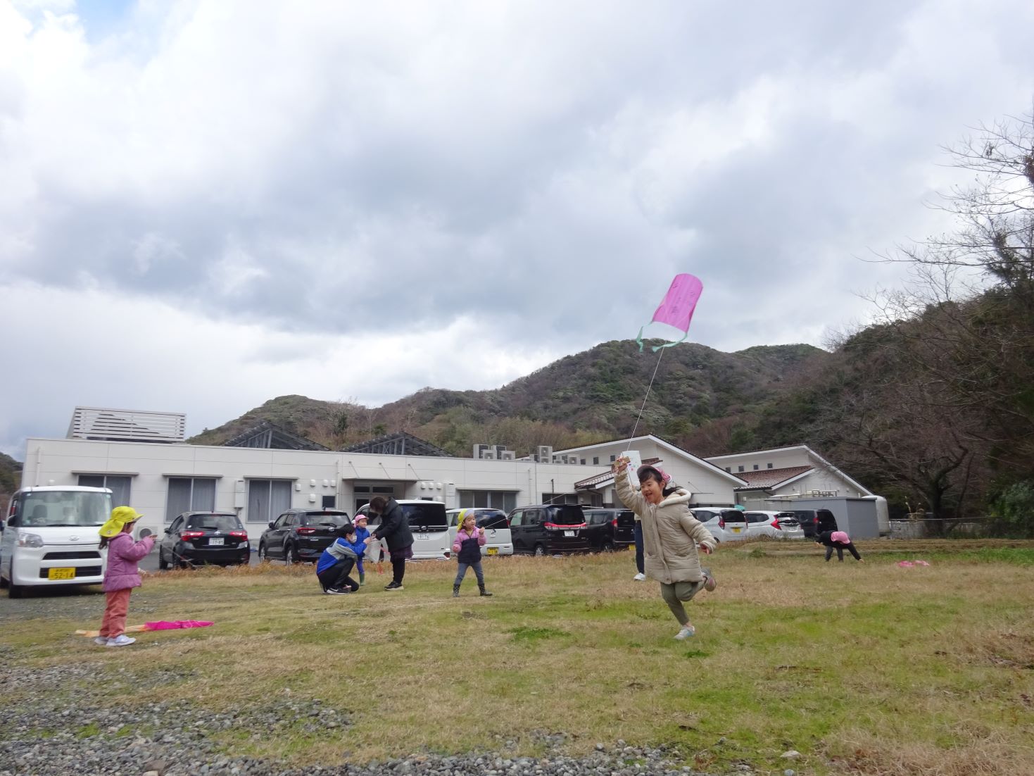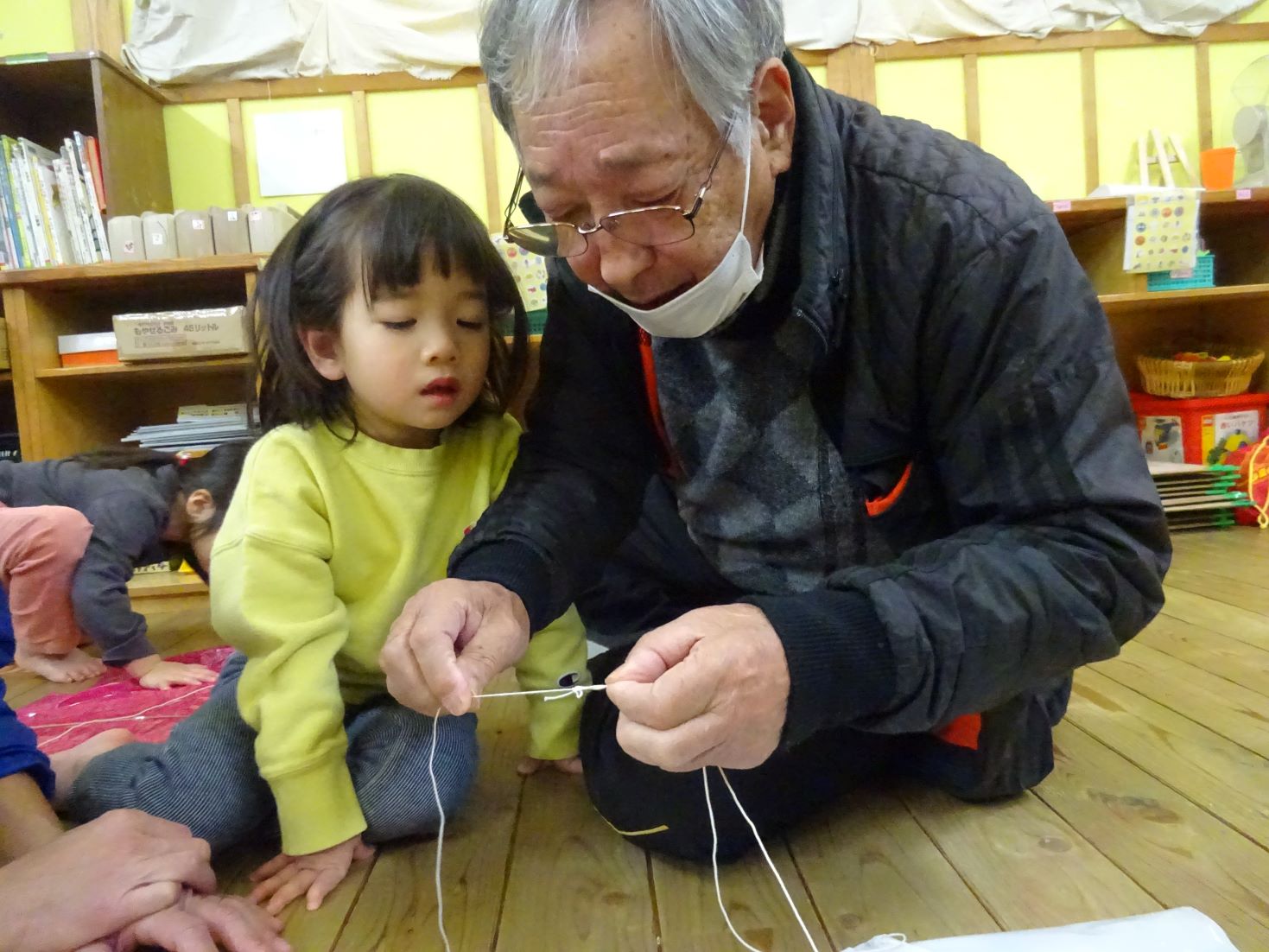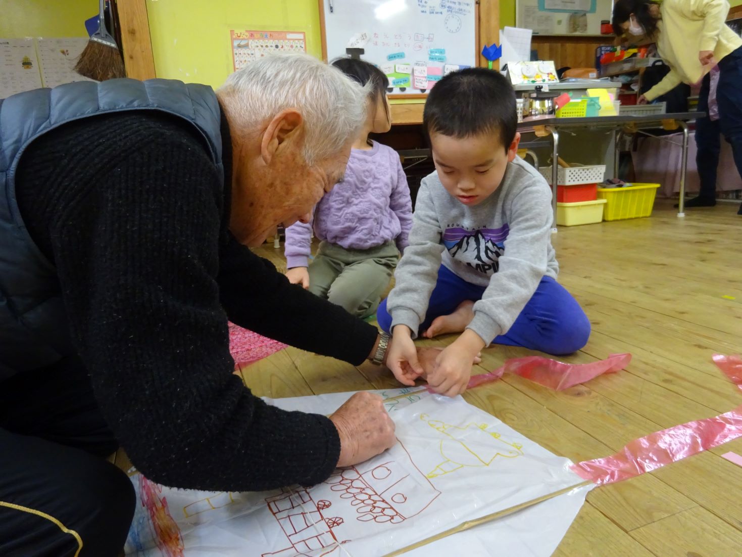 お正月と言えば、凧あげ!今日は、地域講師の幸泰おっちゃんと森田のおっちゃんに来て頂き、こども達に凧作りを教えてくださいました。こども達は地域講師のお二人から話を聞き、セロハンテープで竹ひごを付けたり、スズランテープの凧の足をつけたりしました。「竹ひごは、角と角を合わせて真っすぐに貼るんだよ!」とアドバイスを頂き、手を添えながら優しく手伝ってくださいました。