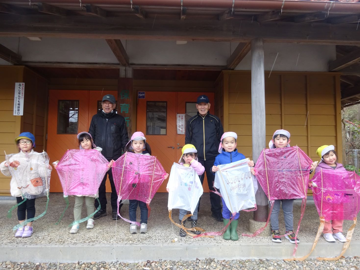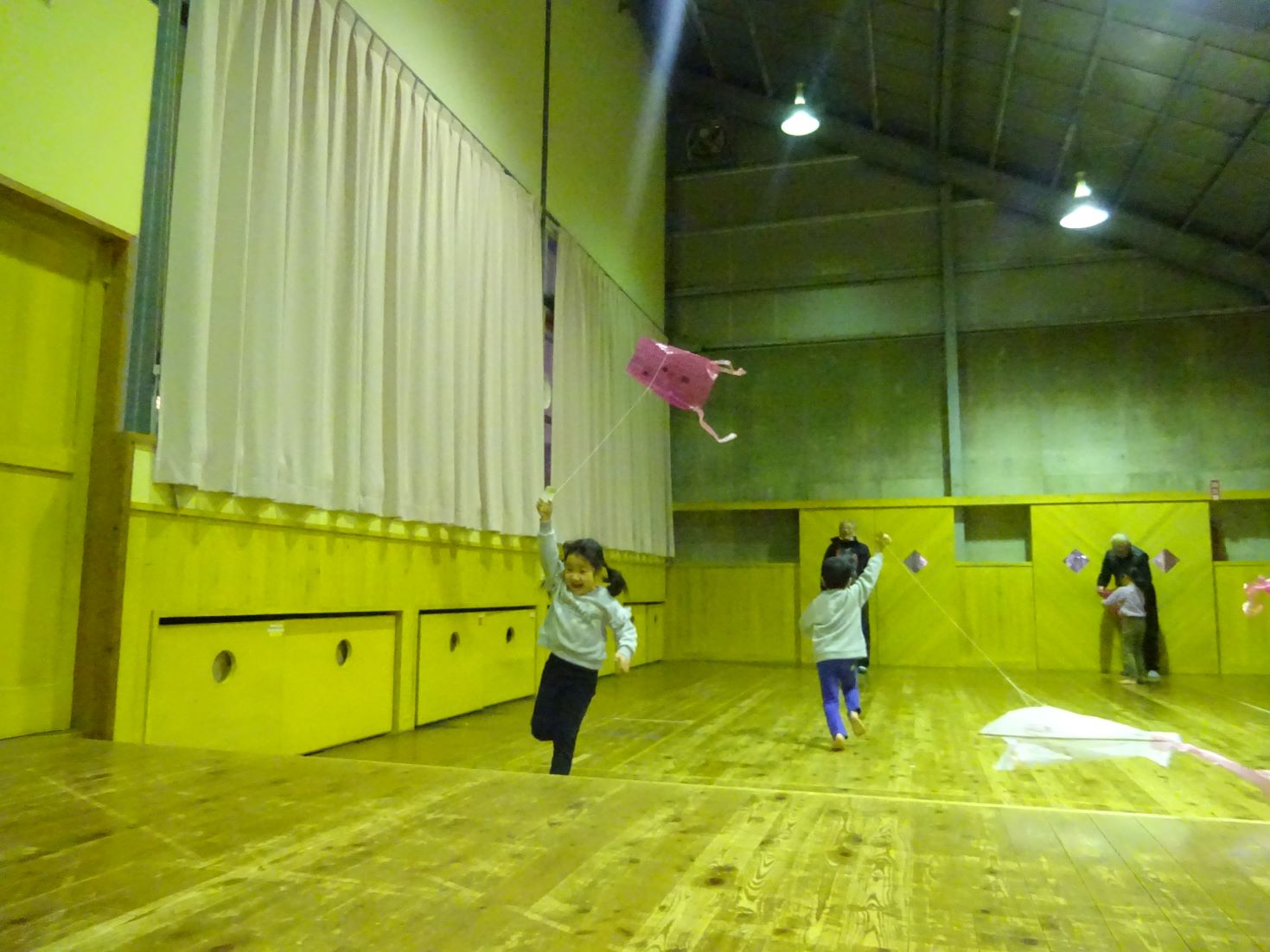 完成した凧の持ち運び方を教わり、いざ外へ!と、思ったら…雪がふぶきだし…遊戯室へ。凧あげの基本を教わり、慣れた頃に日差しが出てきました。もちろん、こども達は凧を持ち、元気に戸外へ出て思い切り凧あげの続きを楽しみました。