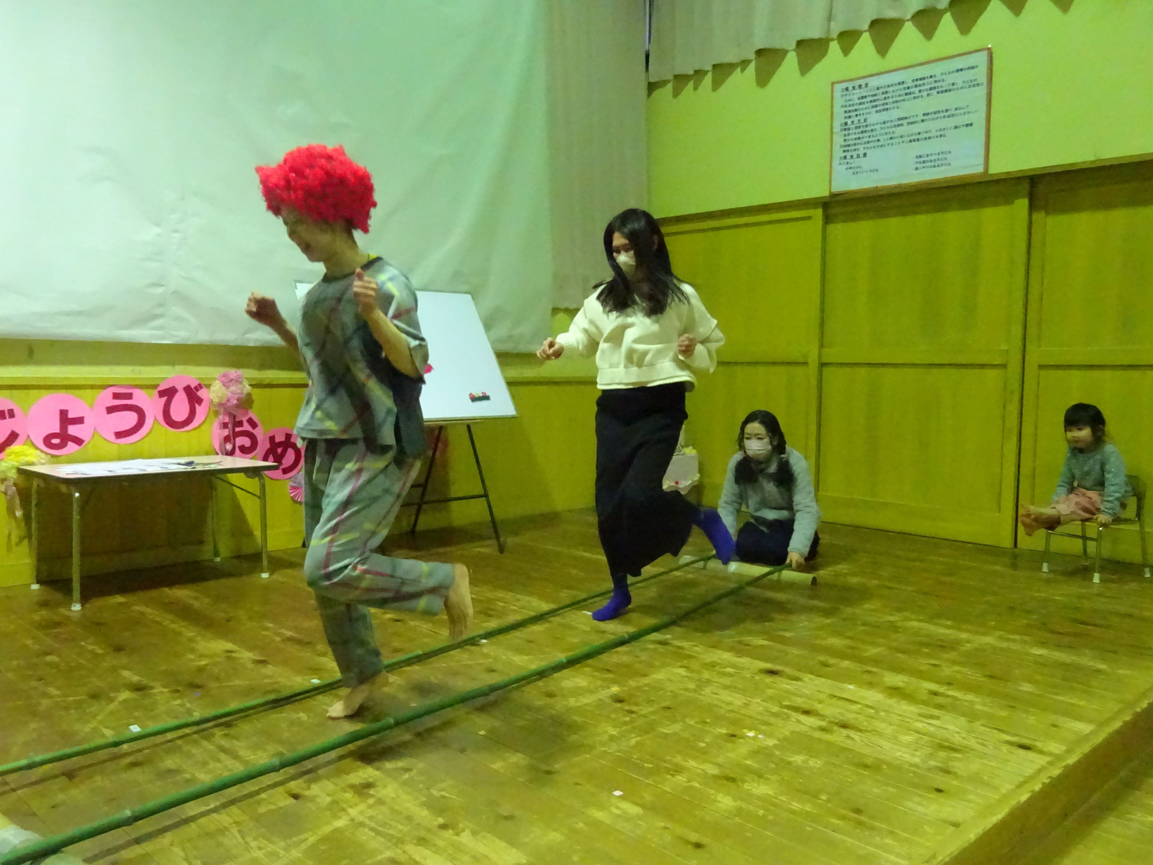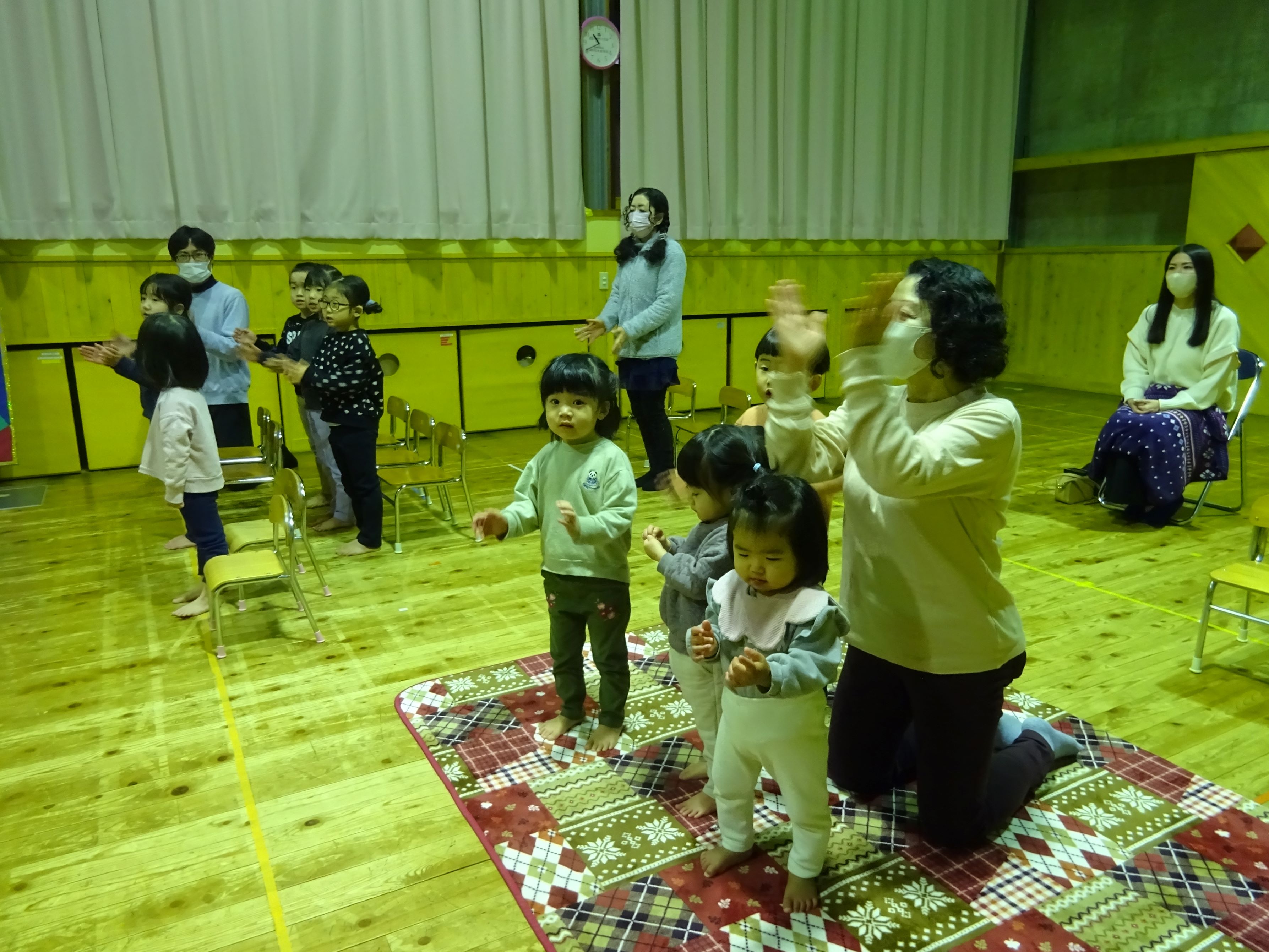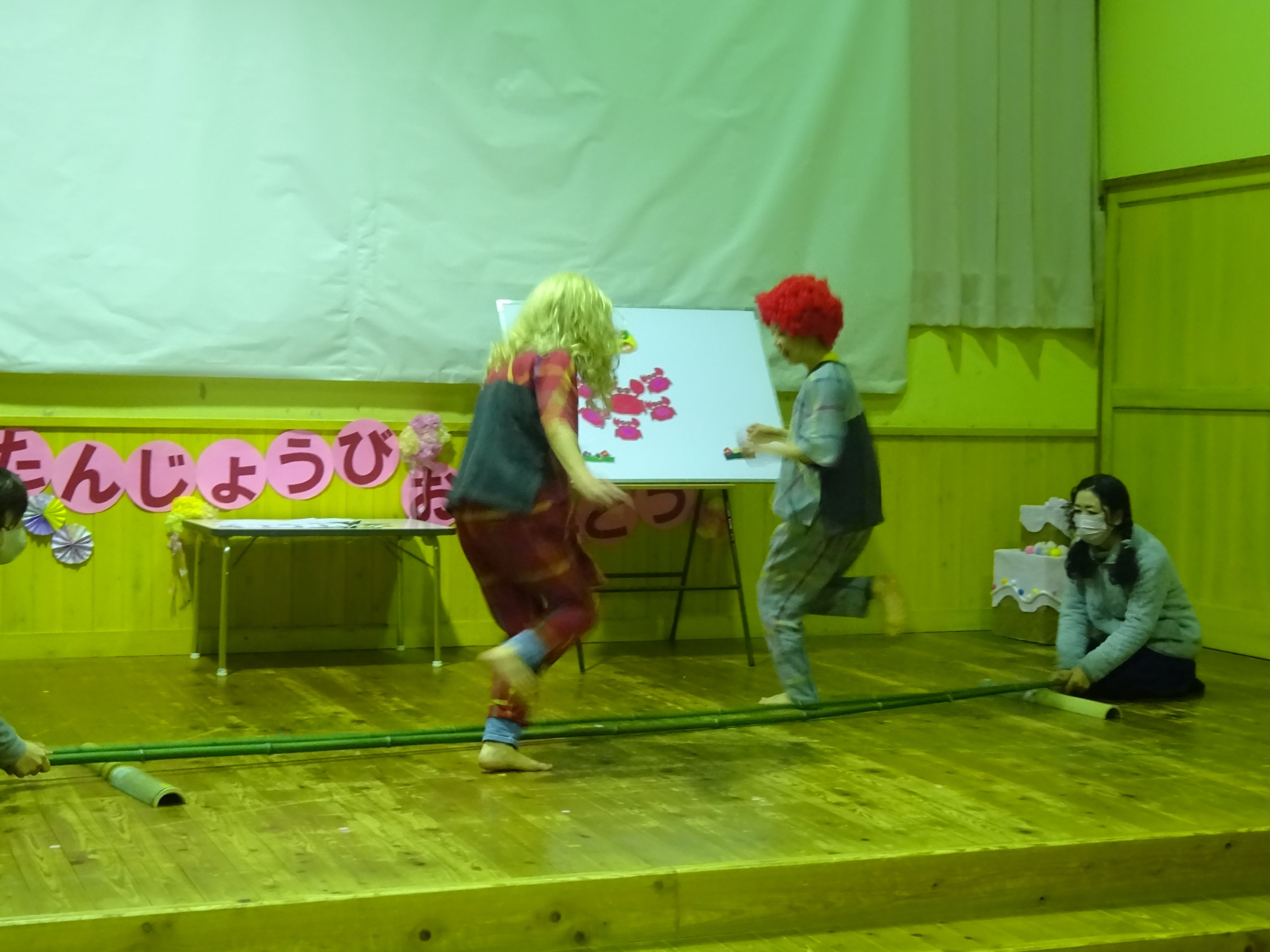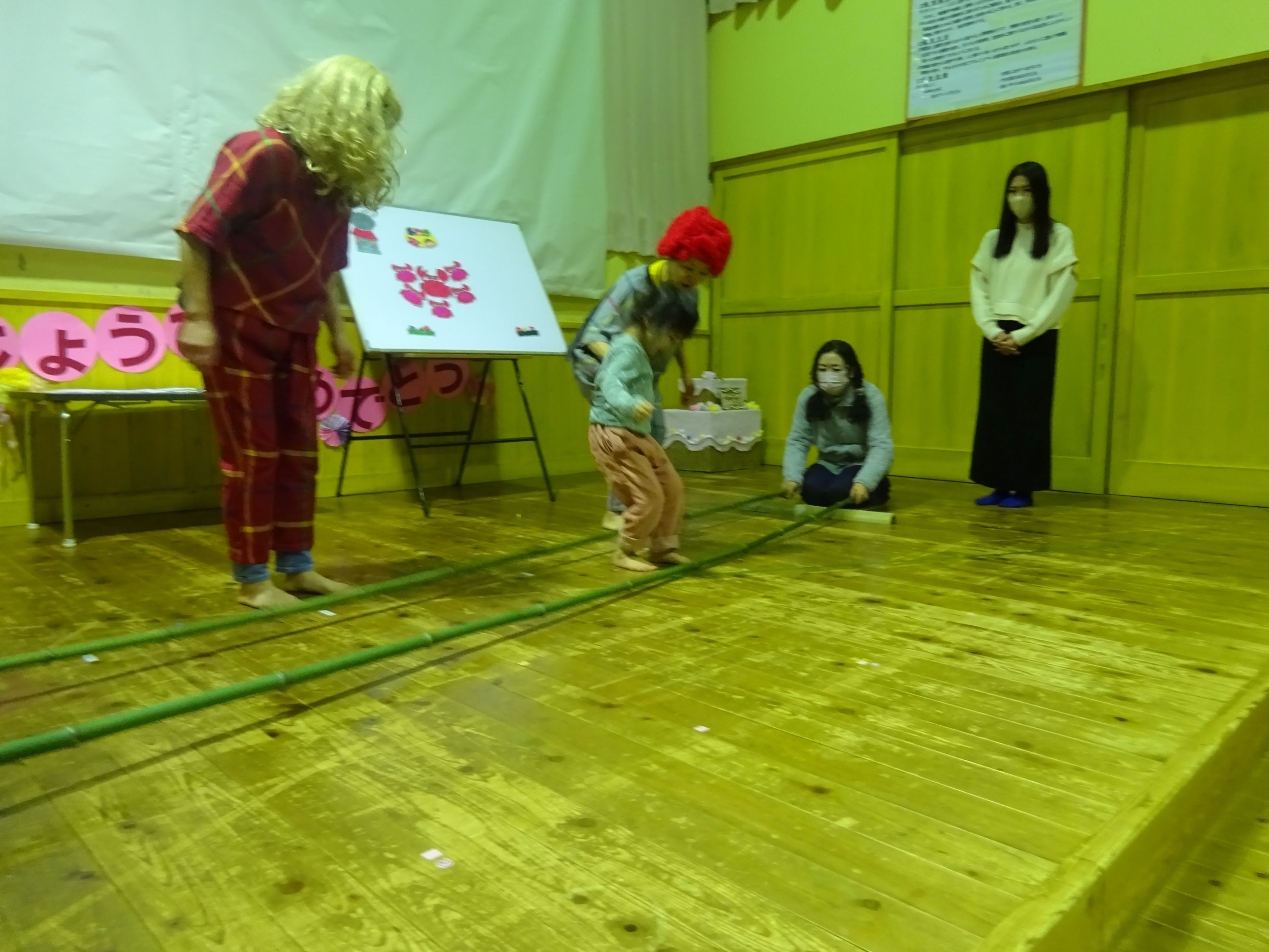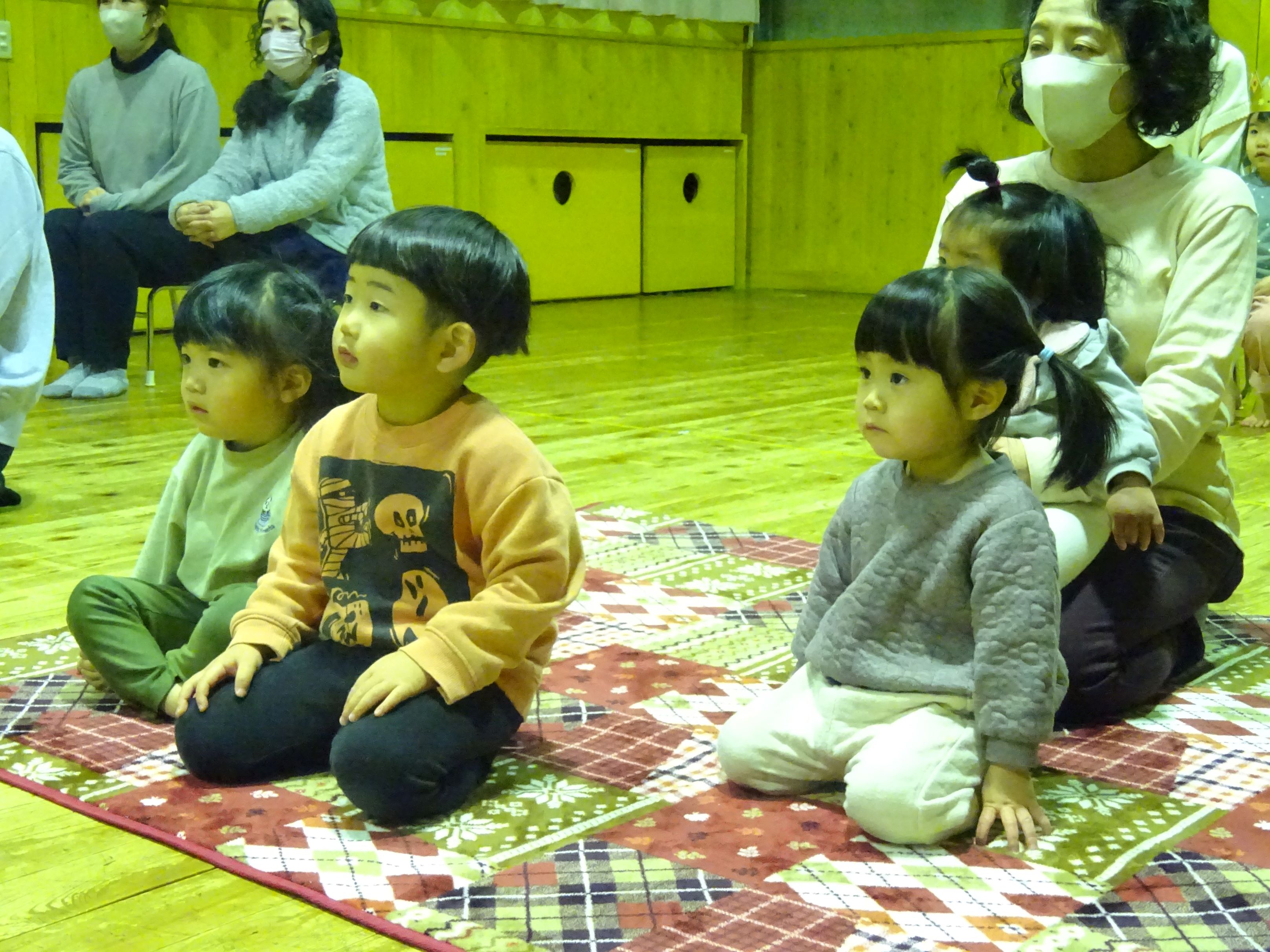 今年度,最後の誕生会でした。誕生児さんにとっては待ちに待った誕生会。みんなにお祝いしてもらって終始笑顔で、嬉しそうでした。お楽しみ会は、『さるとかに』のパネルシアターとバンブーダンスでした。見ている子ども達も物語に入り込み、真剣な表情になったり、時には声をあげて笑ったりしながら見ていました。バンブーダンスは誕生児さんとお母さんにも挑戦してもらい盛り上がりました。