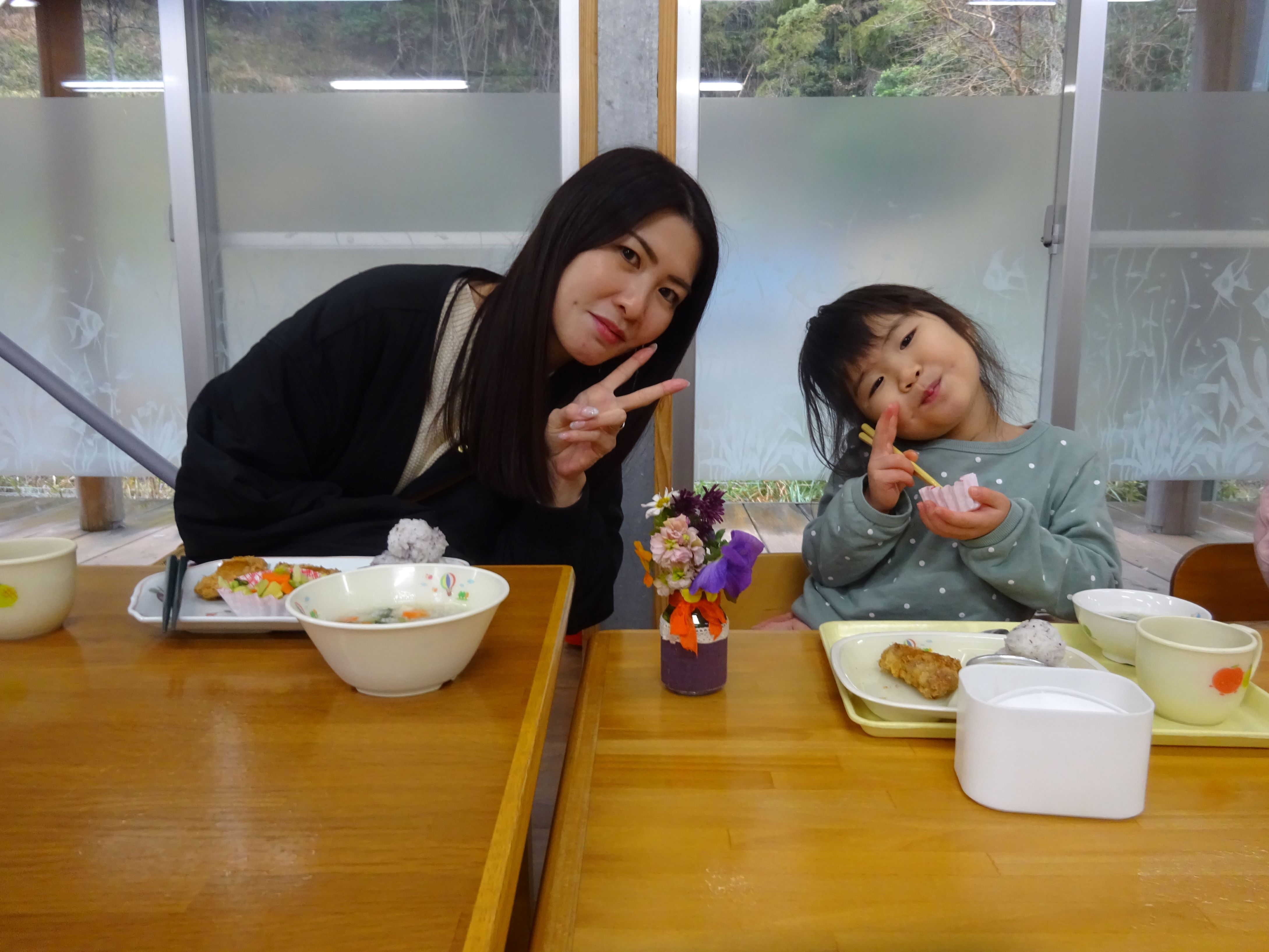 お母さんと一緒に給食を食べて、にこにこ顔でした