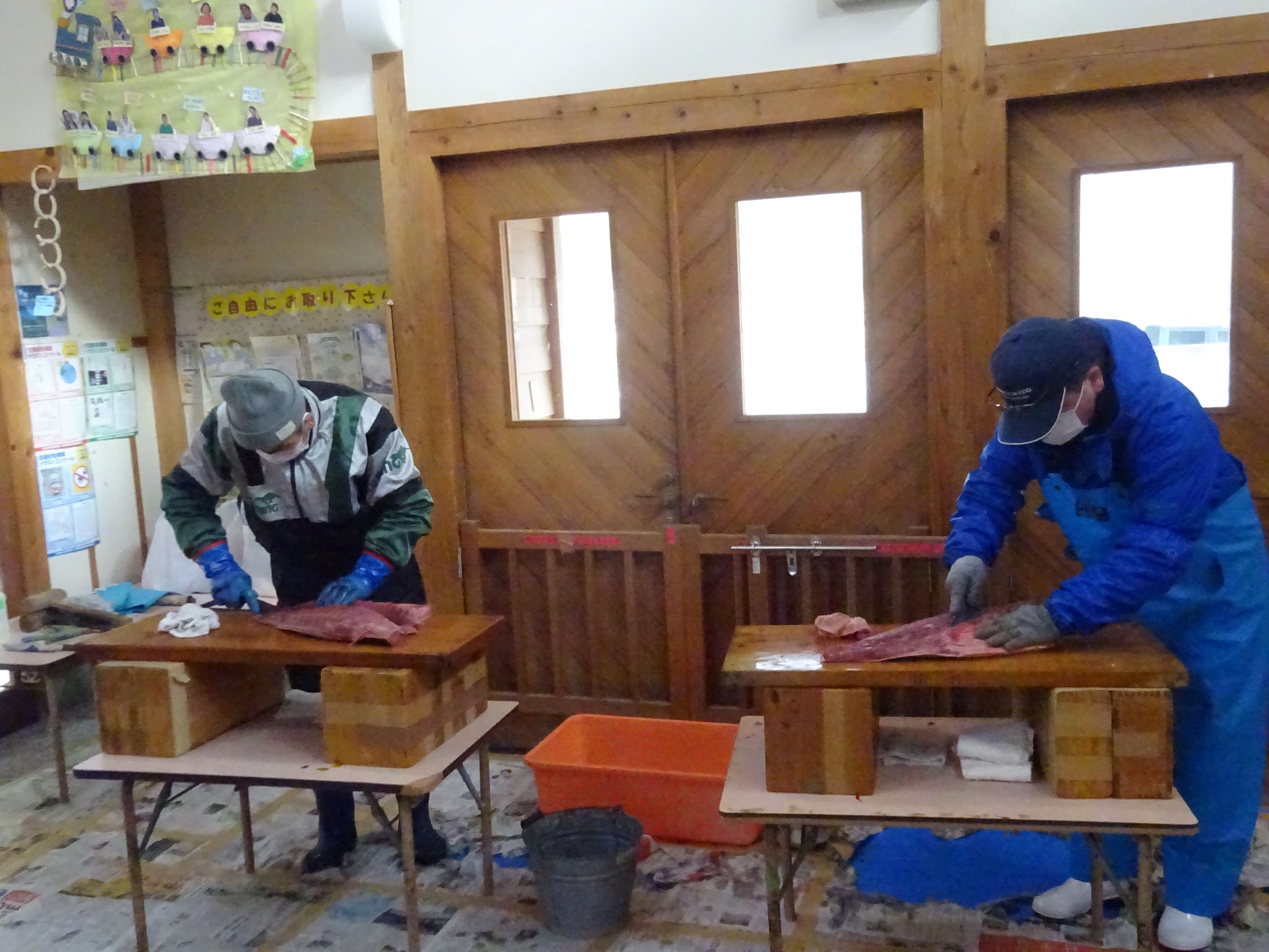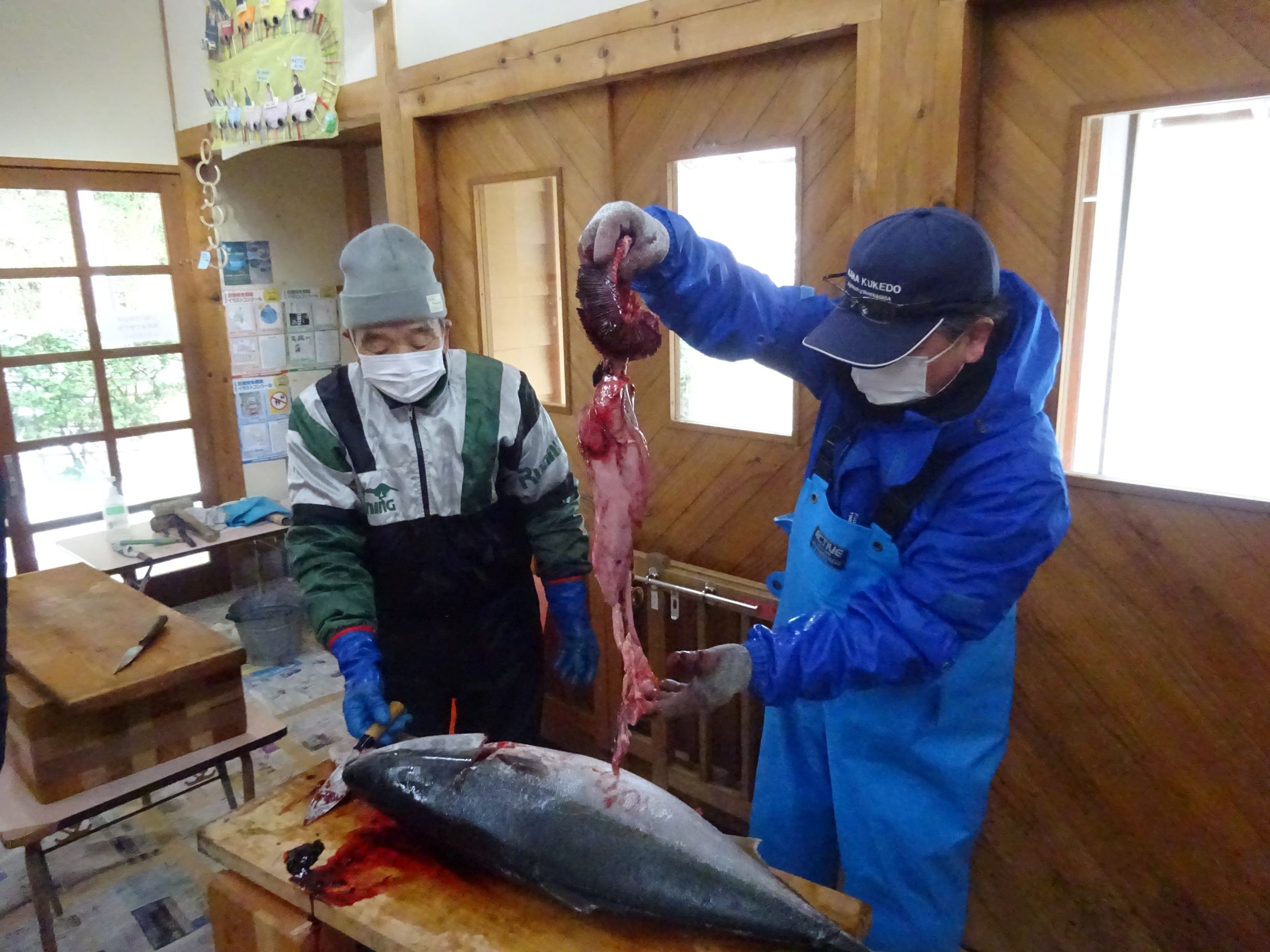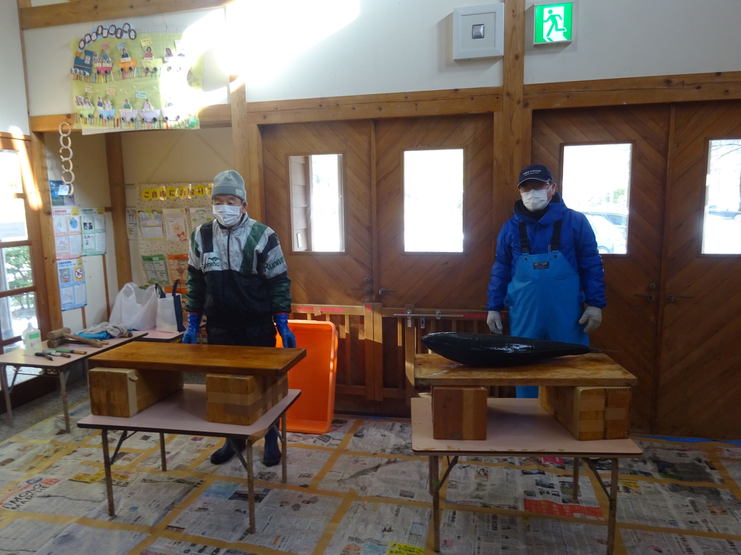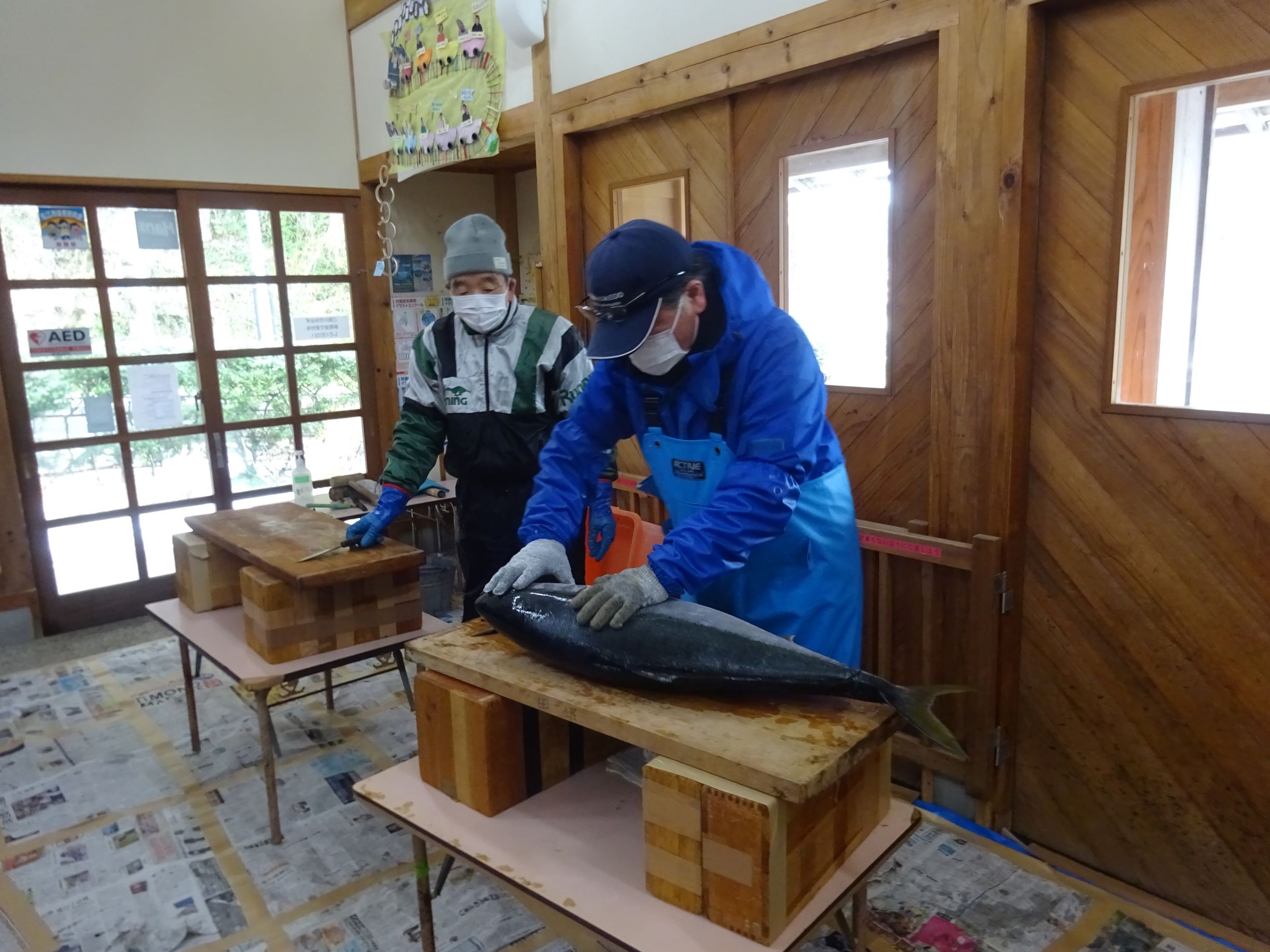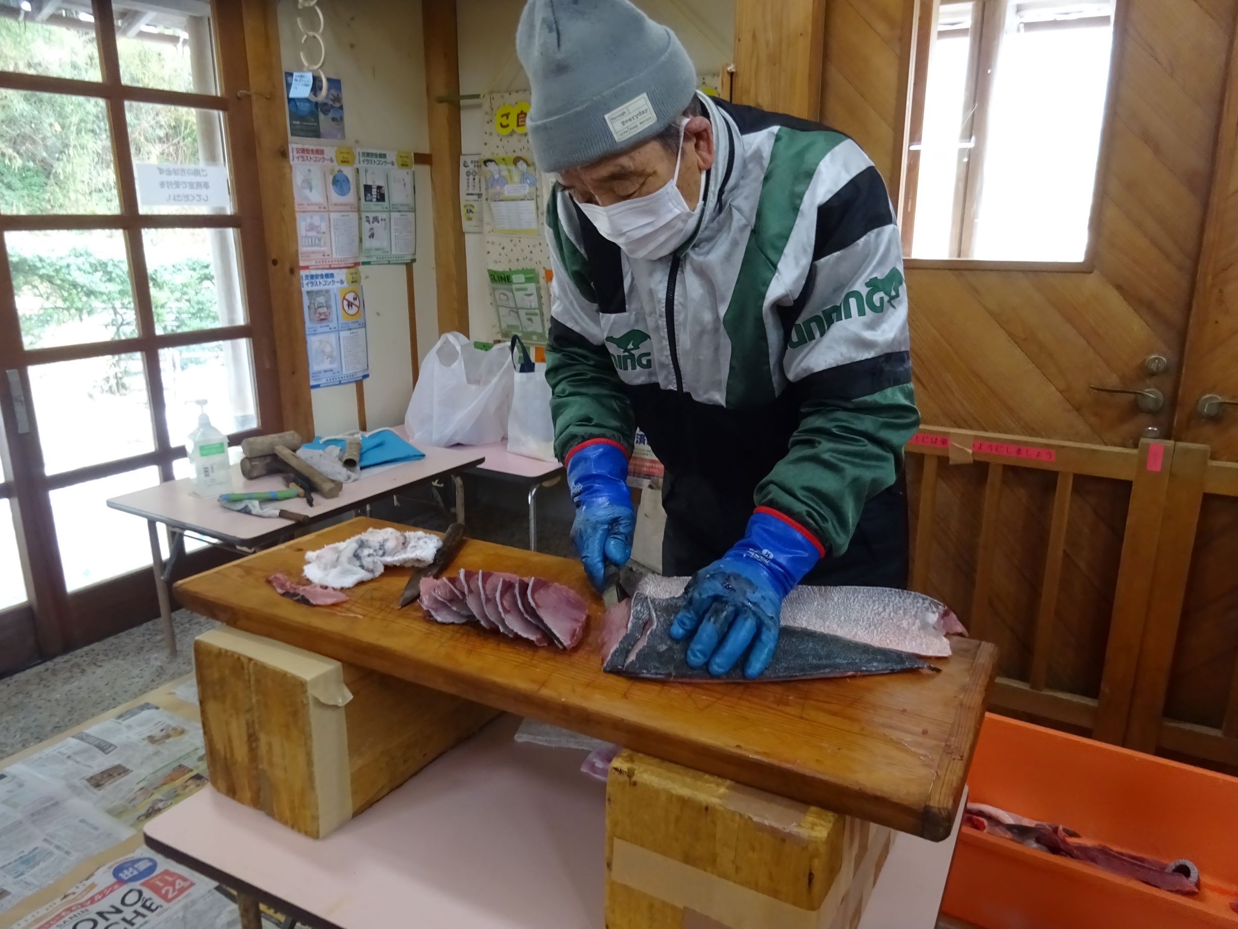 地域講師の福島達さん、速人さん親子に来て頂きブリの解体を行いました。年々ブリが獲れる量が減ってきて昨年度は行うことができず、今年もできるかなと心配していましたが、JFしまね島根支所さんから天然の大きなブリが届きました。なんと量ったら11㎏もありました。