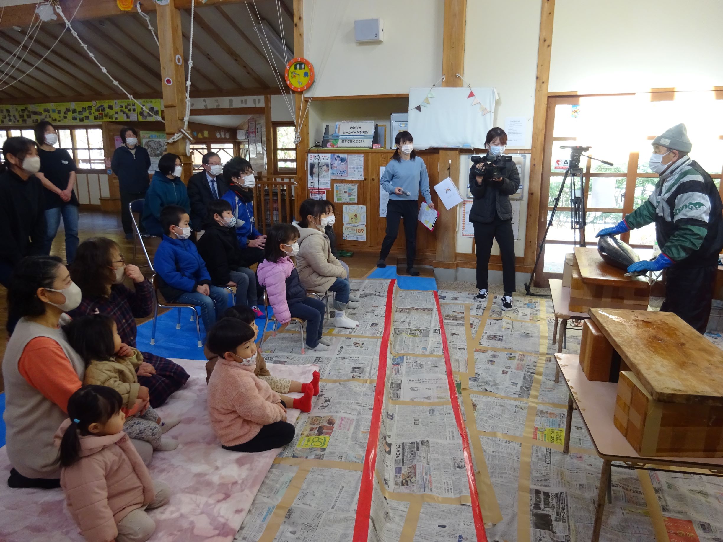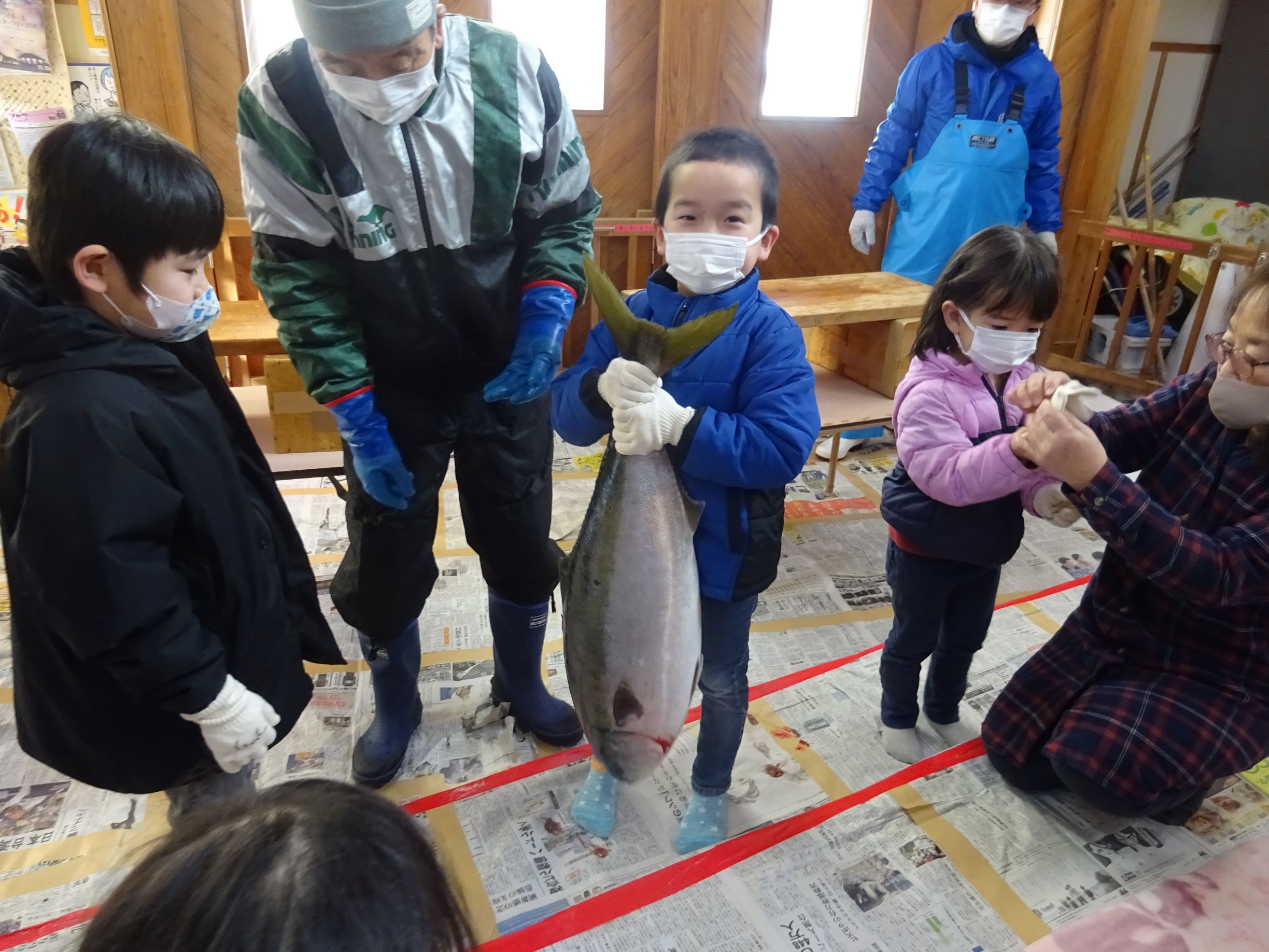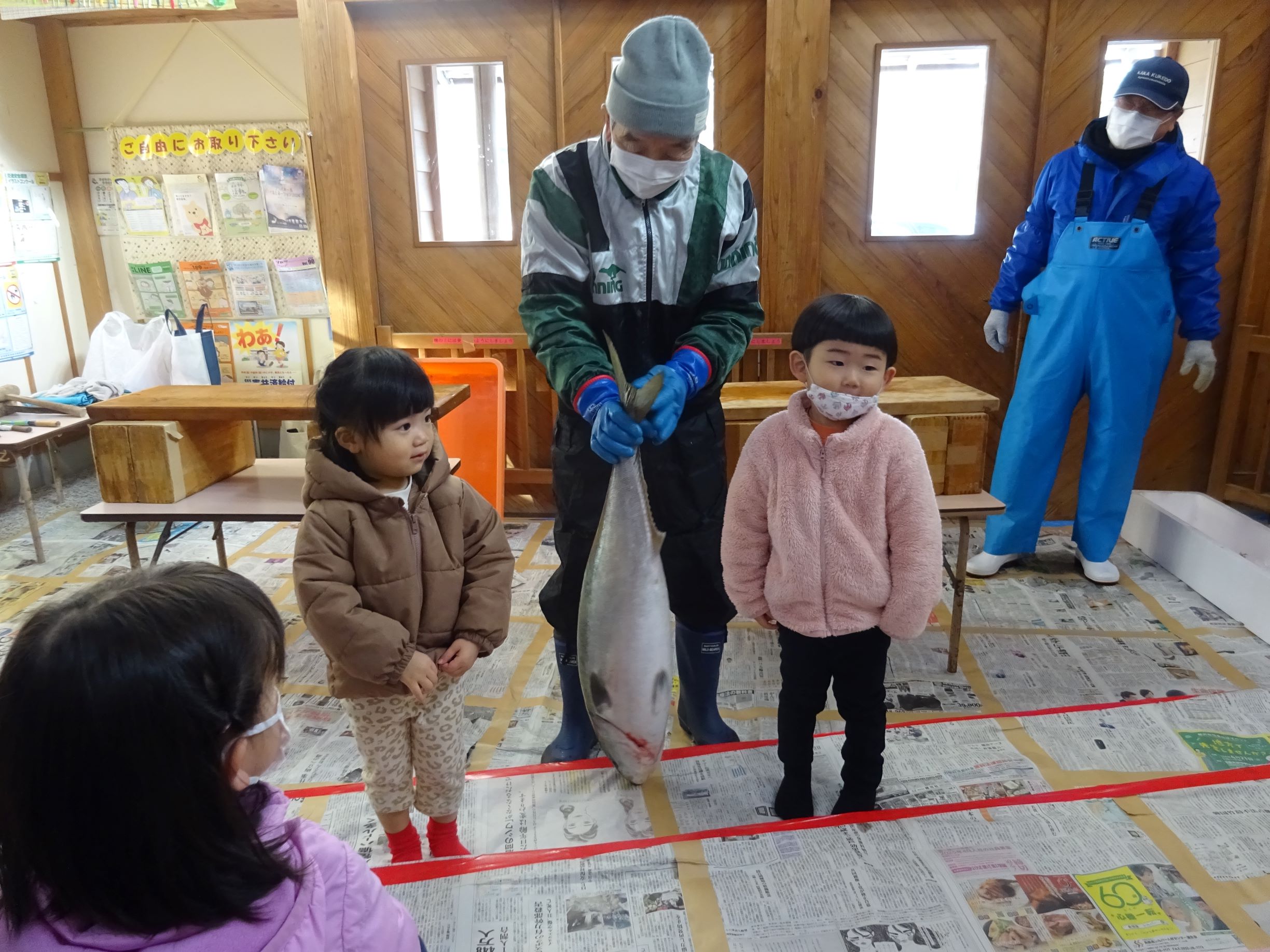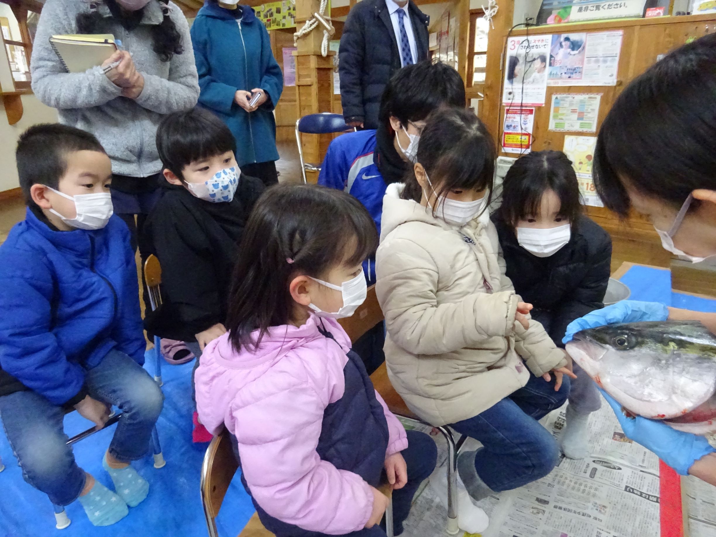地域講師さんの巧みな包丁さばきで大きなブリが解体されるところを見て、「ほねがみえた」「おさしみでたべたいな」「(ブリの頭を見て)おみせでみたことあるー」という声が聞かれました。アラやエラ、内臓を見せてもらったり、子ども達の「緑と黄色のところはどこですか?(どこの部分か)」の質問にも丁寧に答えて下さいました。