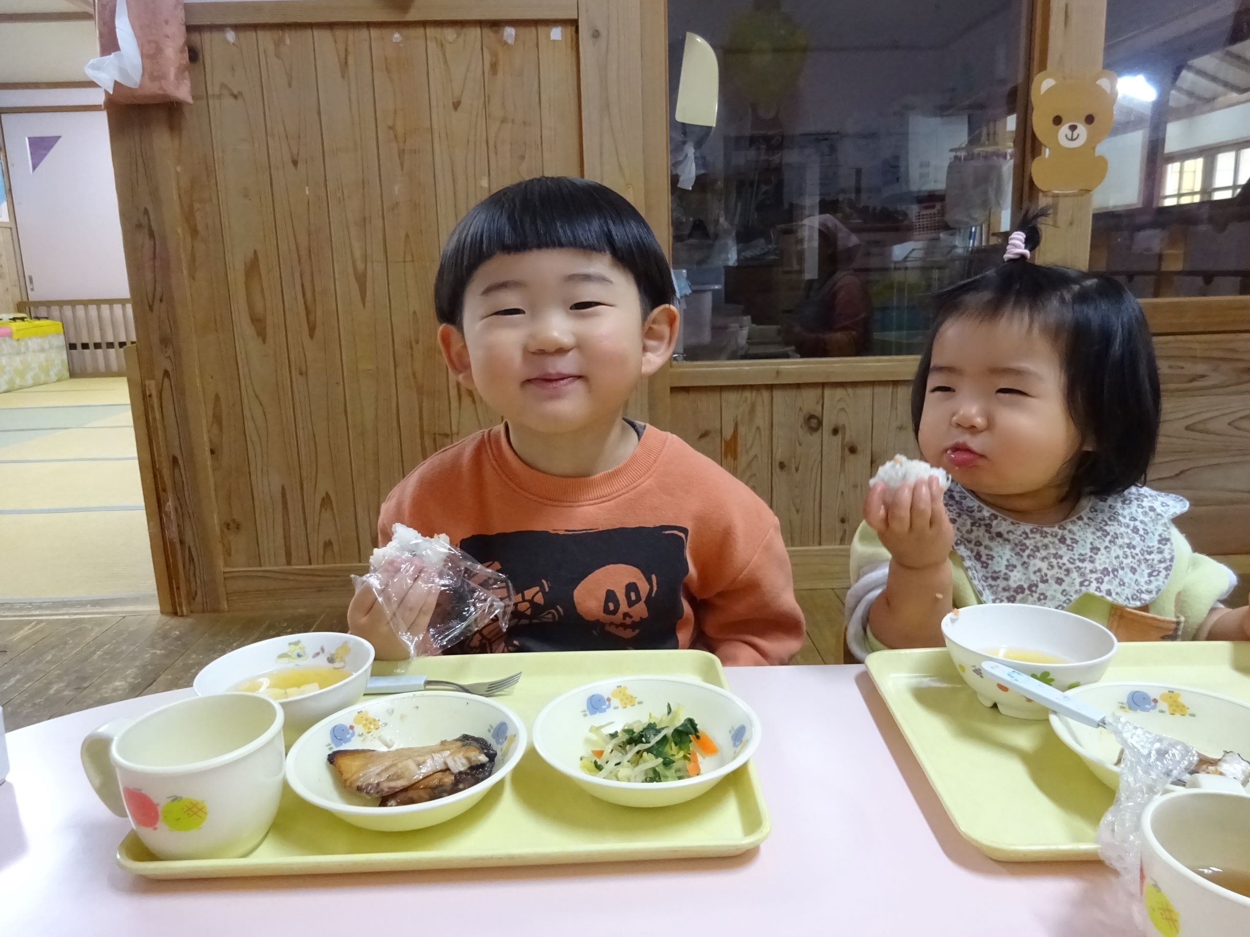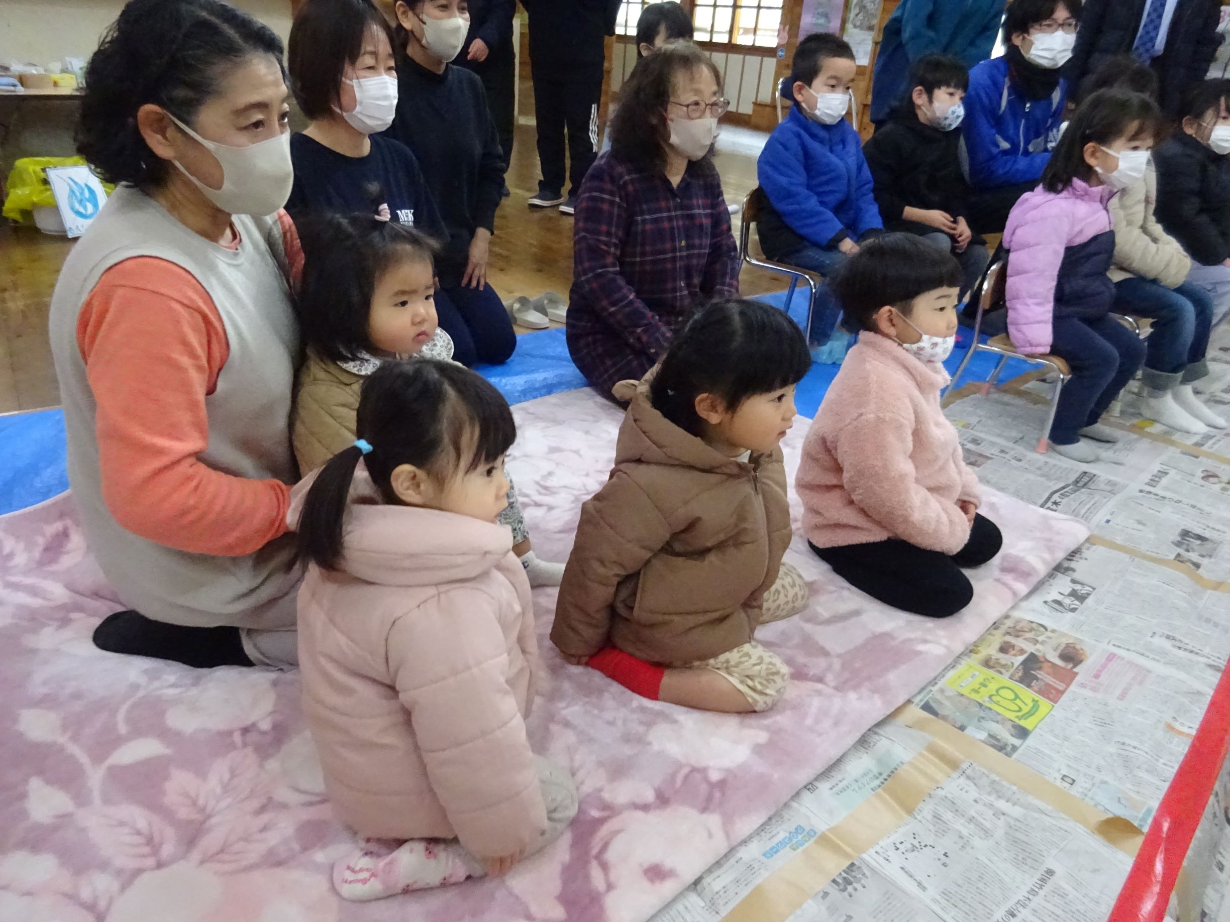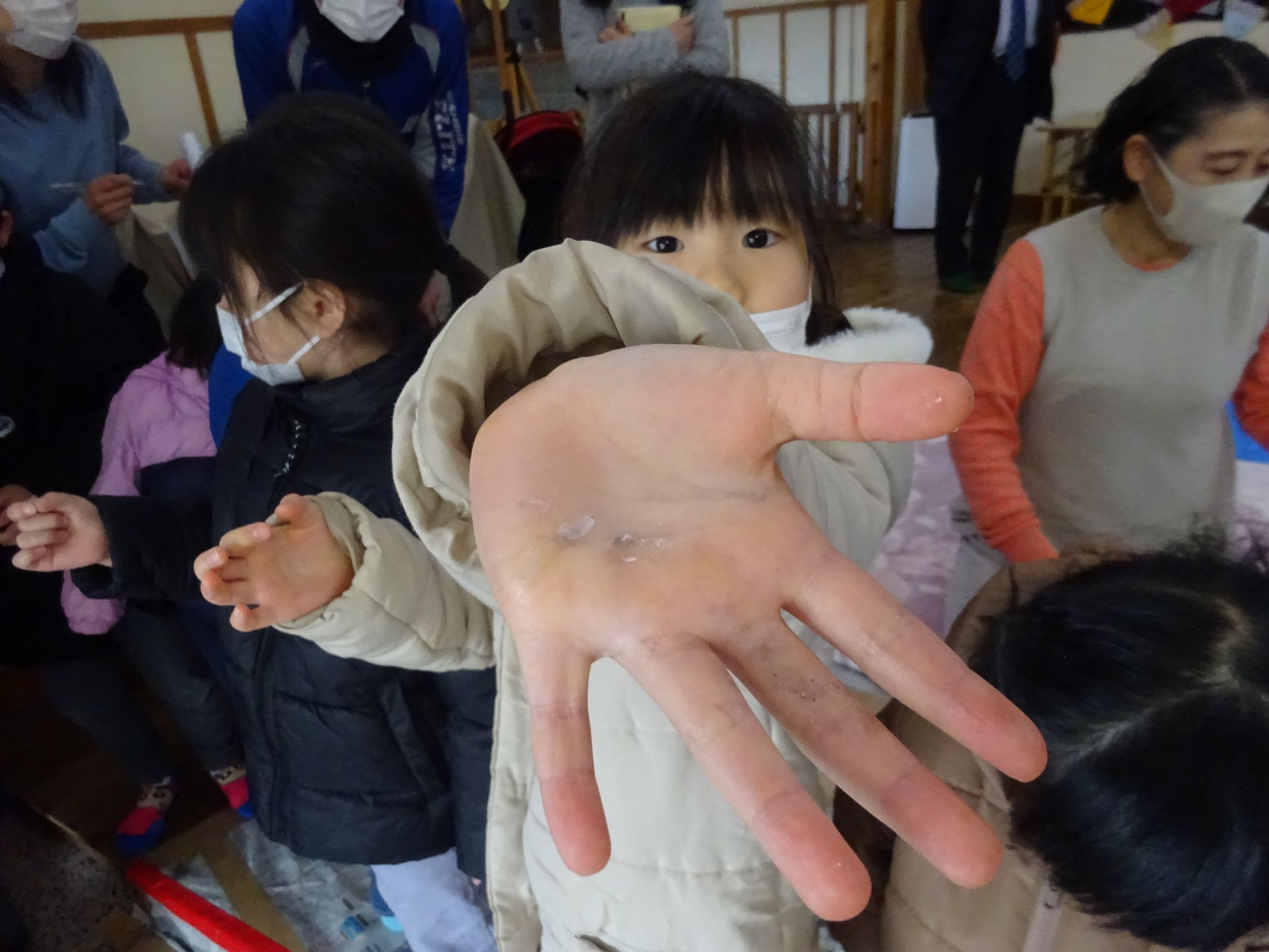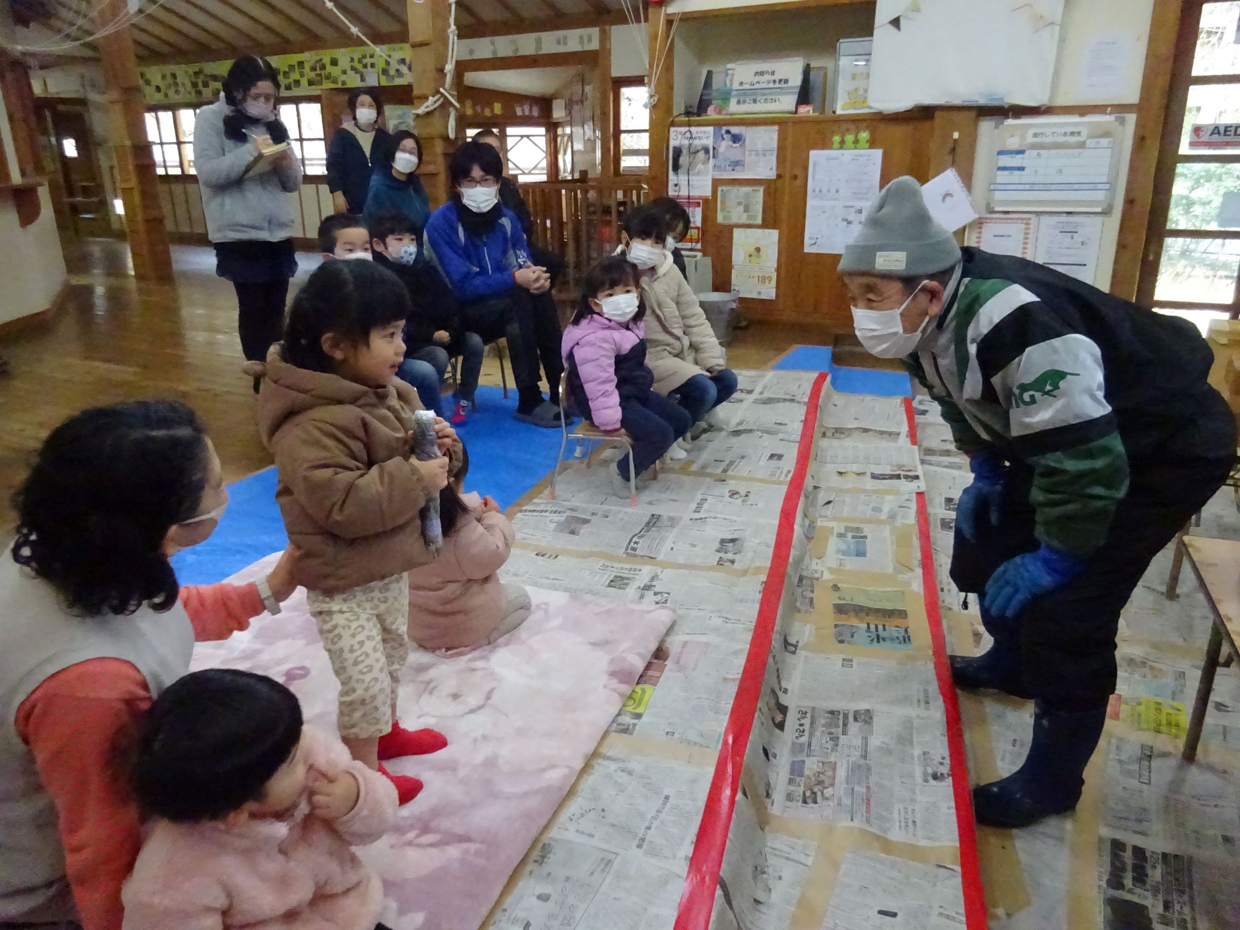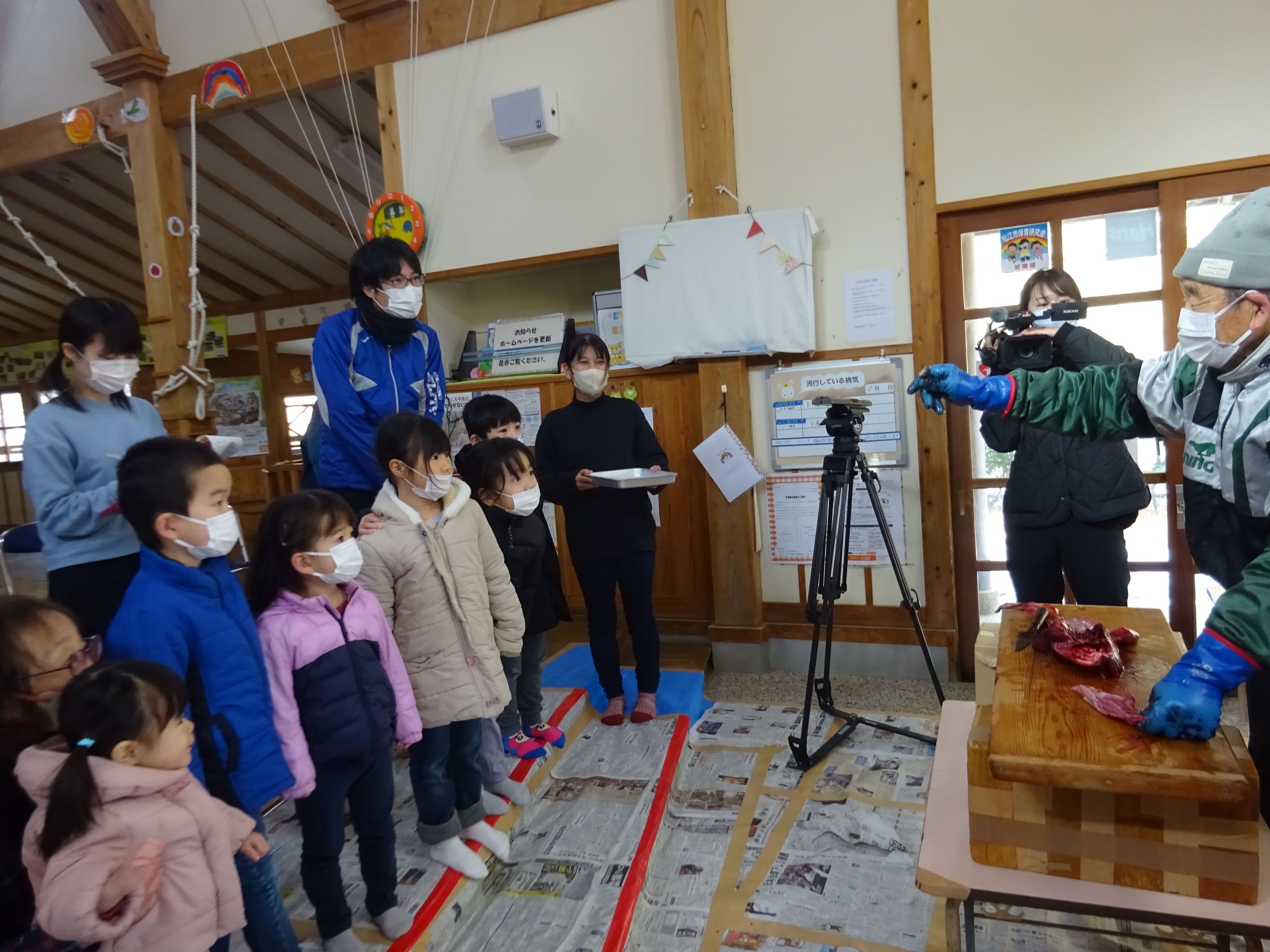 地域講師さんの巧みな包丁さばきで大きなブリが解体されるところを見て、「ほねがみえた」「おさしみでたべたいな」「(ブリの頭を見て)おみせでみたことあるー」という声が聞かれました。アラやエラ、内臓を見せてもらったり、子ども達の「緑と黄色のところはどこですか?(どこの部分か)」の質問にも丁寧に答えて下さいました。