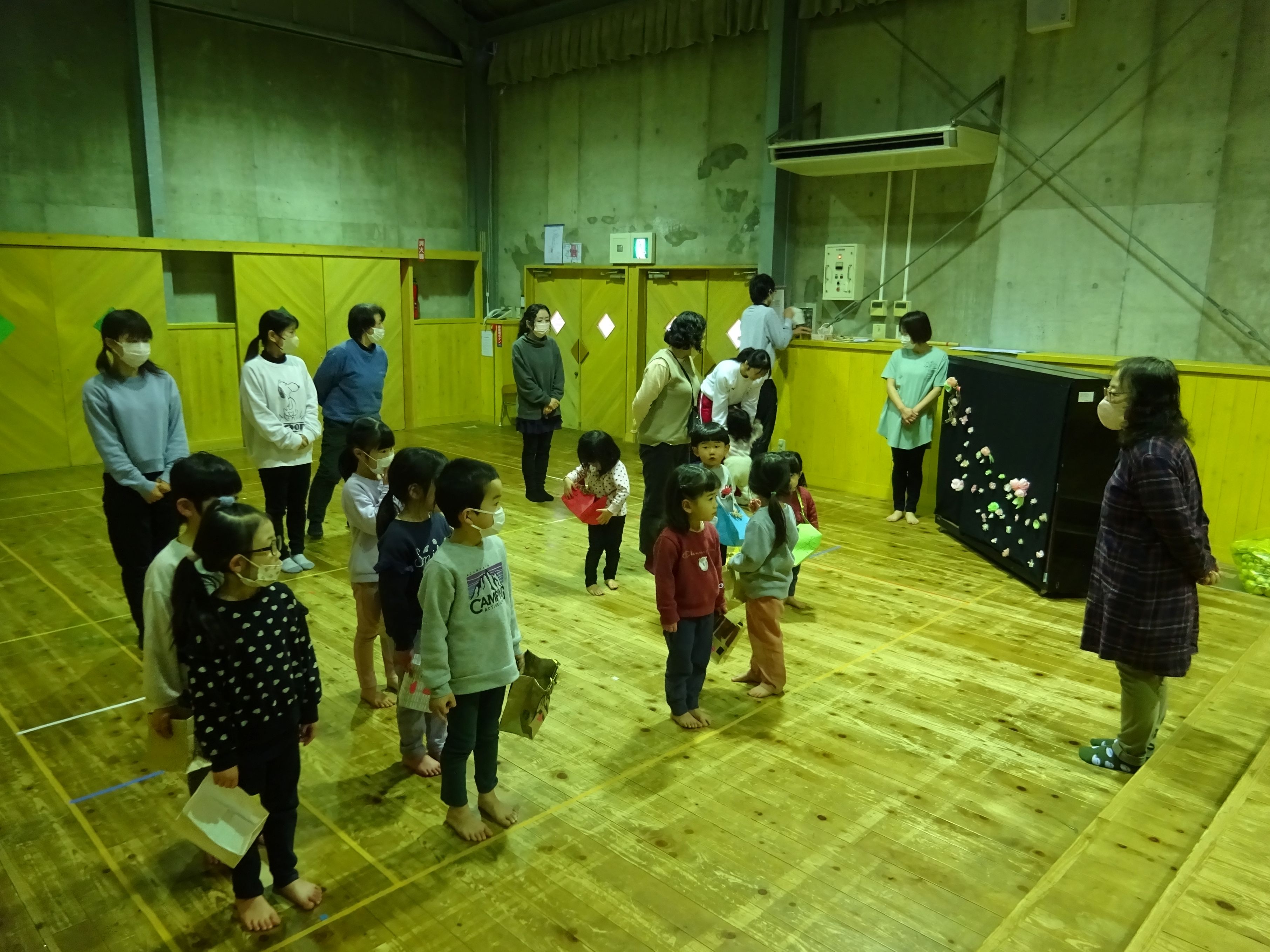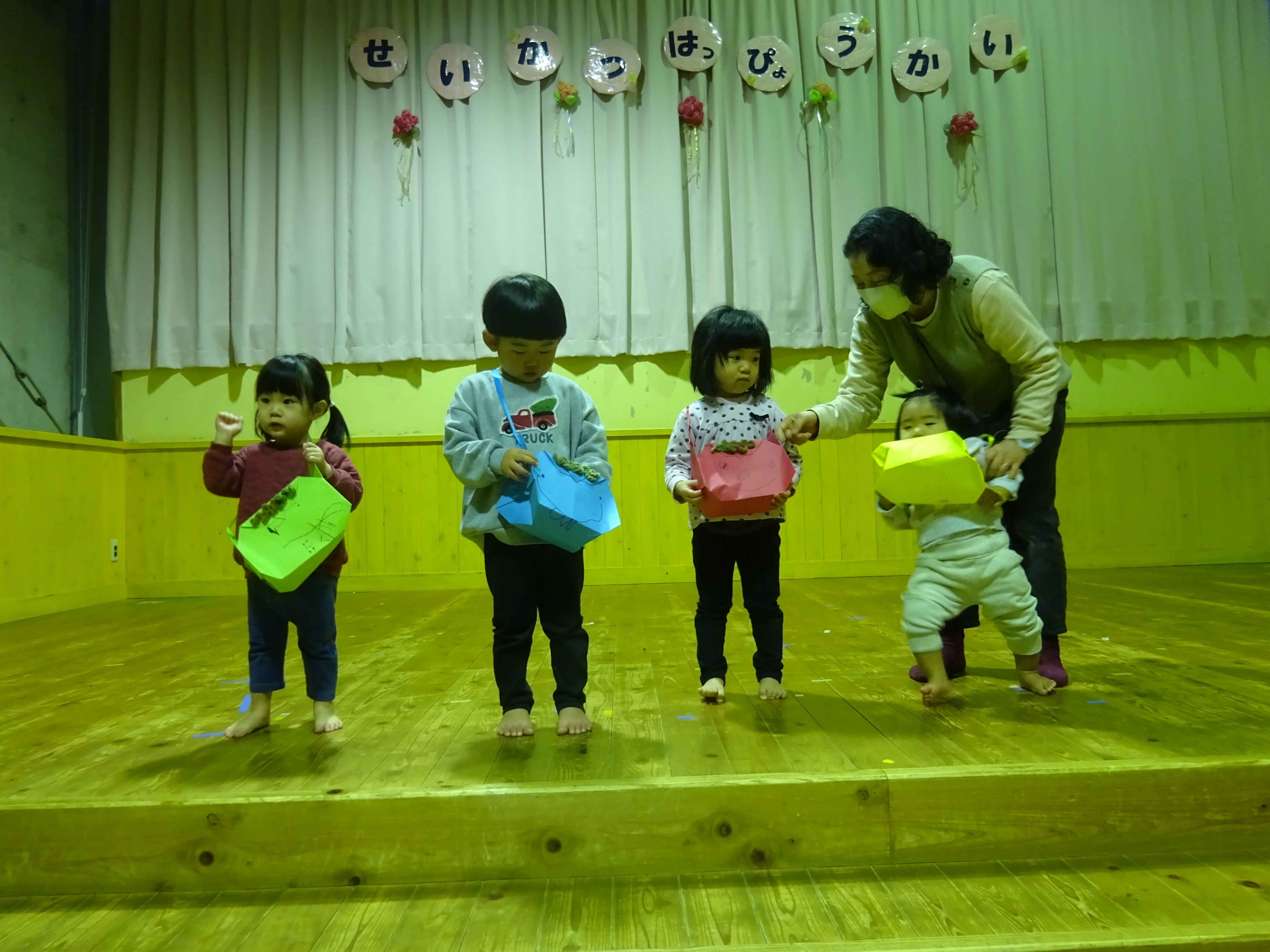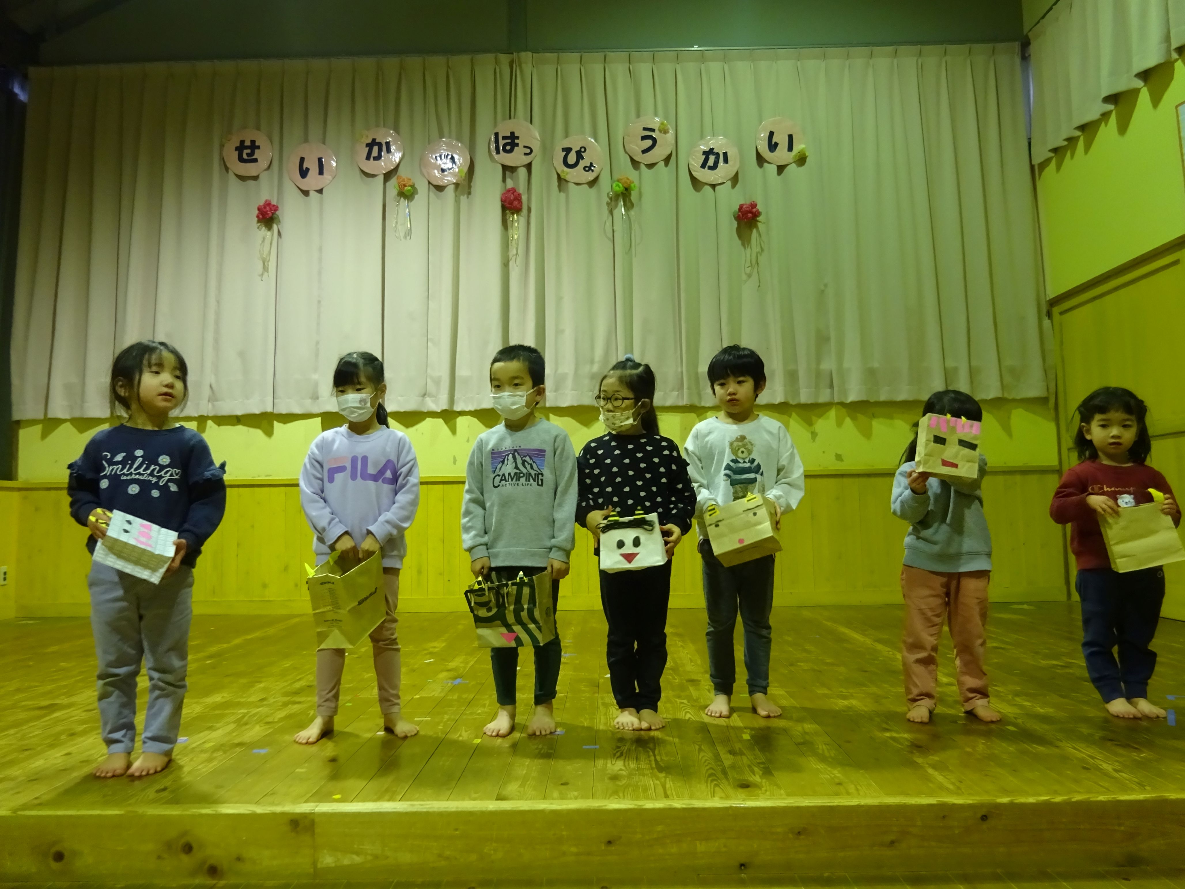 今日は豆まき会を行いました。自分達で作った豆入れの紹介に合わせて、にじ・そら組は自分の心の中の鬼も発表しました。みんな自分の中にいる鬼がよくわかっていて、「○○おにをたいじします!」と力強く宣言する子どももいました。鬼の登場に少し驚いた表情の子ども達でしたが、優しい鬼だという事が分かると、側に行き自分が退治したい心の中の鬼を叫んで、新聞紙の豆をぶつけ、最後には握手をして仲良くなっていました。