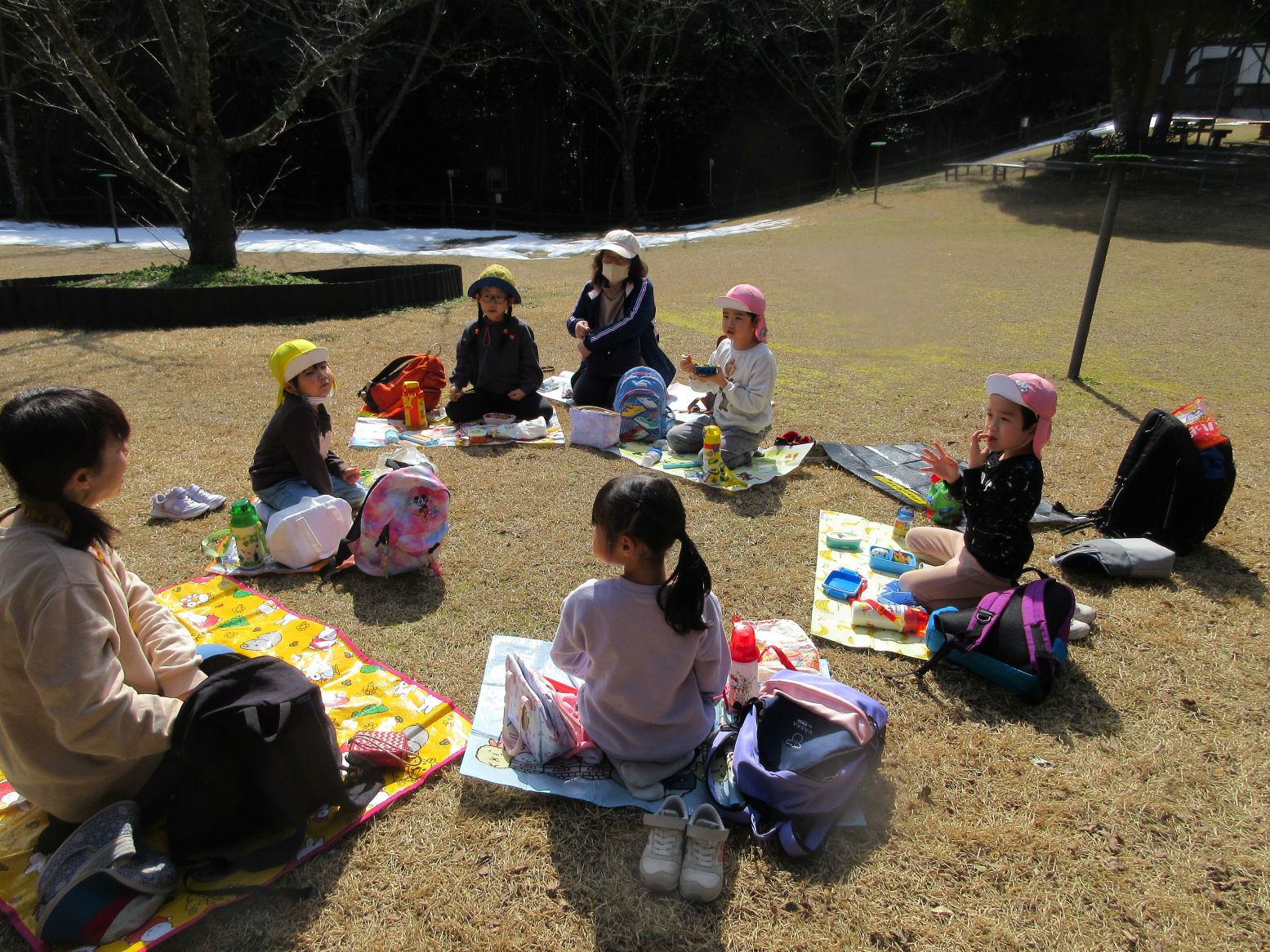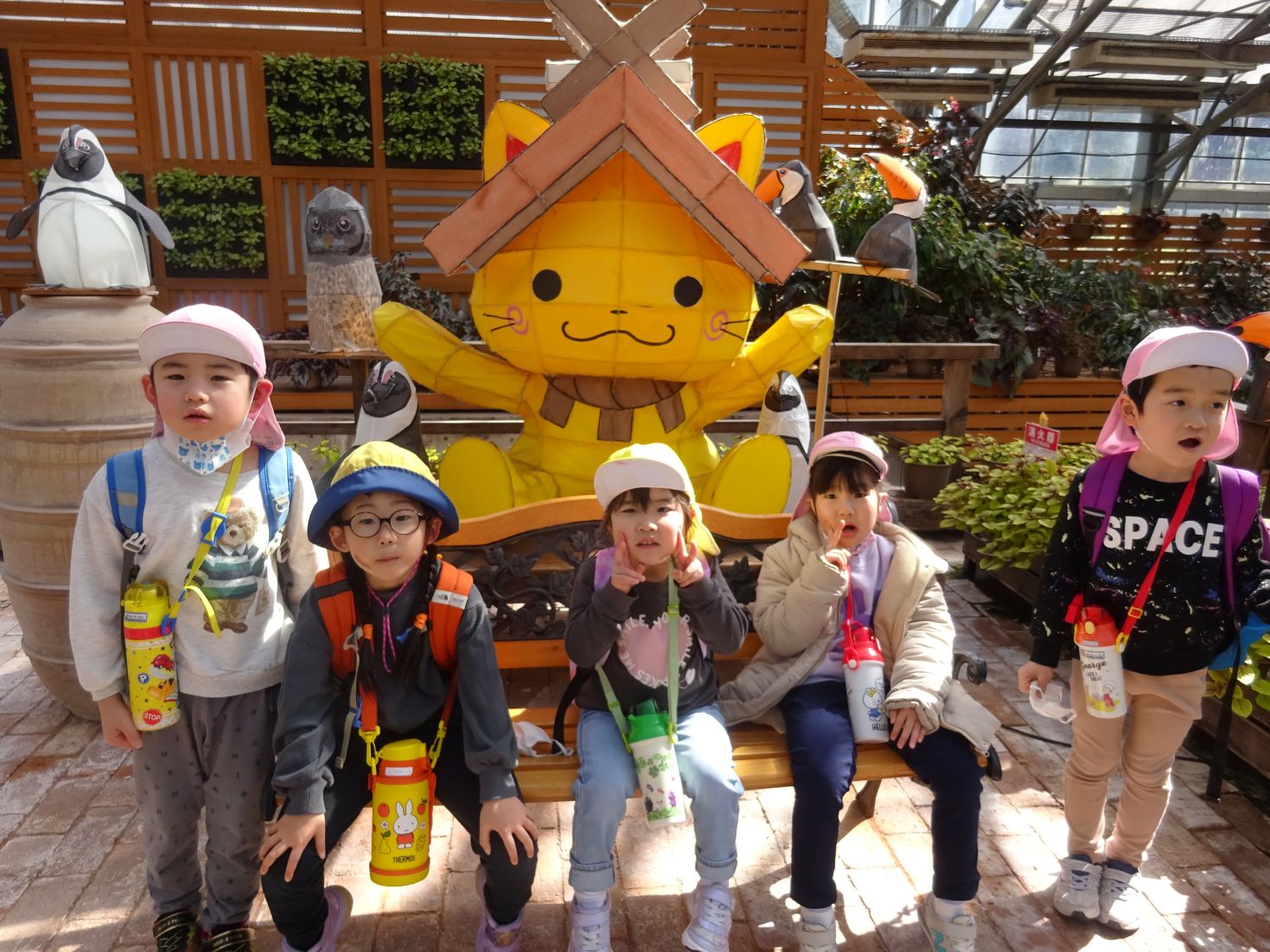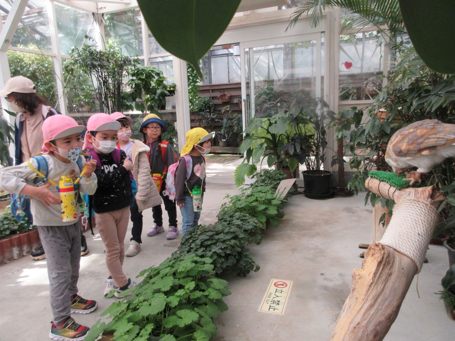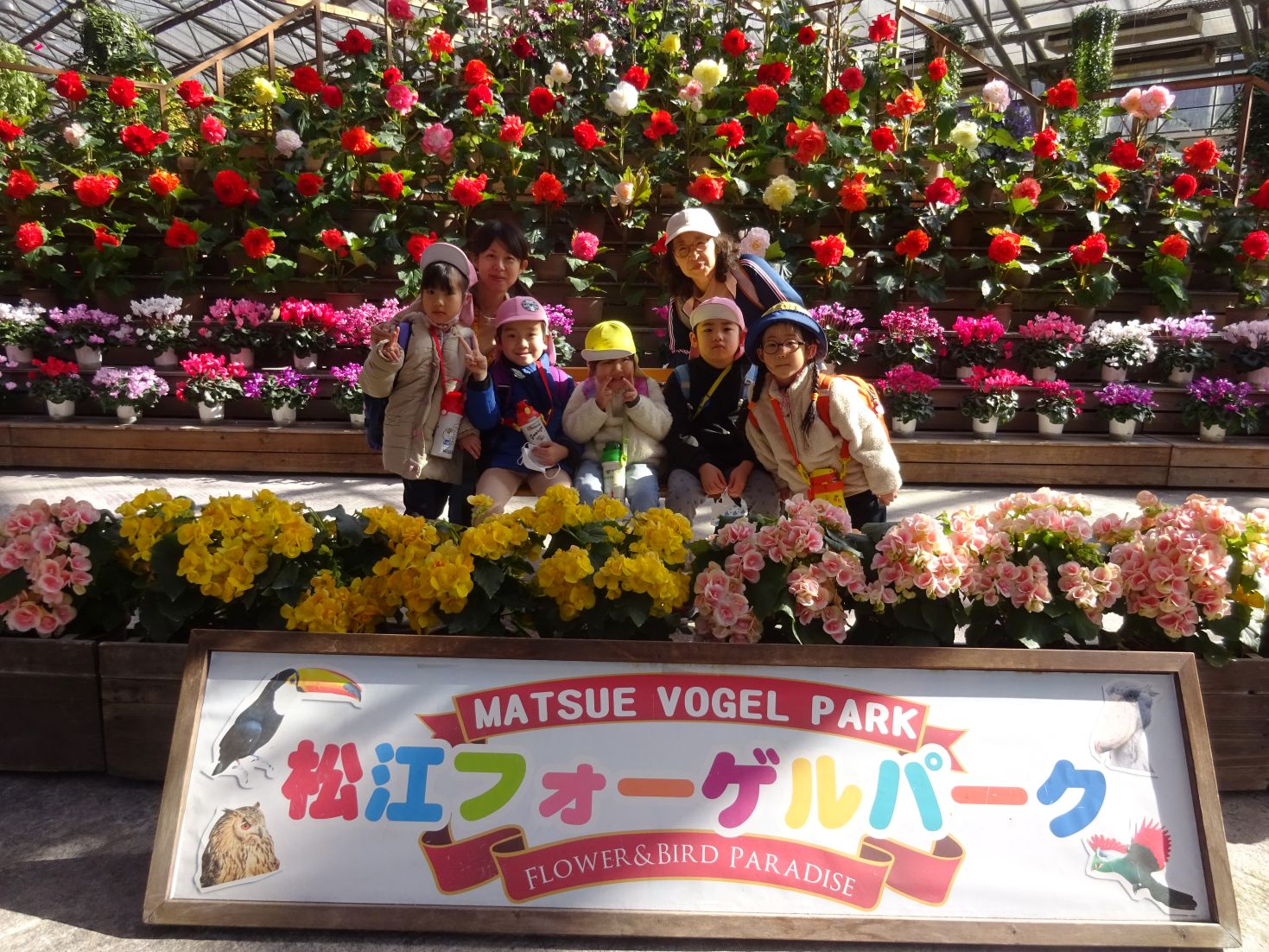 フォーゲルパークに着くと奇麗な花がお出迎え。早速、記念写真を撮りました。ペンギンショーと、フクロウショーを真近で見て、目を輝かせていました。ペンギンやフクロウの名前を覚えたこどももいました。たくさん見た後は、待ちに待ったお弁当‼朝から「おべんとう たべた~い」「たのしみ~」と言っていたこども達は、青空の下で笑顔で食べました。お弁当を食べた後は、雪遊びや、フリスビーをして遊びました。その後、バードショーも見ることが出来ました。