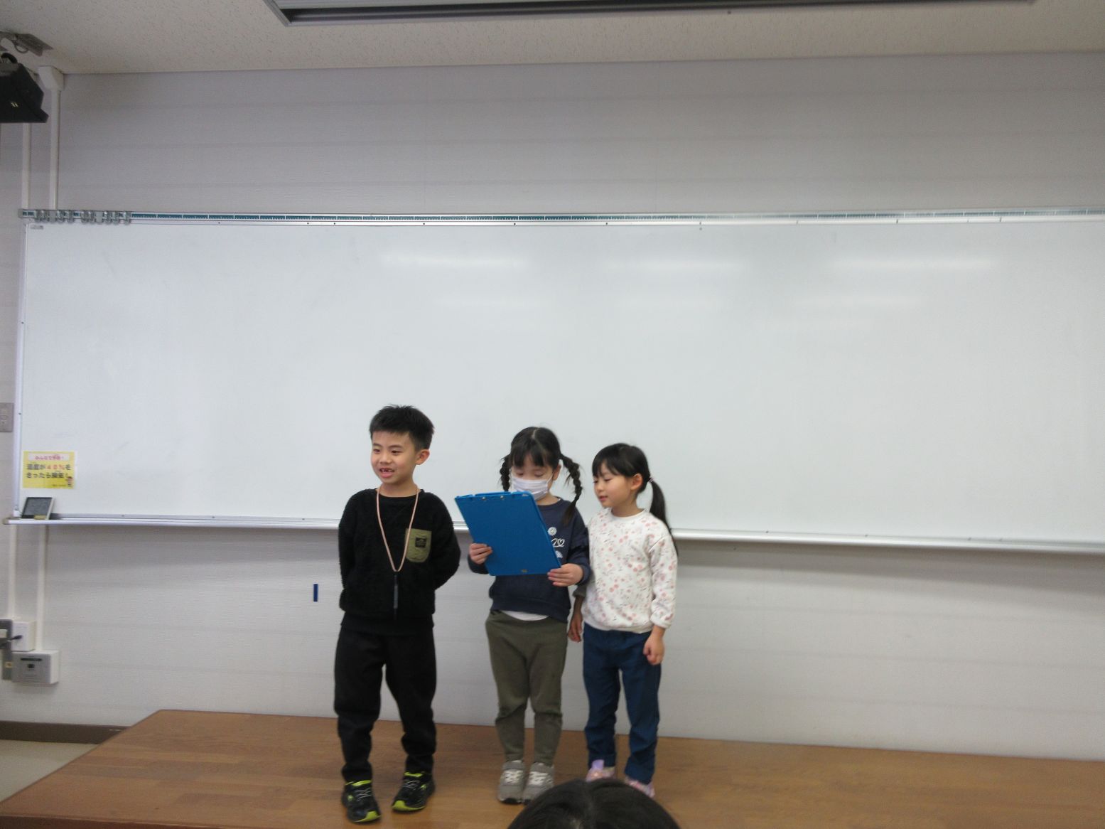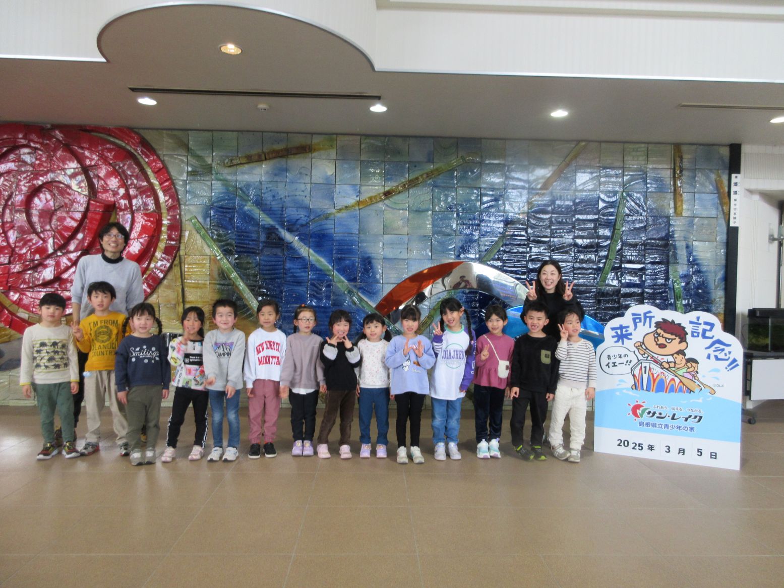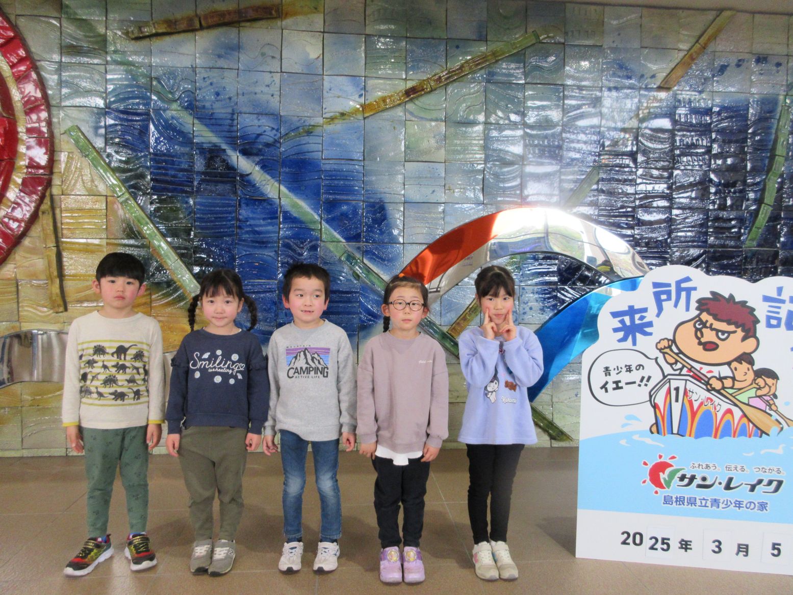 マリン保育所の友達と一緒にバスに乗り、サンレイクへ行きました。到着後、記念写真を撮りました。