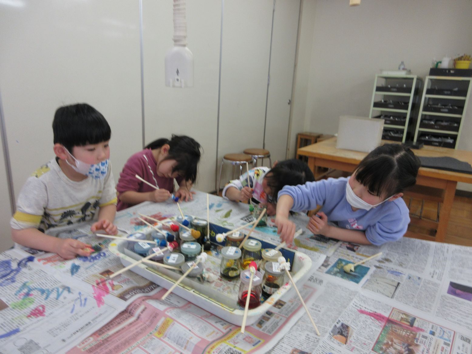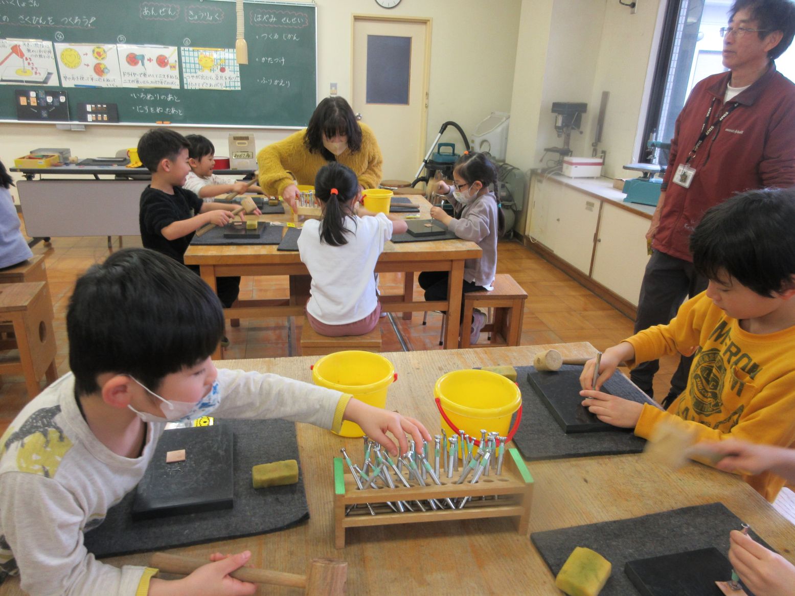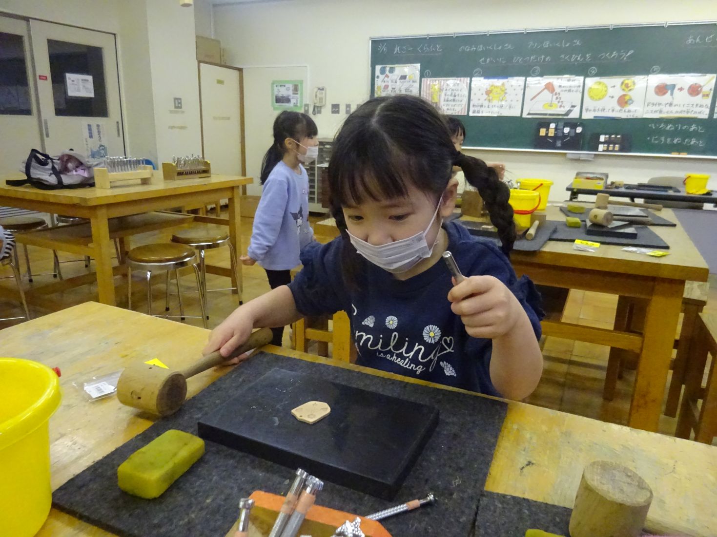 午前中は、『レザークラフト作り』を行いました。職員の方の説明を聴きいたり見たりして、作り方を覚えました。早速作りはじめたこども達は、わくわくした表情で模様を選び、水で湿らせた皮に型を押し当て、木づちで叩いて模様をつけました。思い思いの色をじっくり選んで、丁寧に塗っていました。いろいろ工夫して作ったキーホルダーは、世界でたったひとつだけの作品になりました。出来上がった後は“自分で出来ることは自分で”の約束のもと、最後まで片付けを頑張りました。