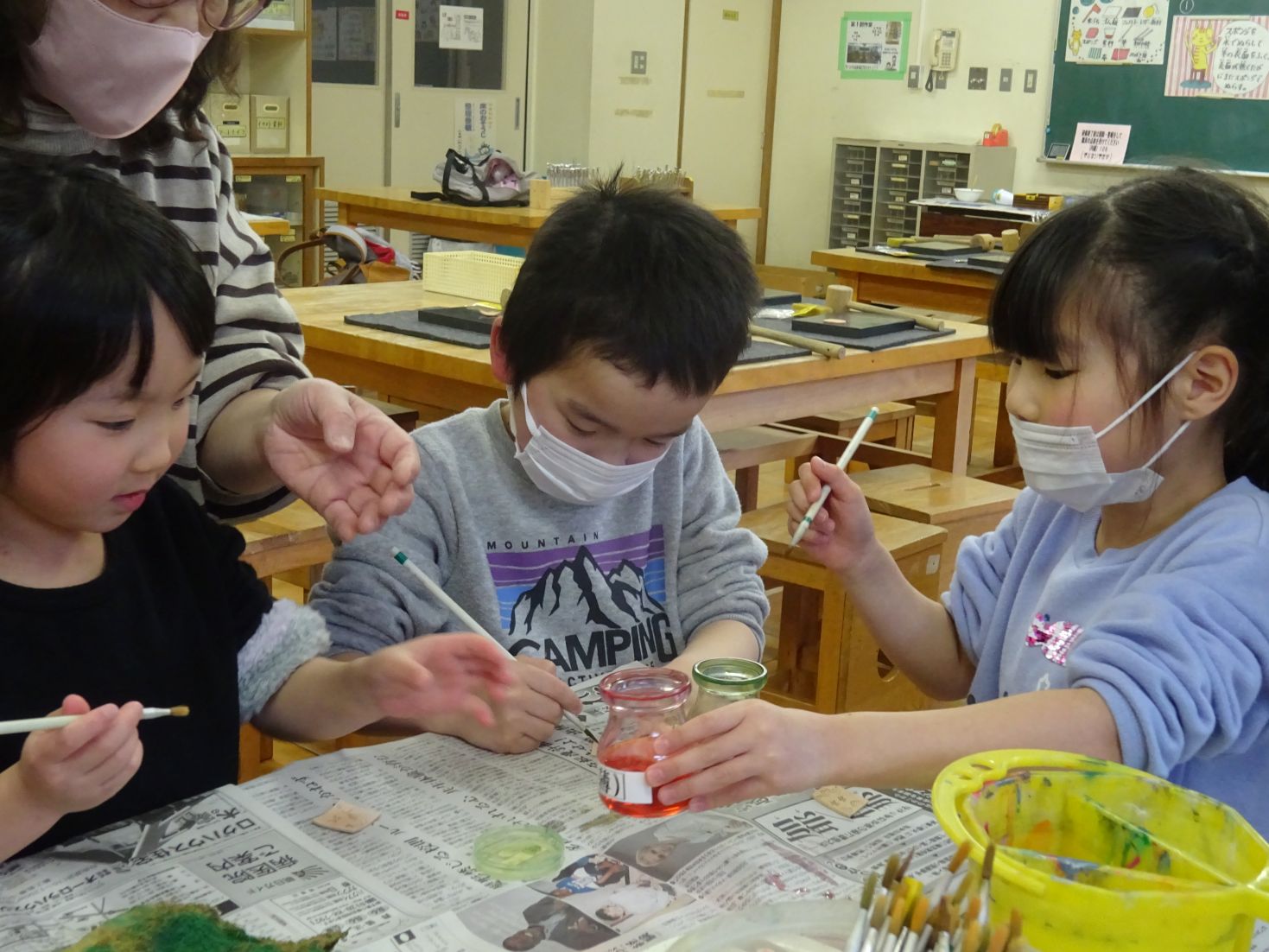 皮に付けた跡に、筆で色を塗っていきます