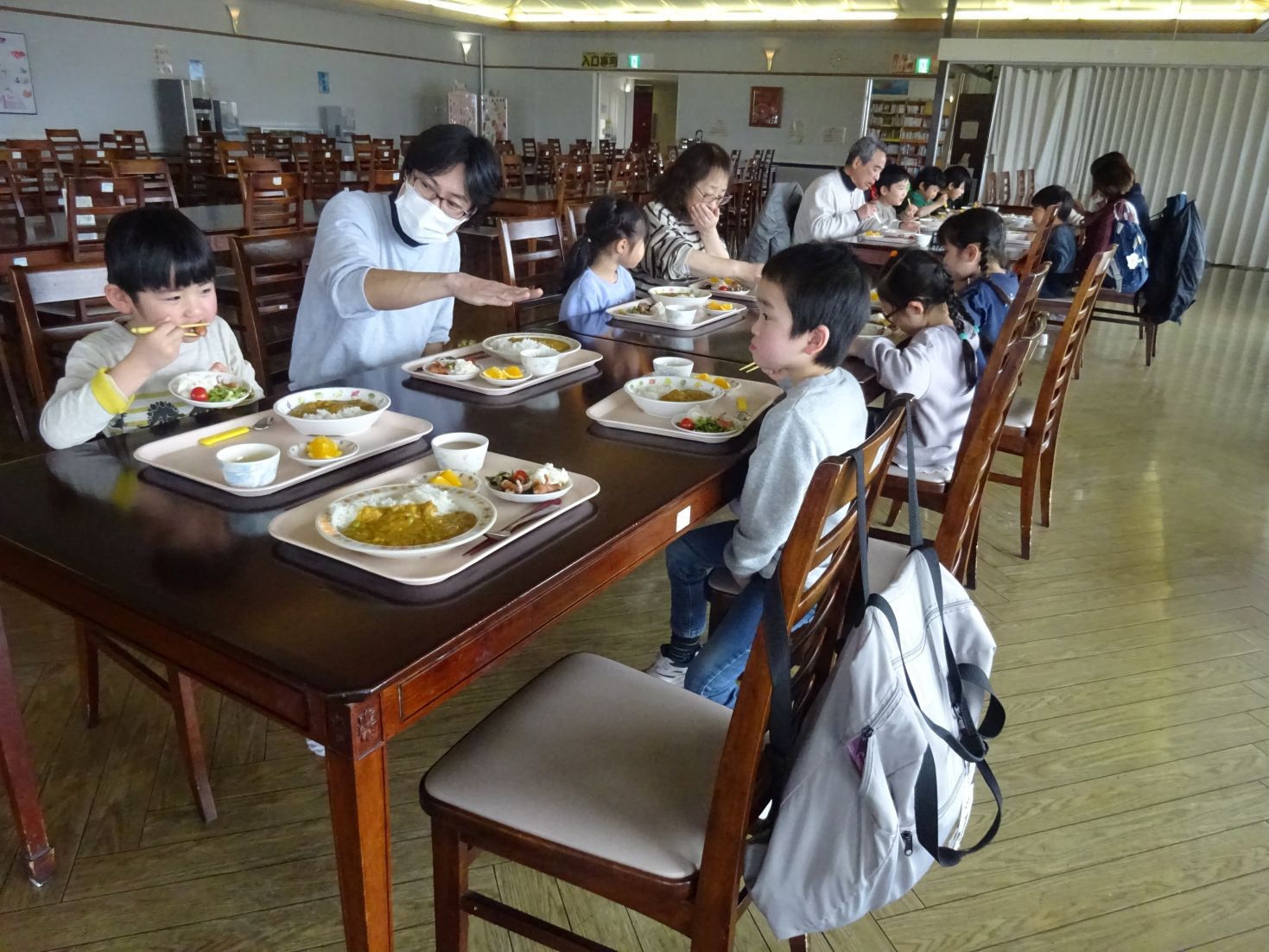 昼食はカレーライス。サラダと果物付き。友達や保育者と団らんしながら食べました。もちろん、片付けも自分達で行う事ができました。