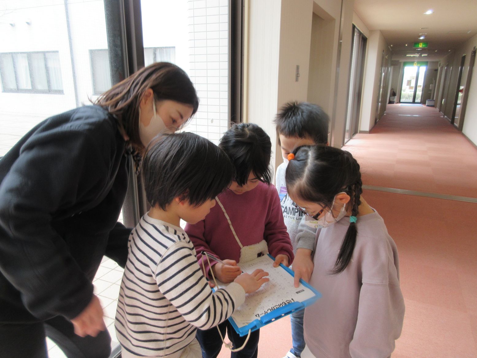午後のお楽しみは、『いきもの探しゲーム(館内ラリー)』を行いました。館内に50匹の生き物が描かれたカードが貼ってあり、それを野波保育所・マリン保育所混合チームで見つけて、ビンゴカードを完成させる遊びでした。「あ!あったよ!」「どこに あるんだろう~」「こっちに あったよ!」と言葉を交わし、遊びながら交流が出来ました。