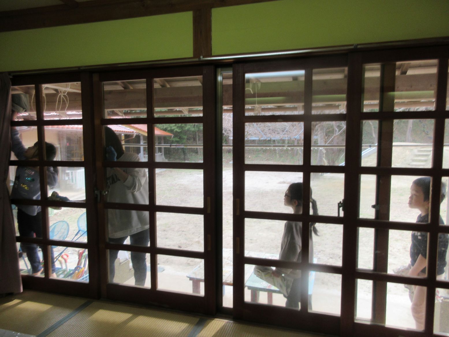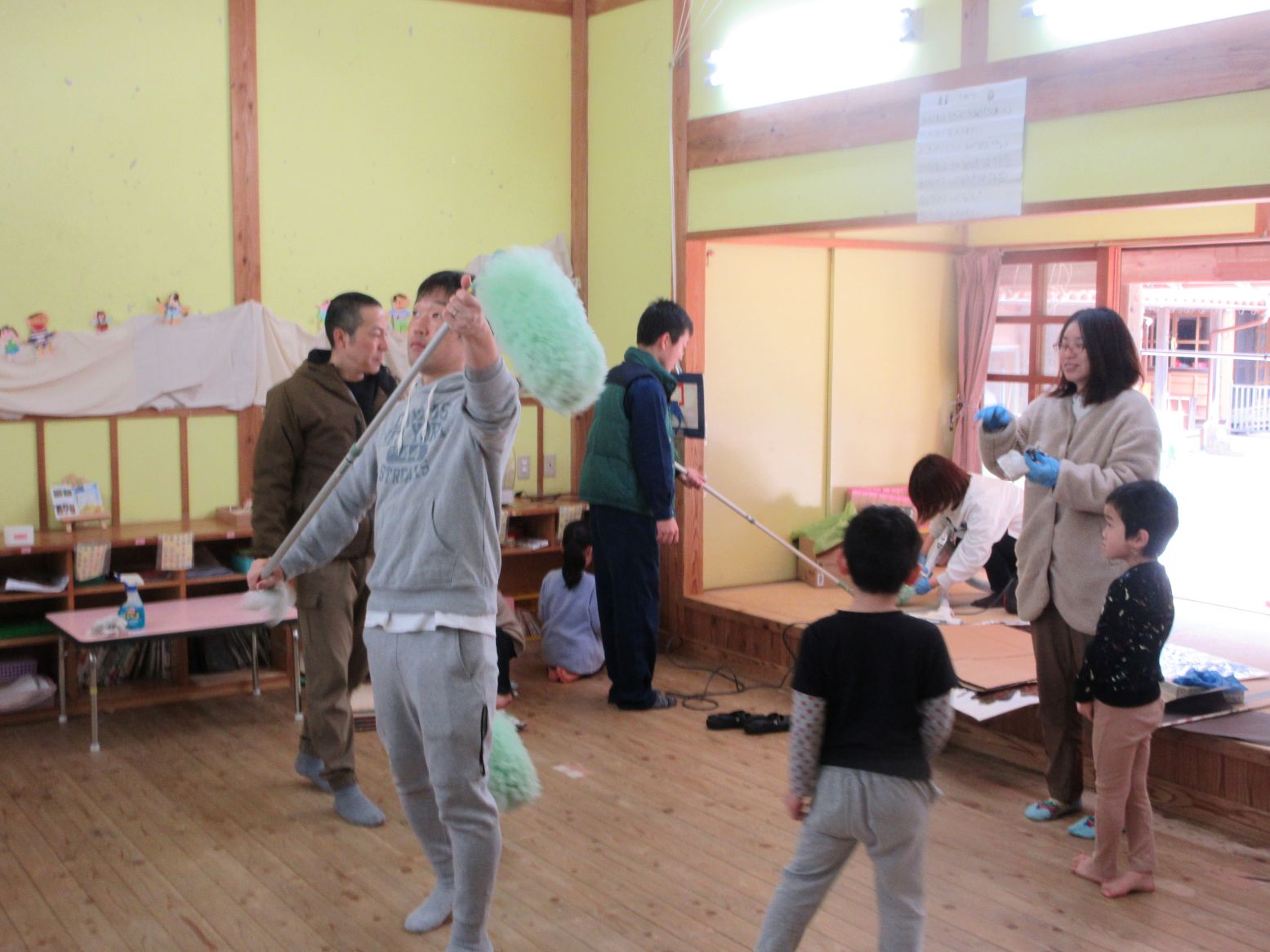 普段は手が届かない高い所に脚立を使って上り、ホコリを落としてくださったり、部屋の窓やサッシなどを丁寧に拭き、細かなホコリを綺麗に掃除してくださったりしました。もちろん、こども達もお家の方と一緒に掃除をしましたが、お父さん・お母さんの手際の良さや、どんどんきれいになる様子を見て“すごいな~‼”という表情でした。そして「きもちいいね‼」と、爽やかな表情のこども達でした。