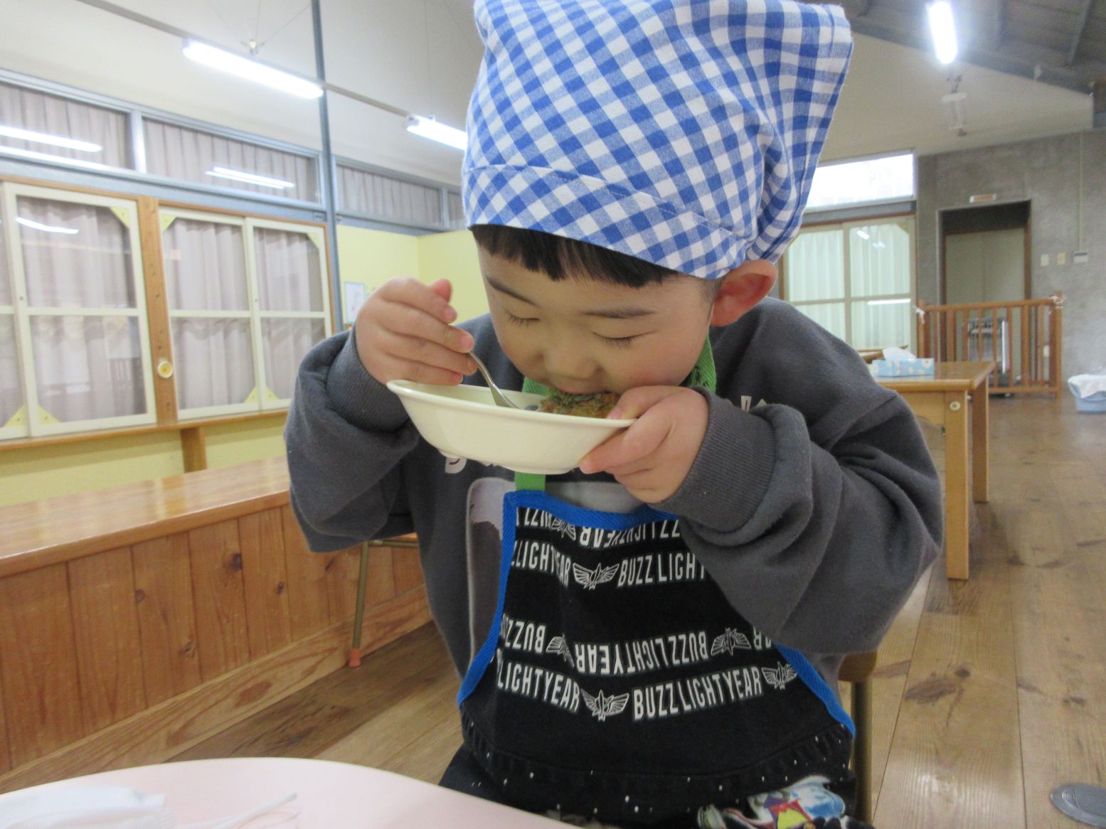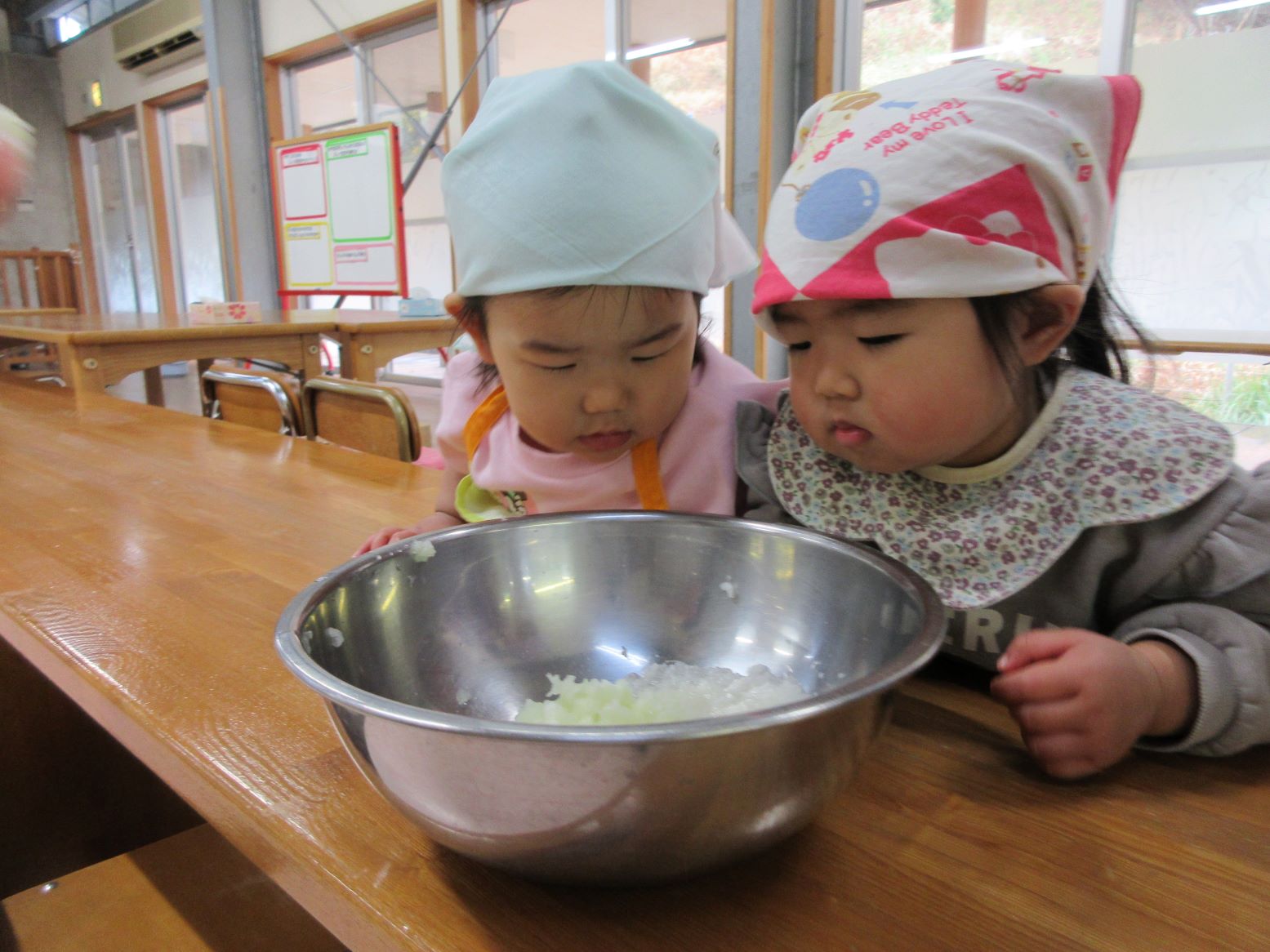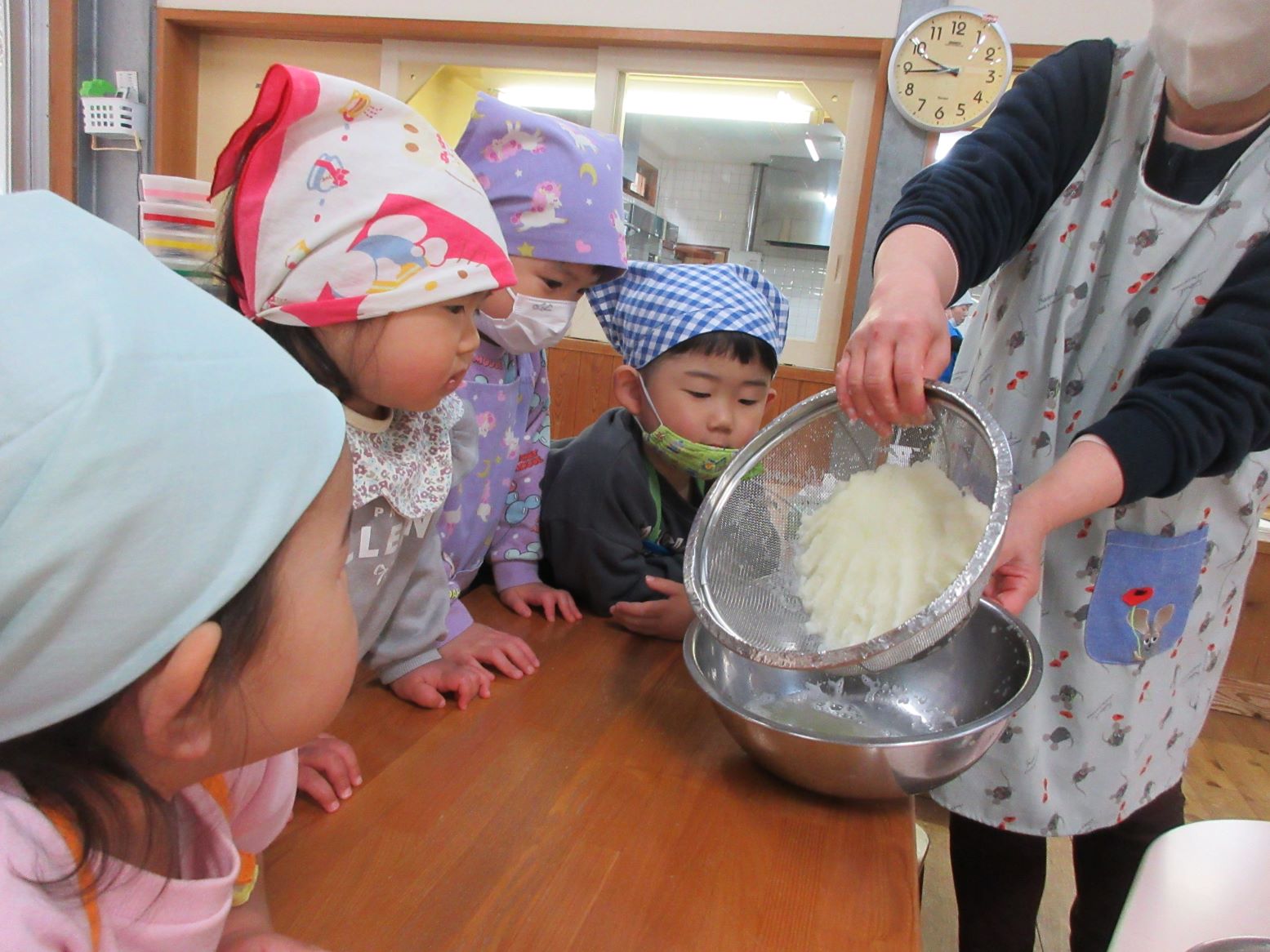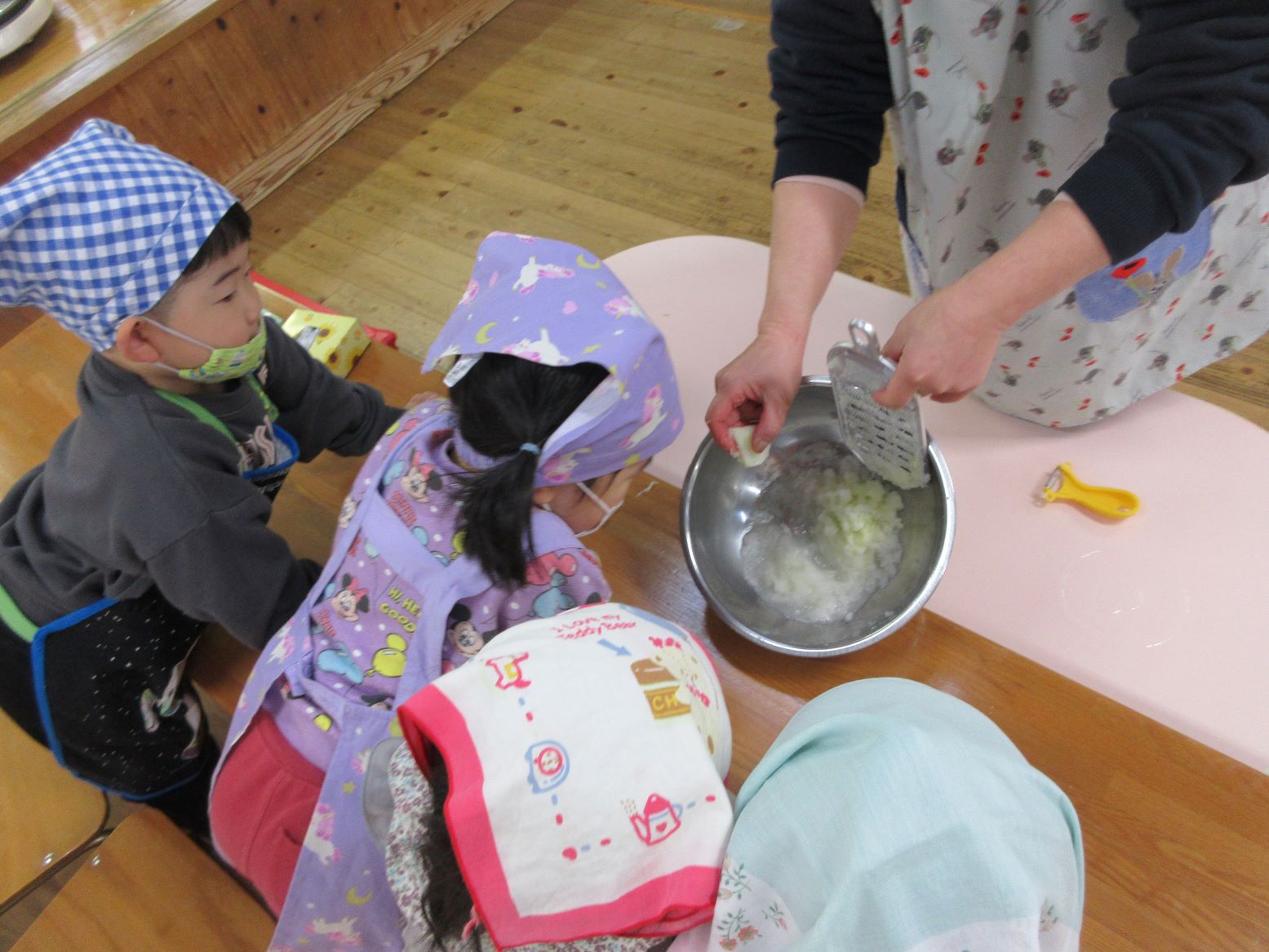 大根をおろし金でする様子を見て、「わーゆきみたい」「だいこんのにおいがするー」「しゃりしゃりおとがするねー」と視覚や嗅覚、聴覚がフル回転でした。