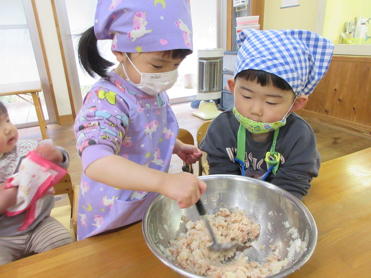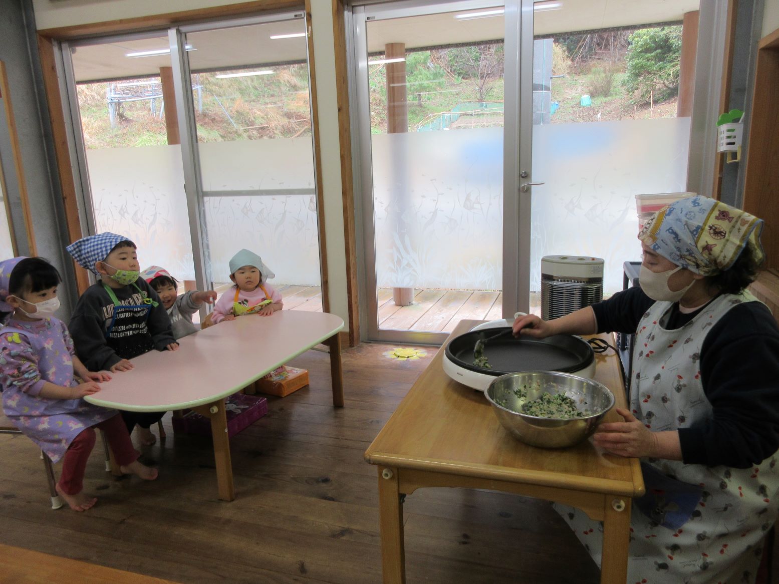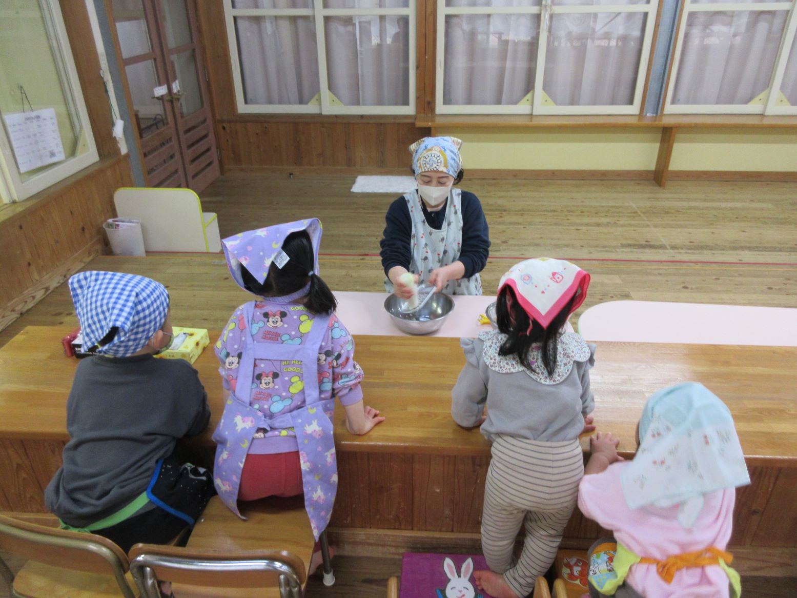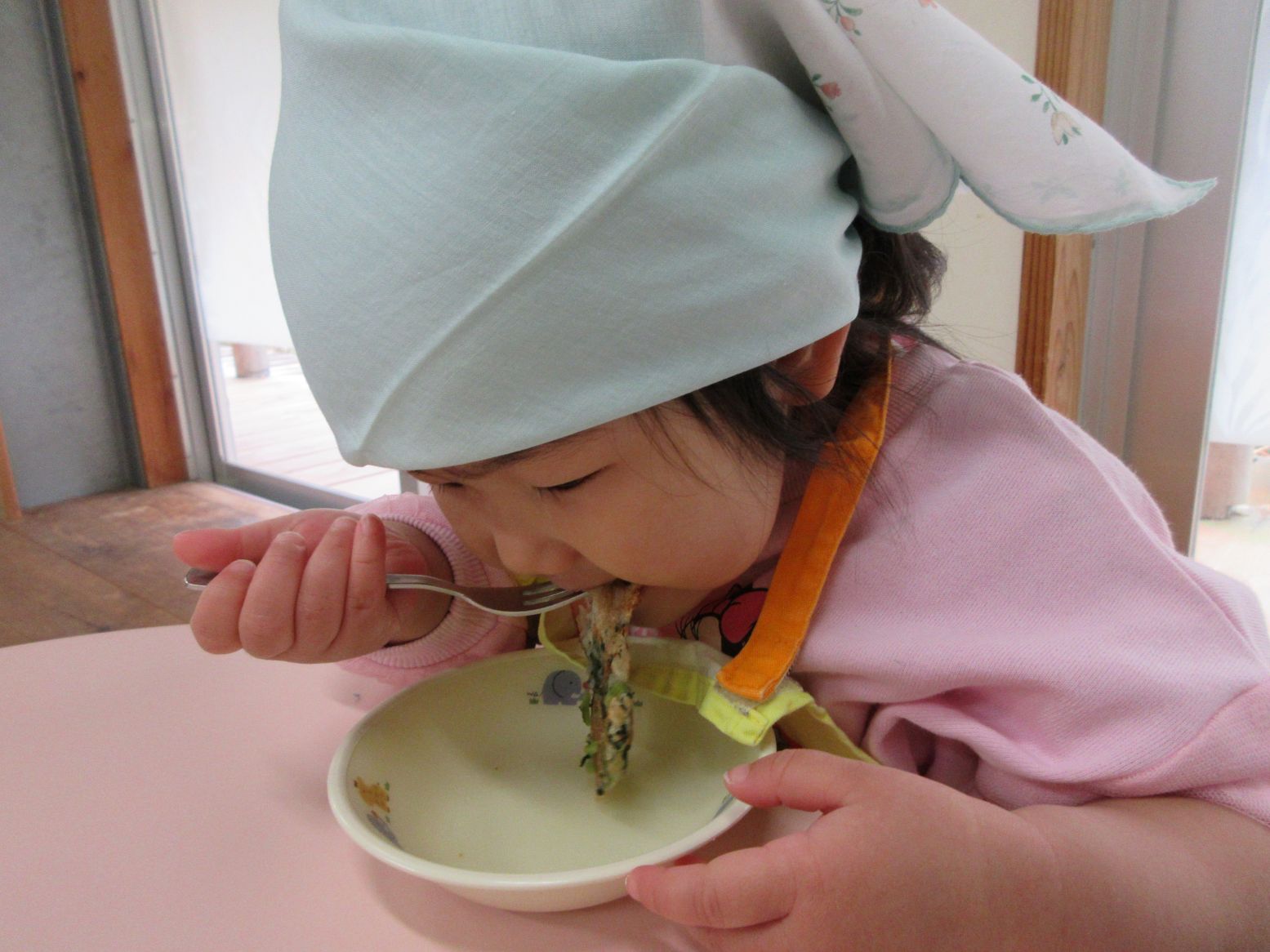 大根をおろし金でする様子を見て、「わーゆきみたい」「だいこんのにおいがするー」「しゃりしゃりおとがするねー」と視覚や嗅覚、聴覚がフル回転でした。