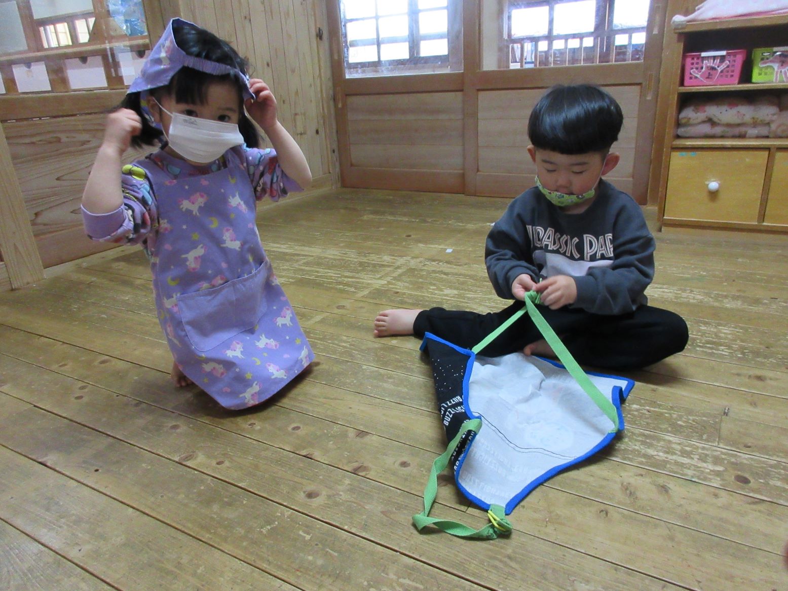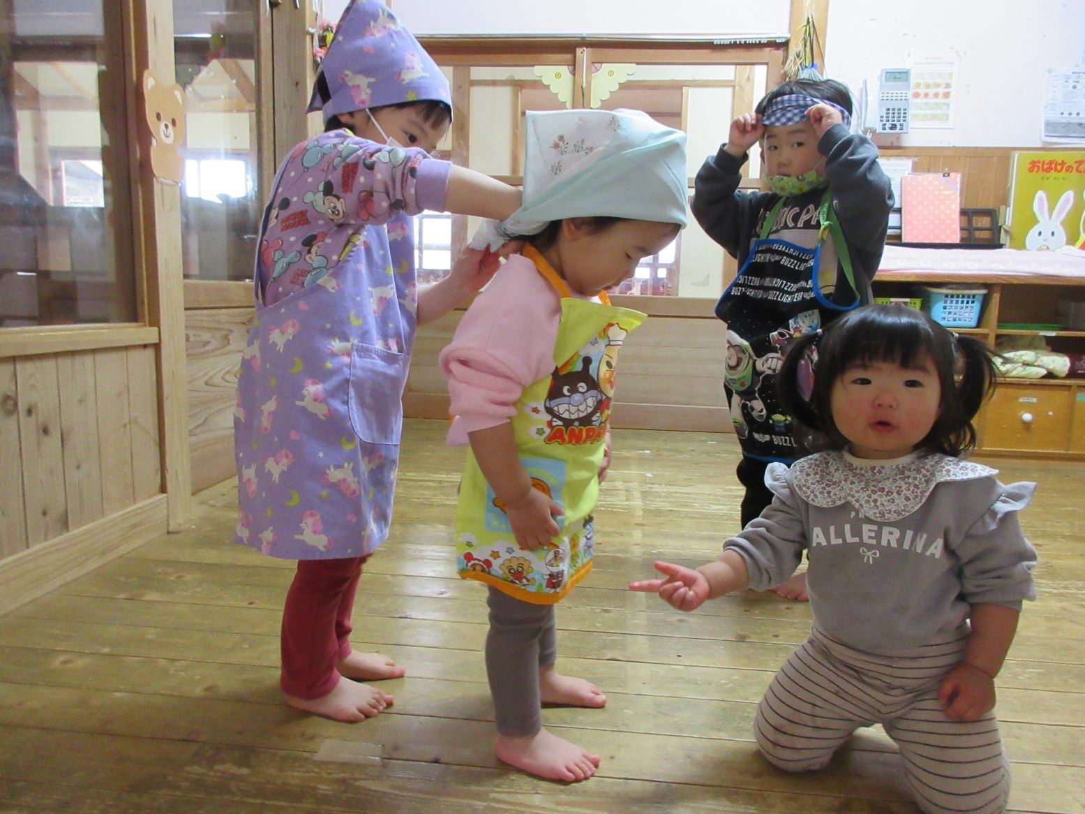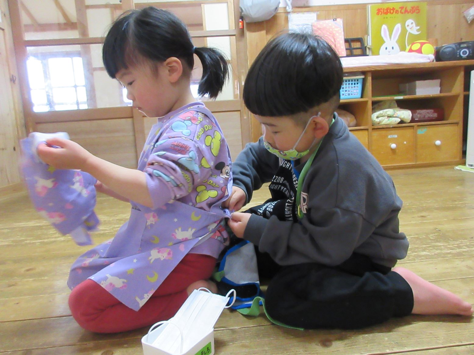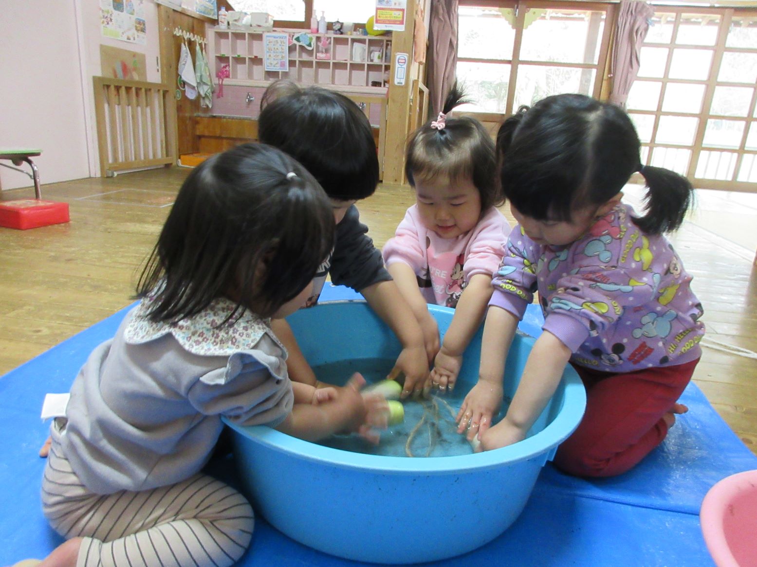 大根をおろし金でする様子を見て、「わーゆきみたい」「だいこんのにおいがするー」「しゃりしゃりおとがするねー」と視覚や嗅覚、聴覚がフル回転でした。