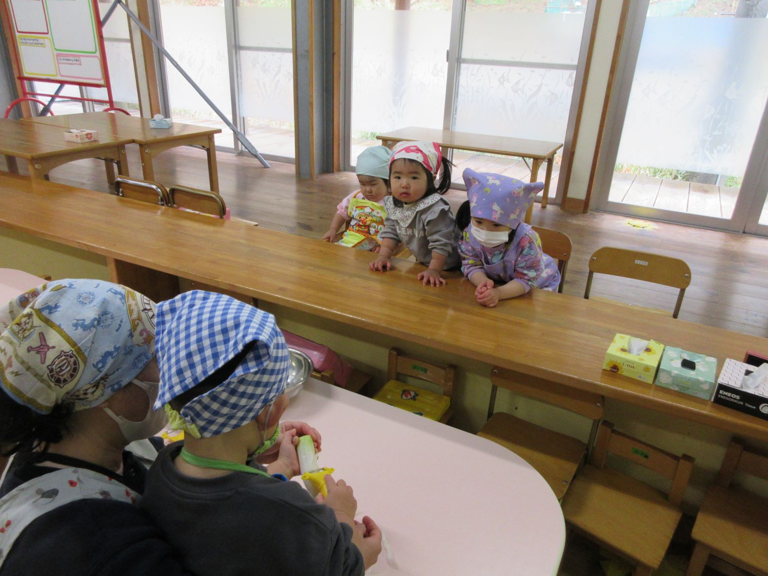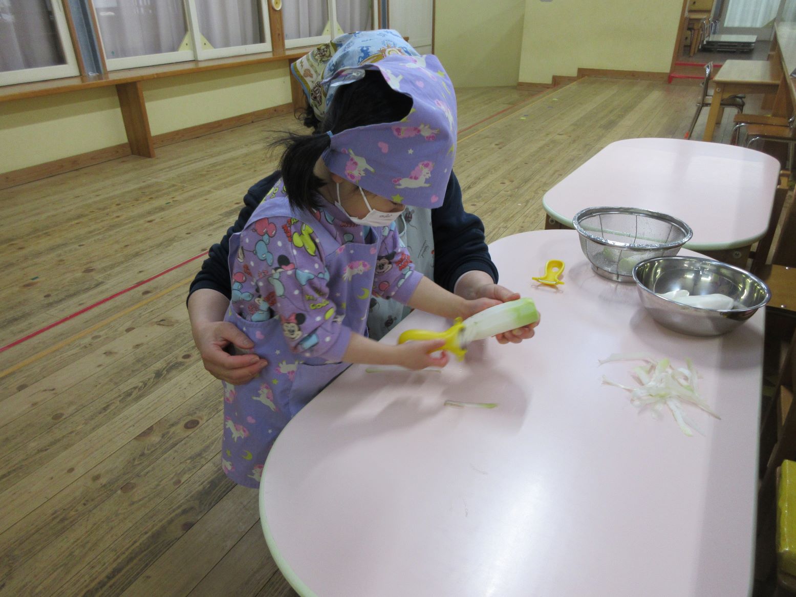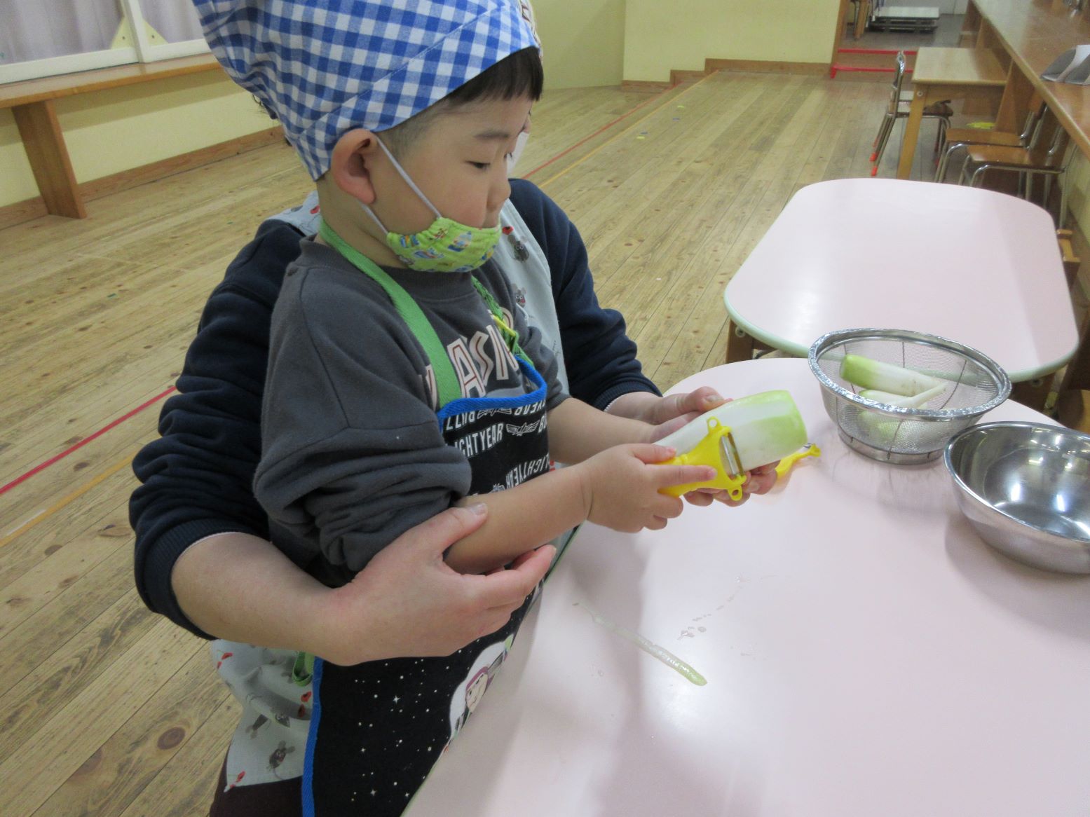 土から抜く時はとても力がいりました。抜いた大根を綺麗に洗ってから、2歳児がピーラーで皮むきをしました。家庭で経験している子どもがいて、まだ皮が残っていることに気付くと、大根を回して、丁寧にむいていました。