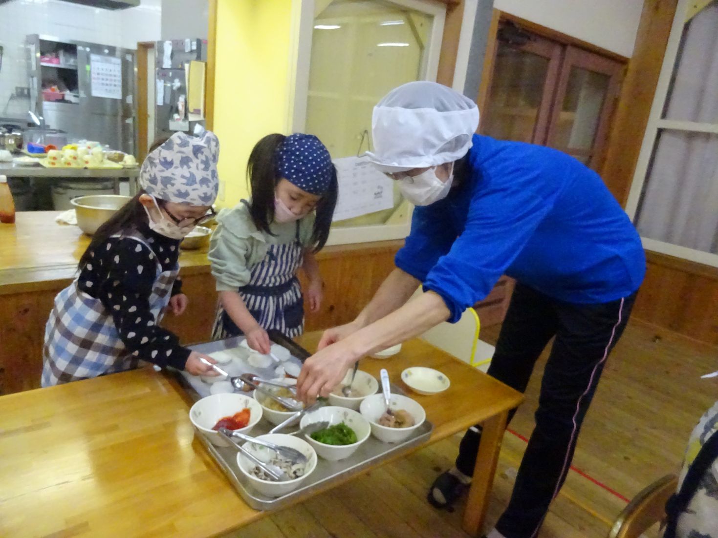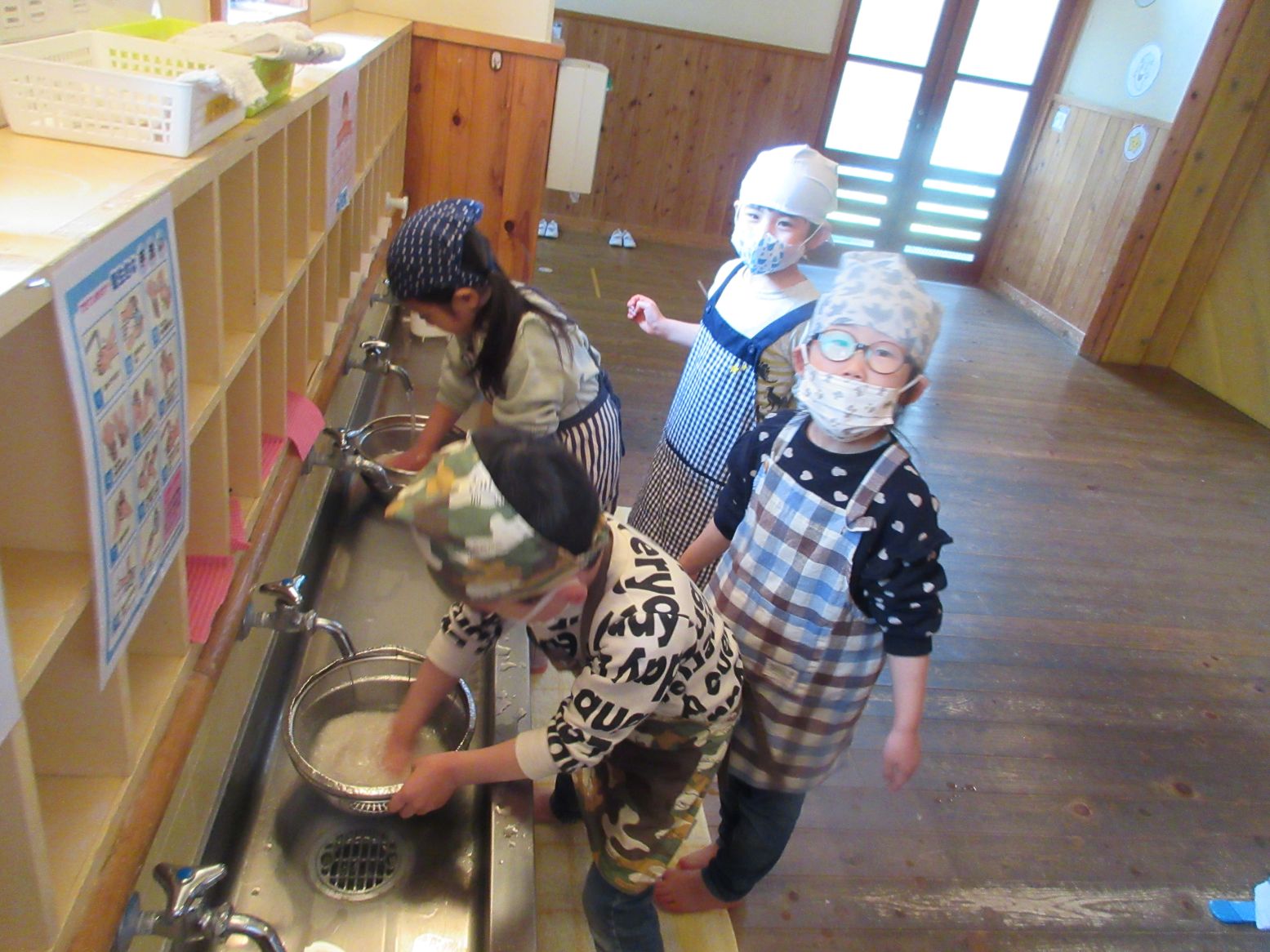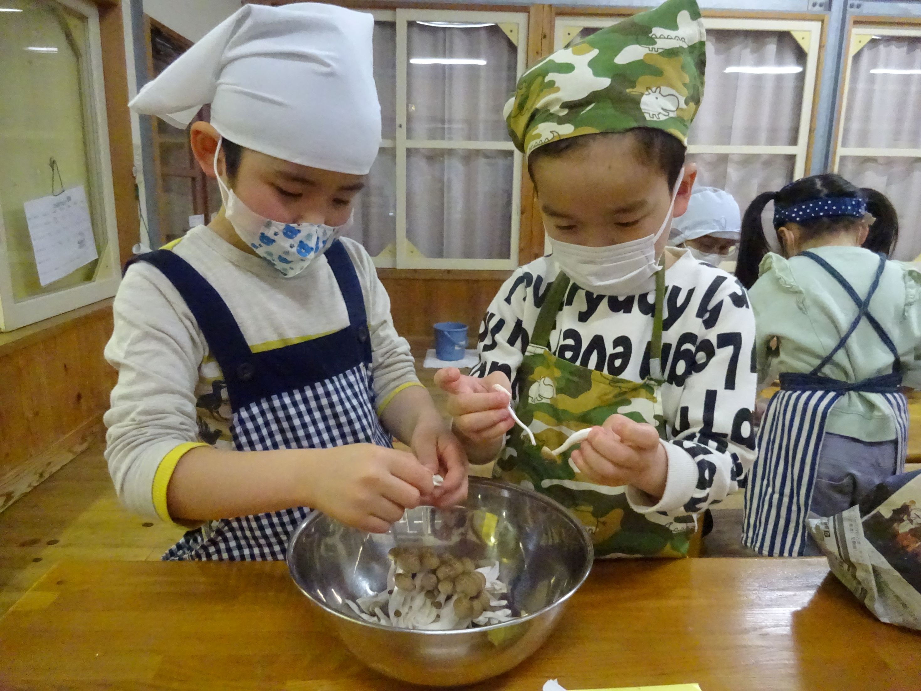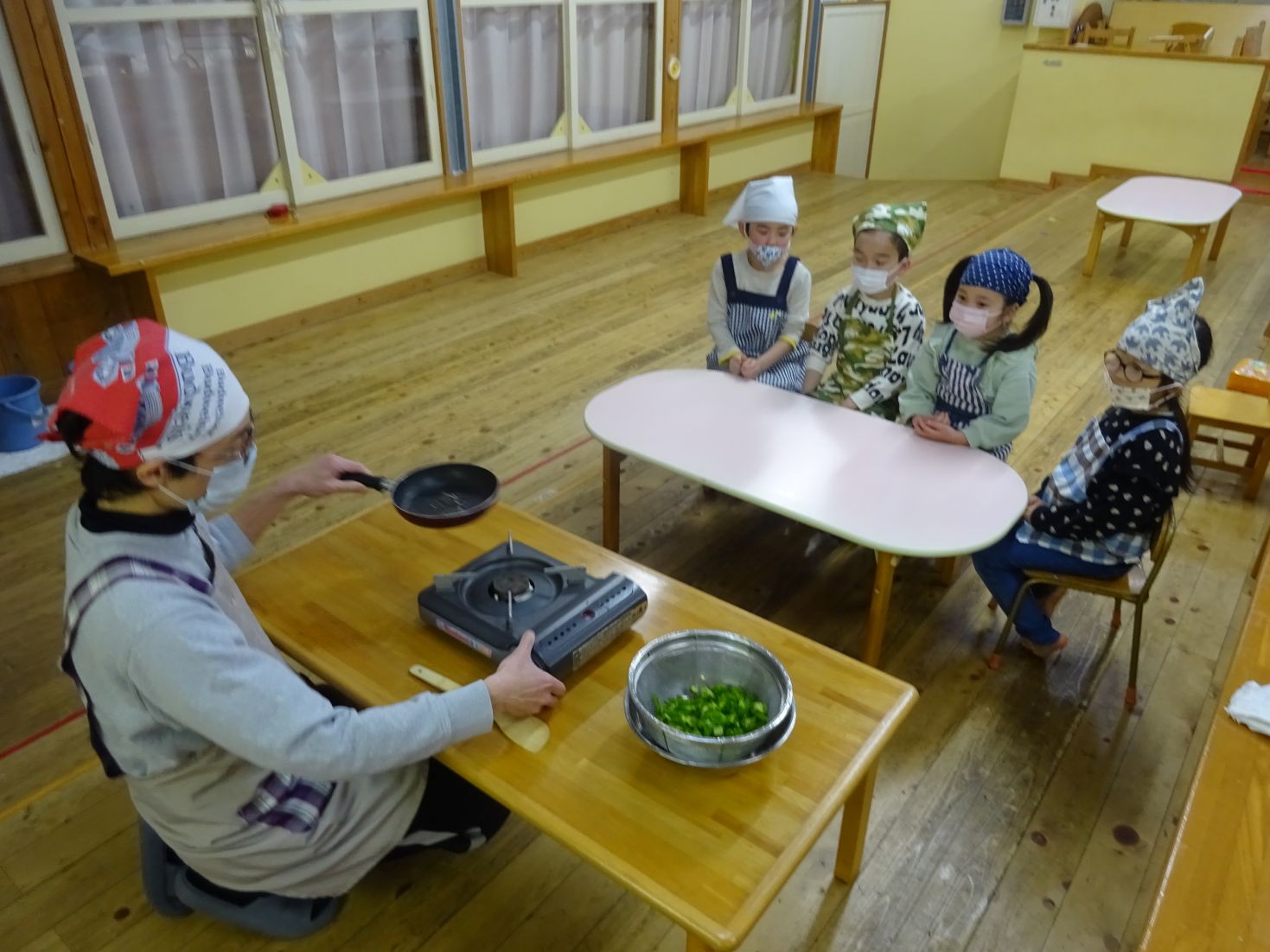 保育室ではもう一つの大イベント“給食当番交代式”をしました。年長児が給食お手伝いには「〇〇があったよ」と、教えてくれました。そして、お当番セットを贈呈し、今日のクッキングを終えました。