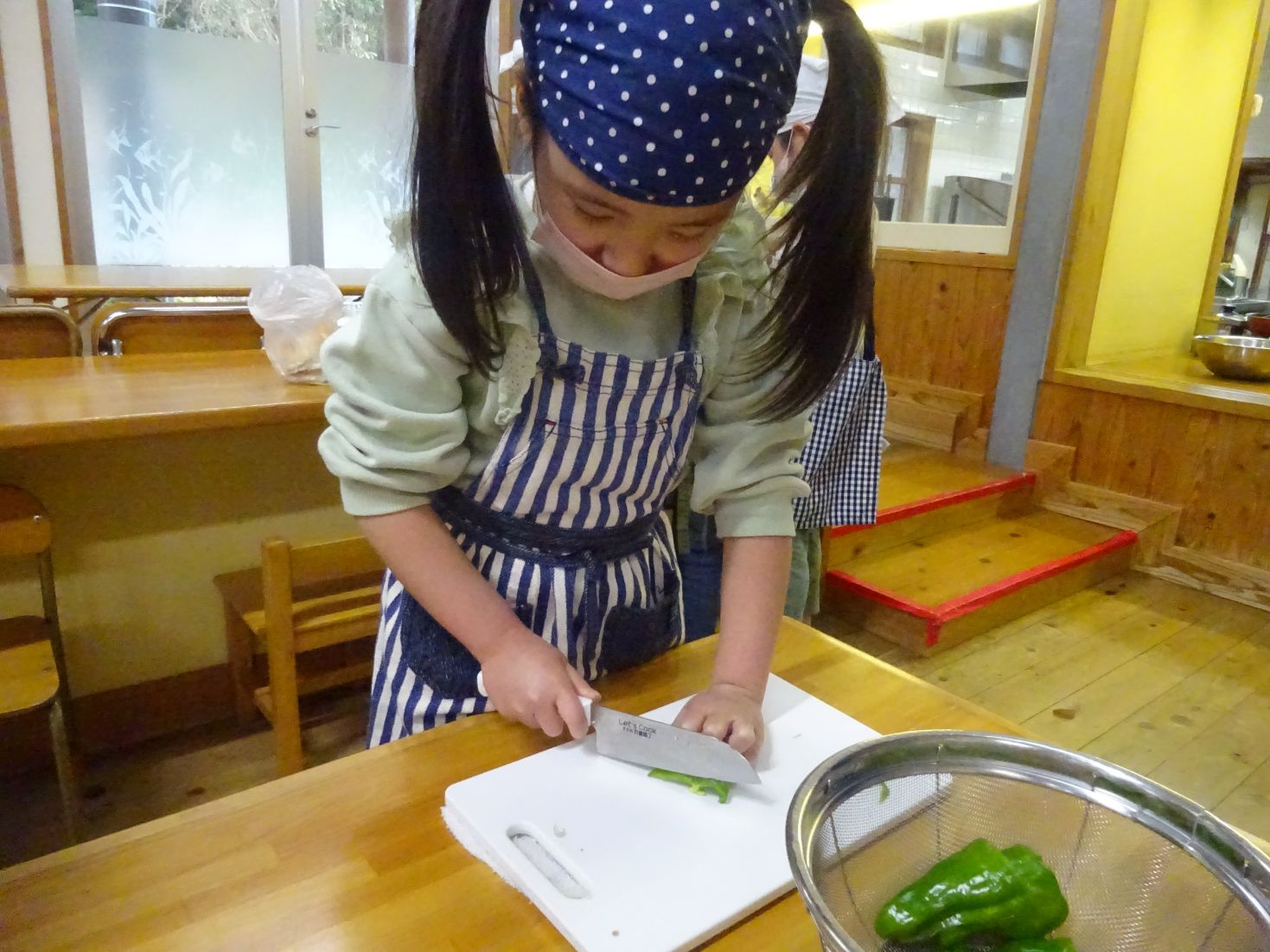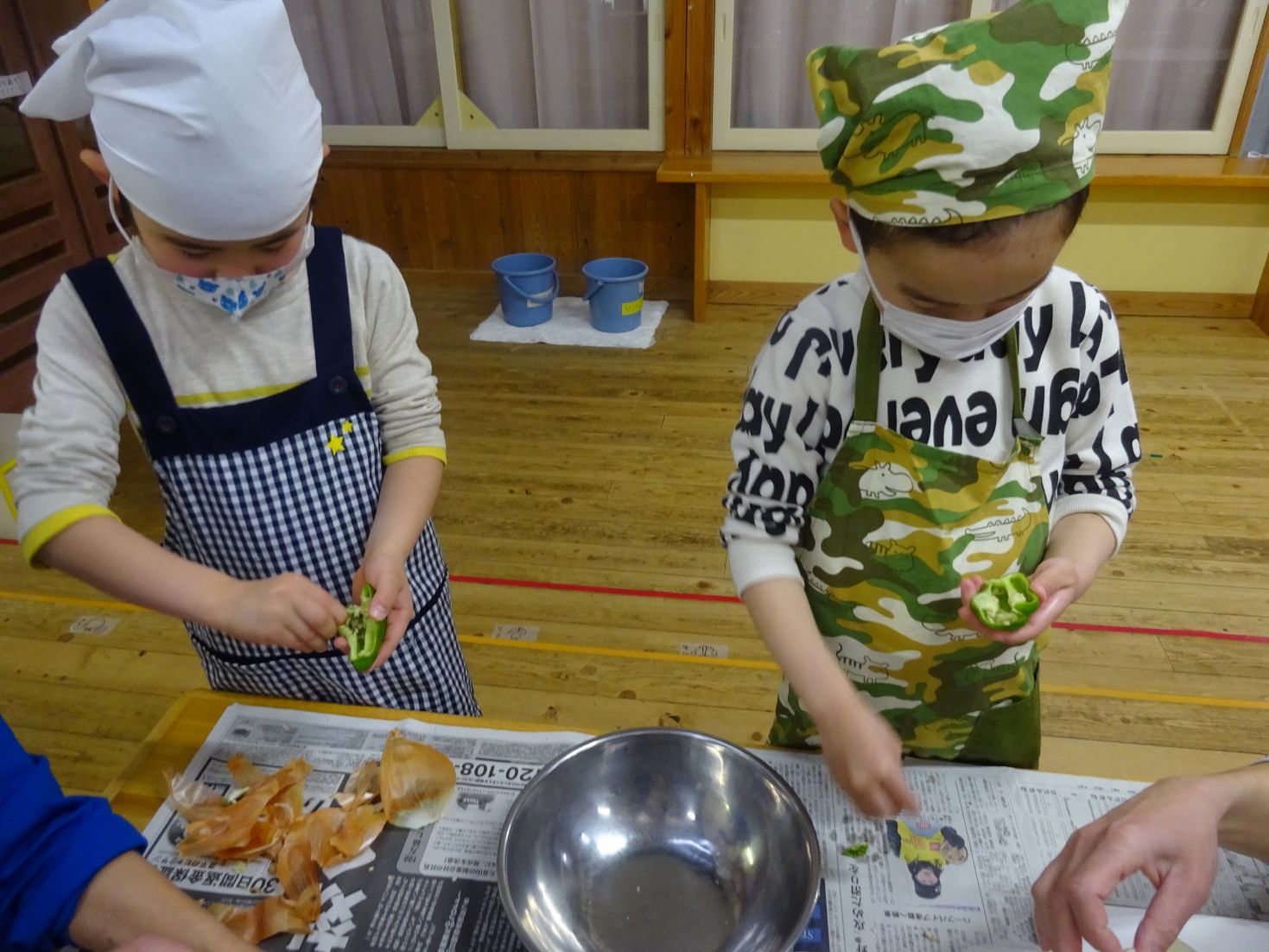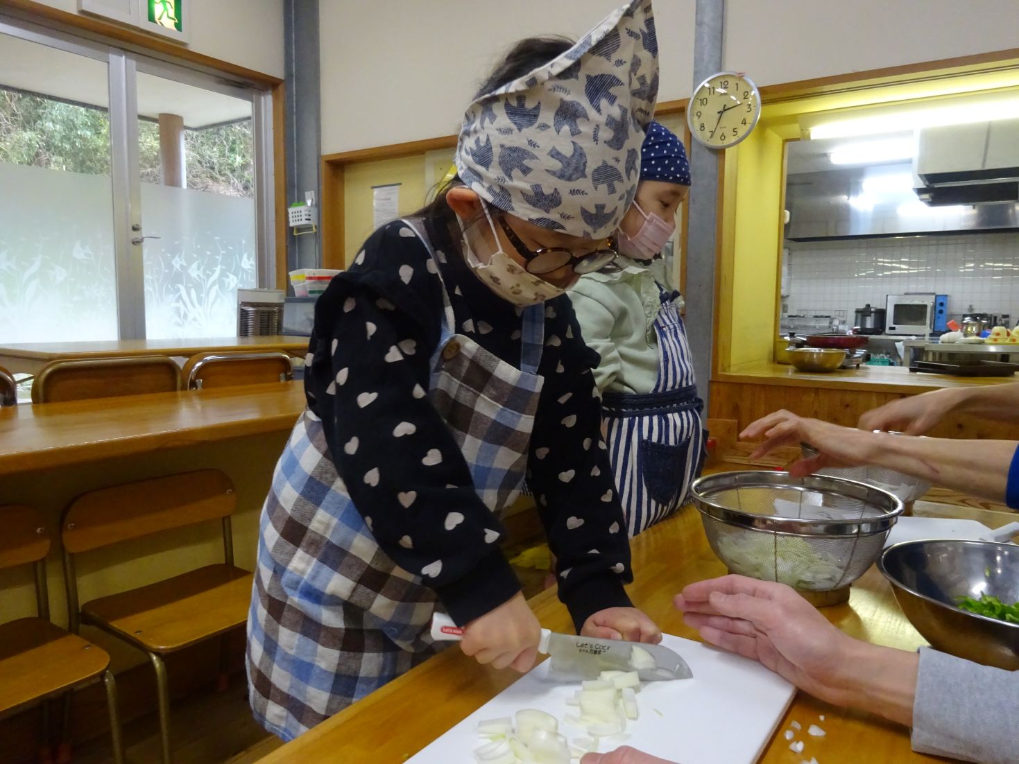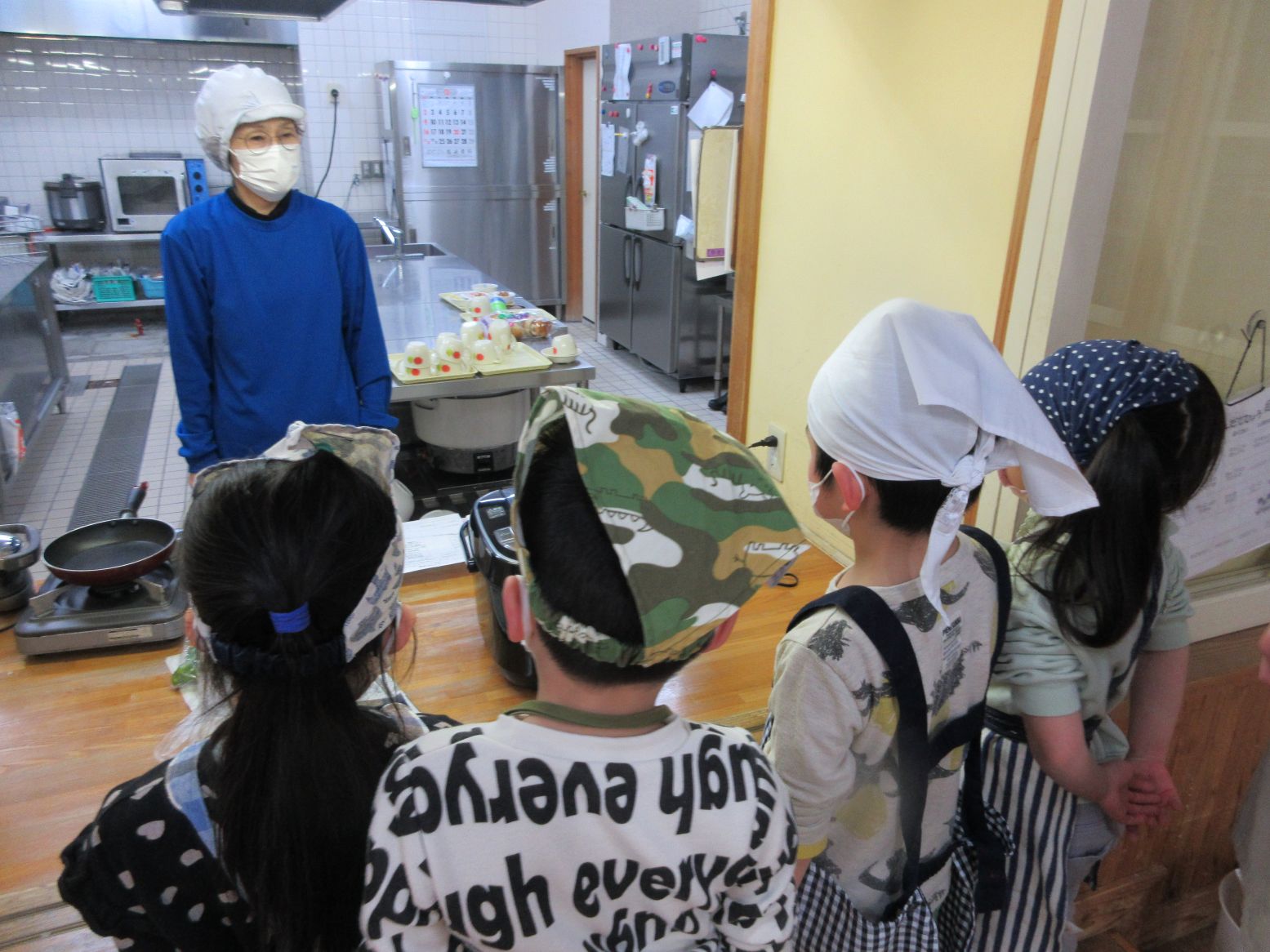 保育室ではもう一つの大イベント“給食当番交代式”をしました。年長児が給食お手伝いには「〇〇があったよ」と、教えてくれました。そして、お当番セットを贈呈し、今日のクッキングを終えました。