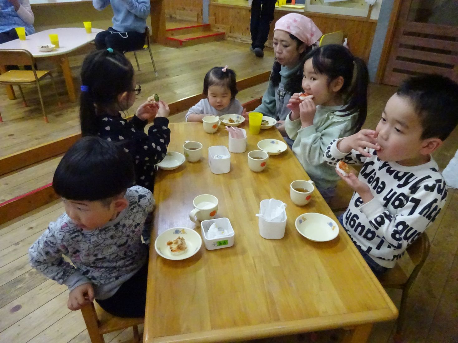 最後は会場の机の置き方もこども達が考えて、配置しました。みんなが「おいしい おいしい」と言って食べてくれたことに、大満足だったにじ組のこども達。保育室に戻ってから「あ~たのしかった♪」という言葉が聞かれました。