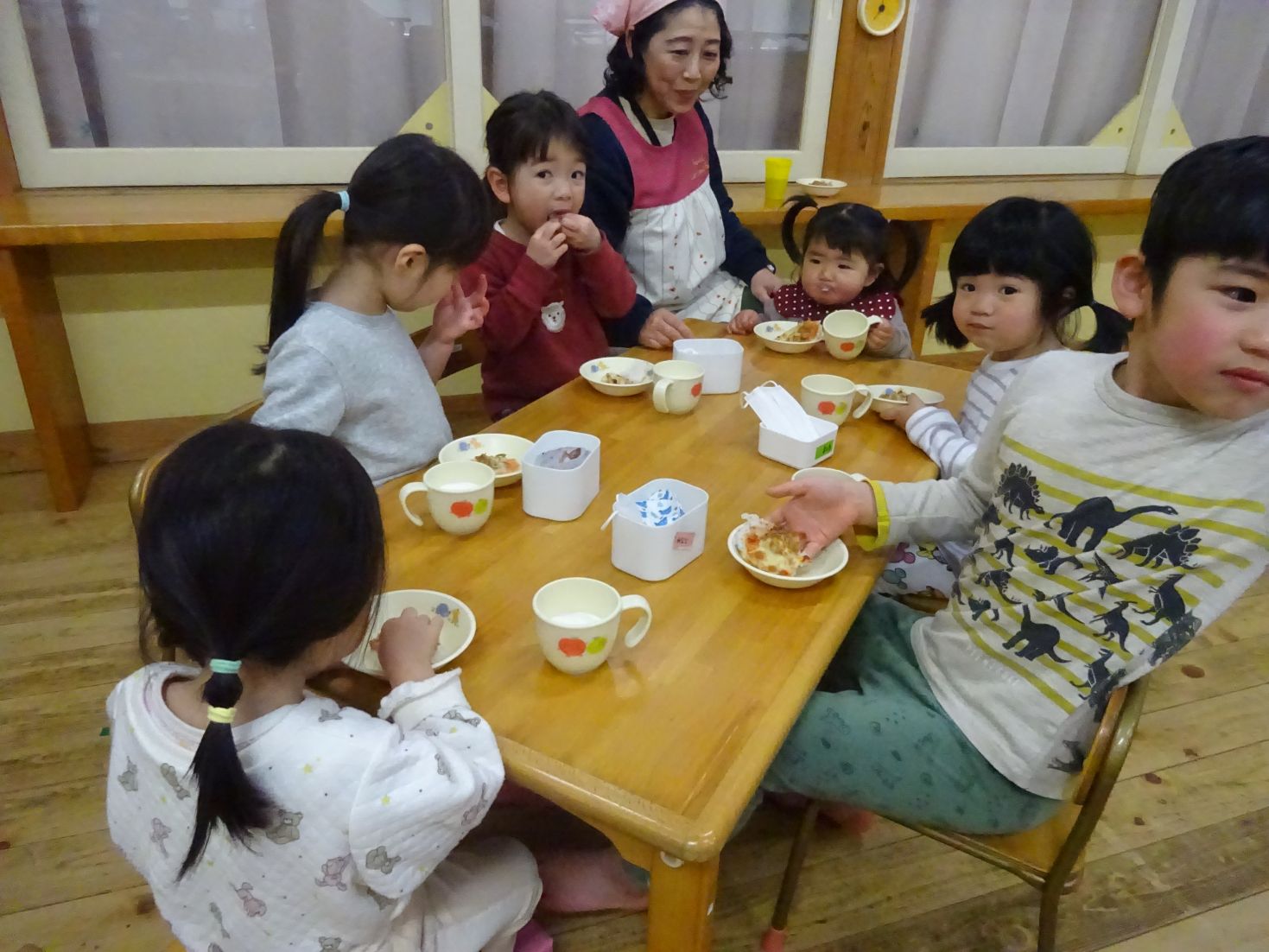 年長児:「きゅうしょくとうばん がんばってね」3歳児:「はい」