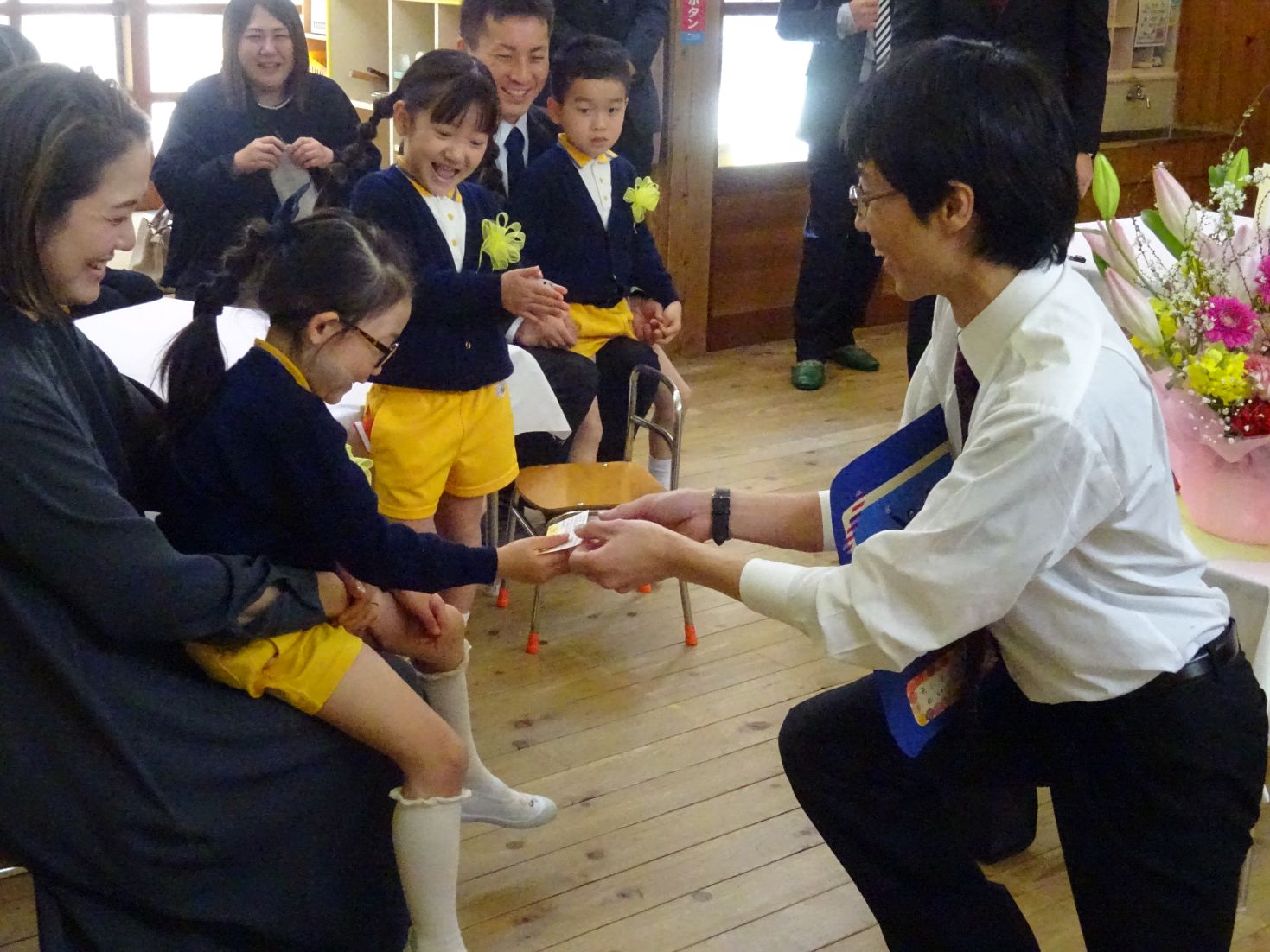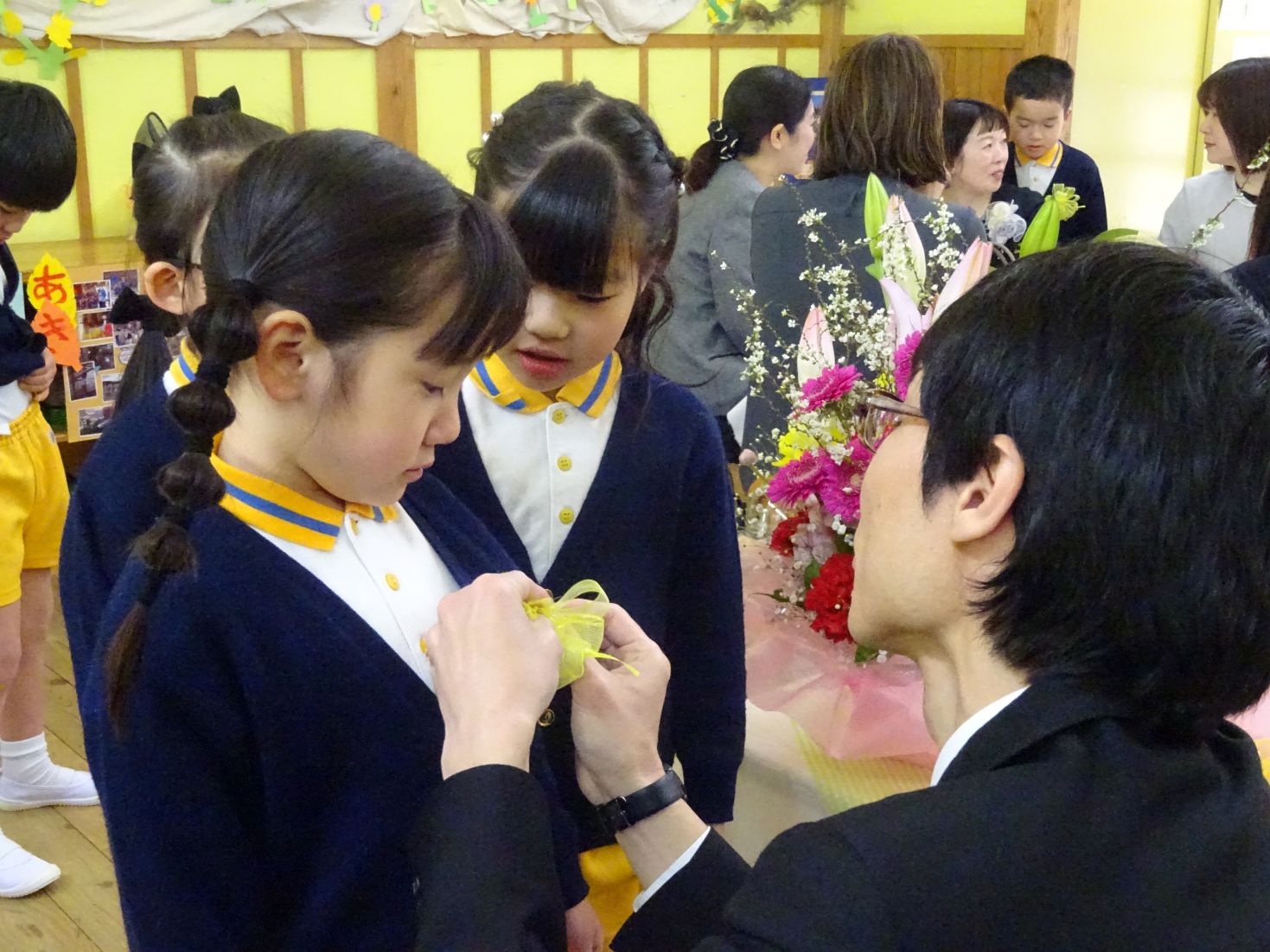 大好きな担任の先生にコサージュをつけてもらいます