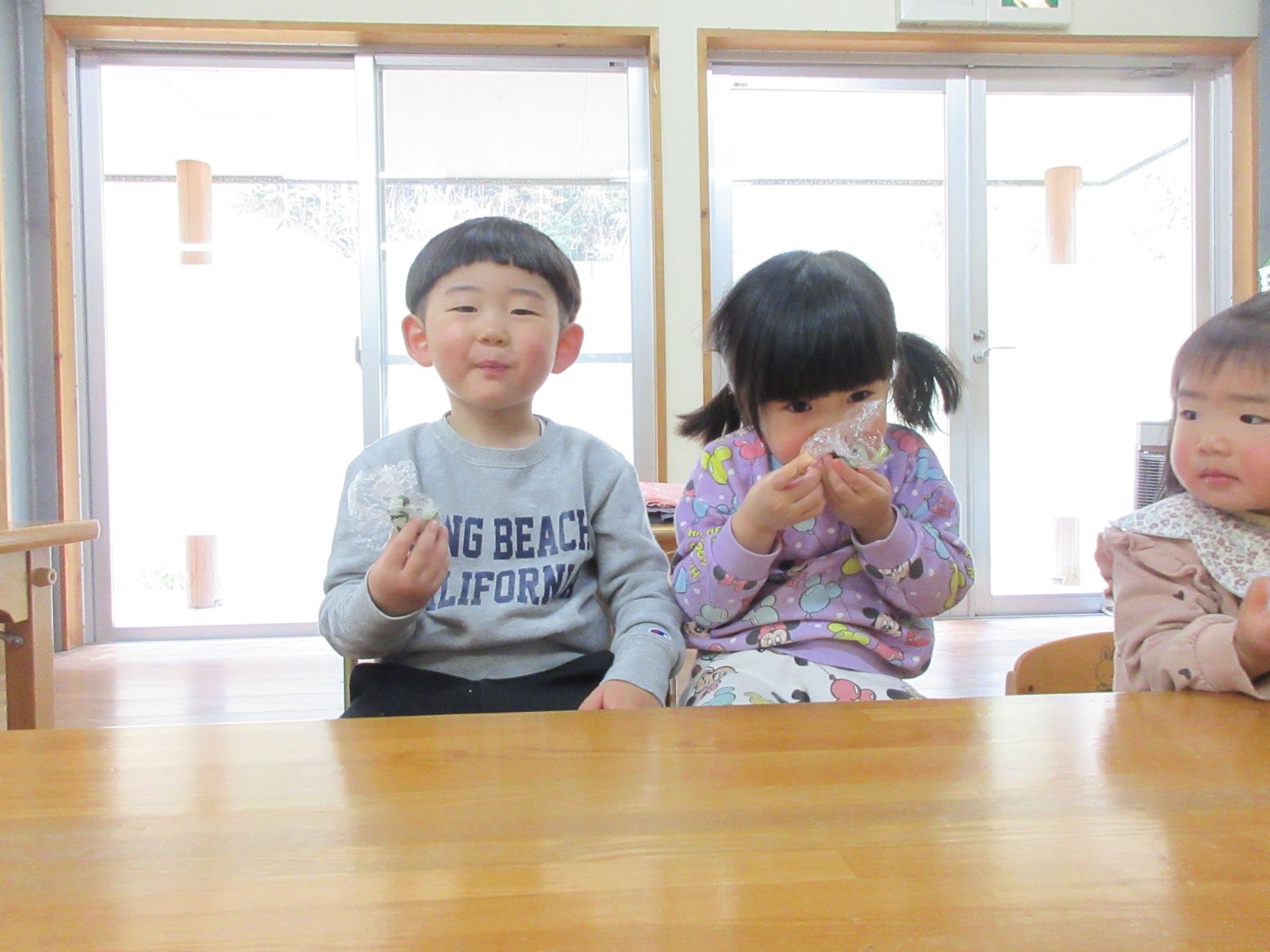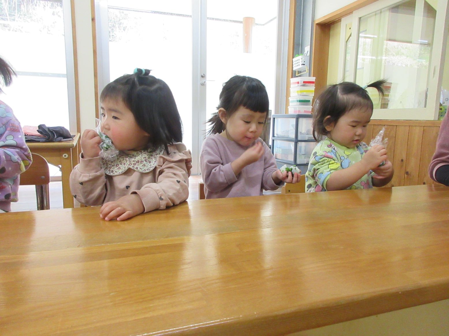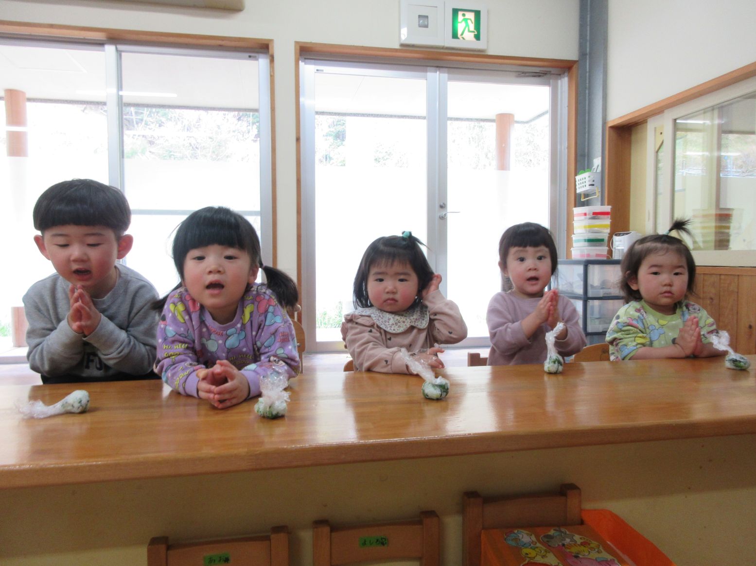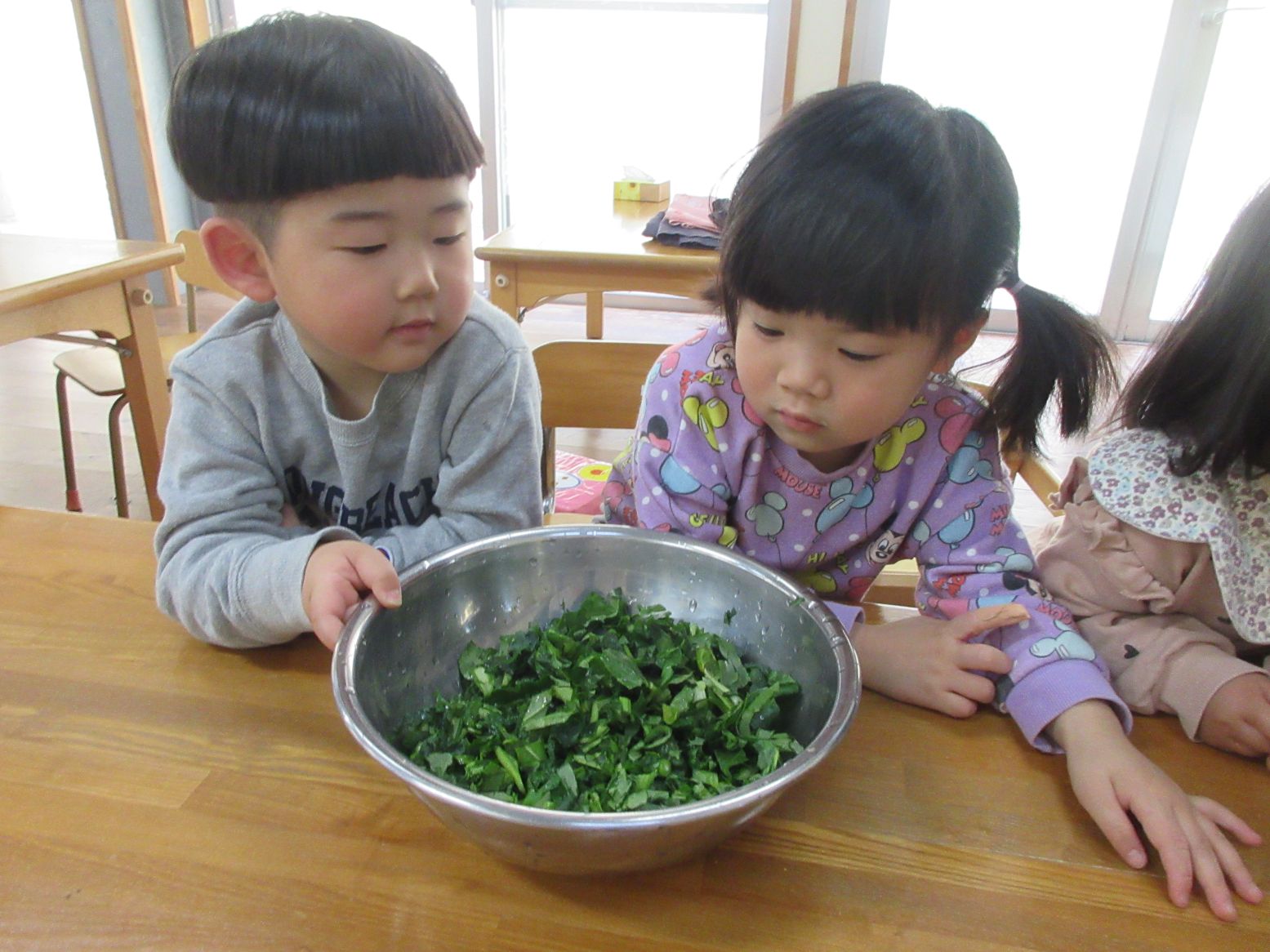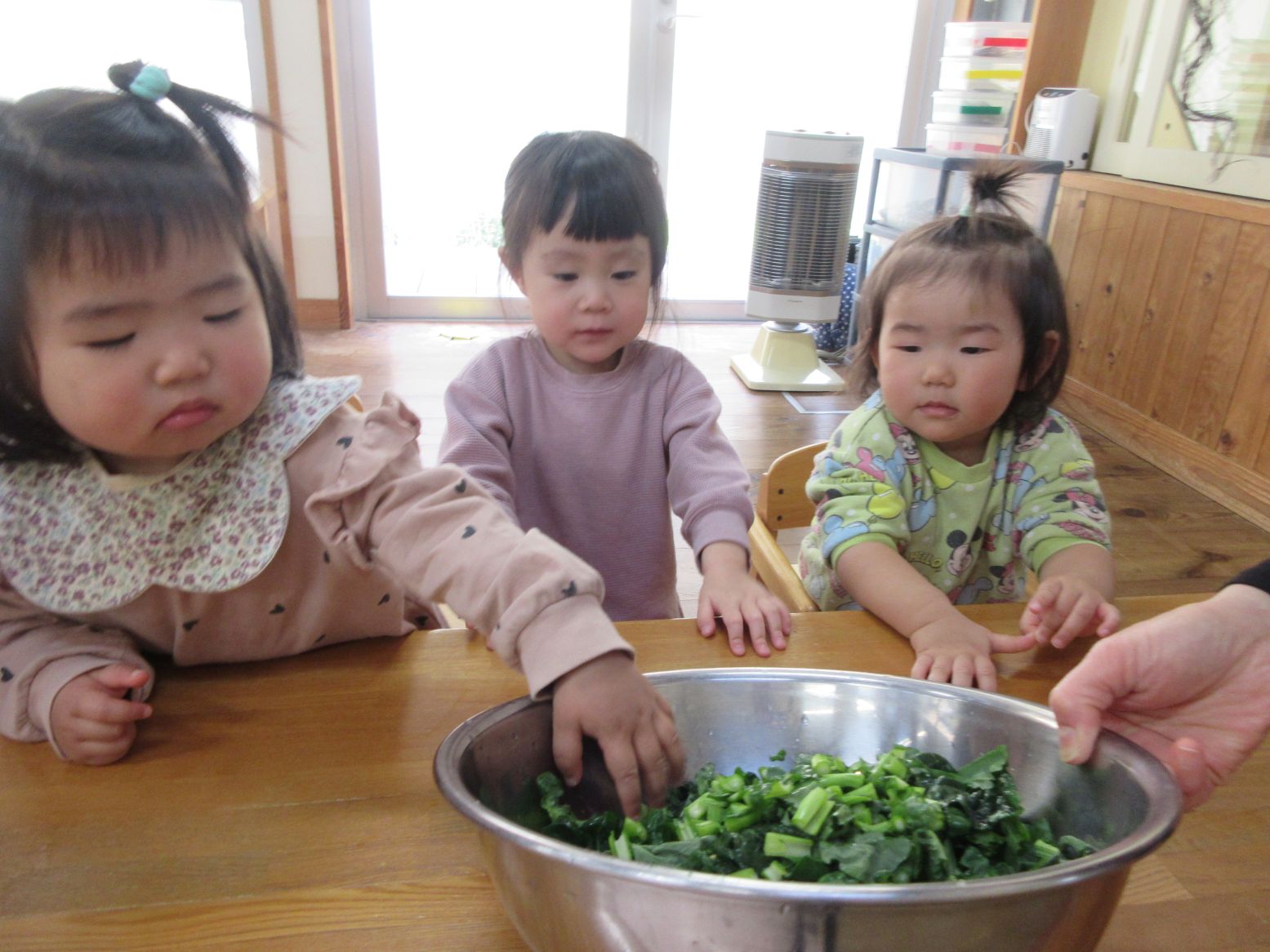 担任が切るのを見ていたこども達に、音が聞こえる?どんな香りがする?どんな味かな?と話しかけると「はっぱのにおいー」「はっぱのあじー」と返ってきました。「確かに!」と和やかな雰囲気になりました。