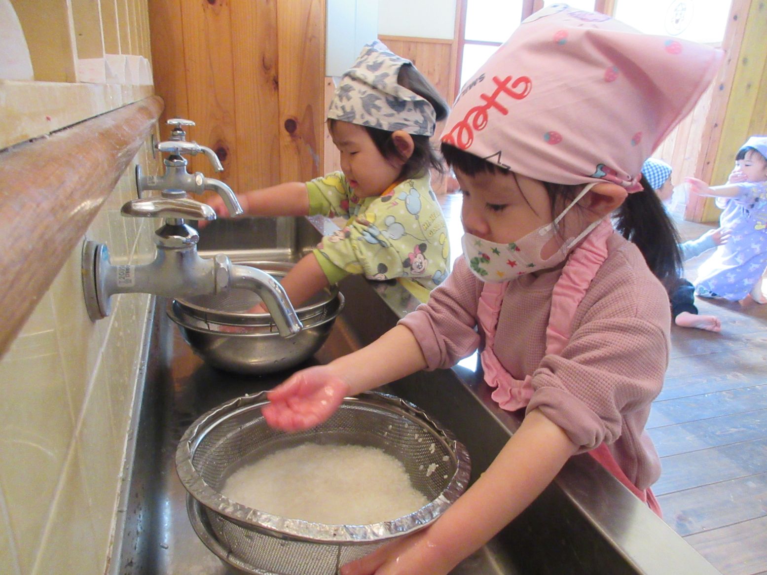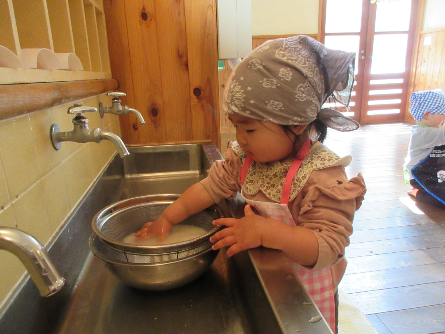 ざるを片方の手で押さえて、流石、2歳児は慣れたものです