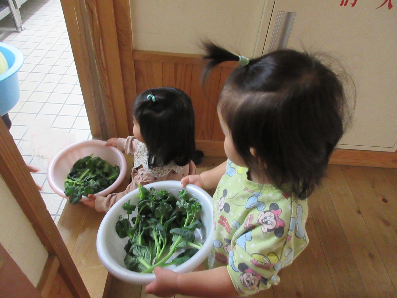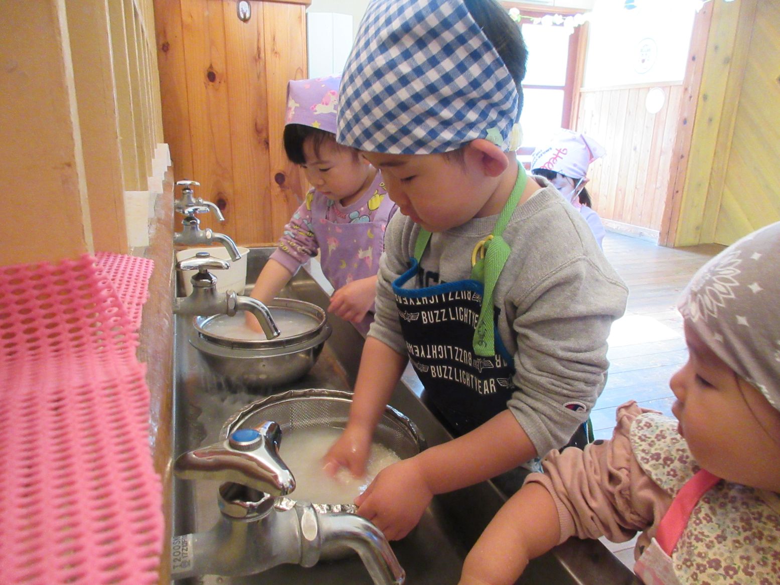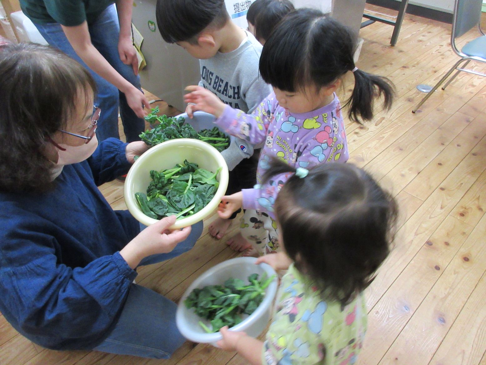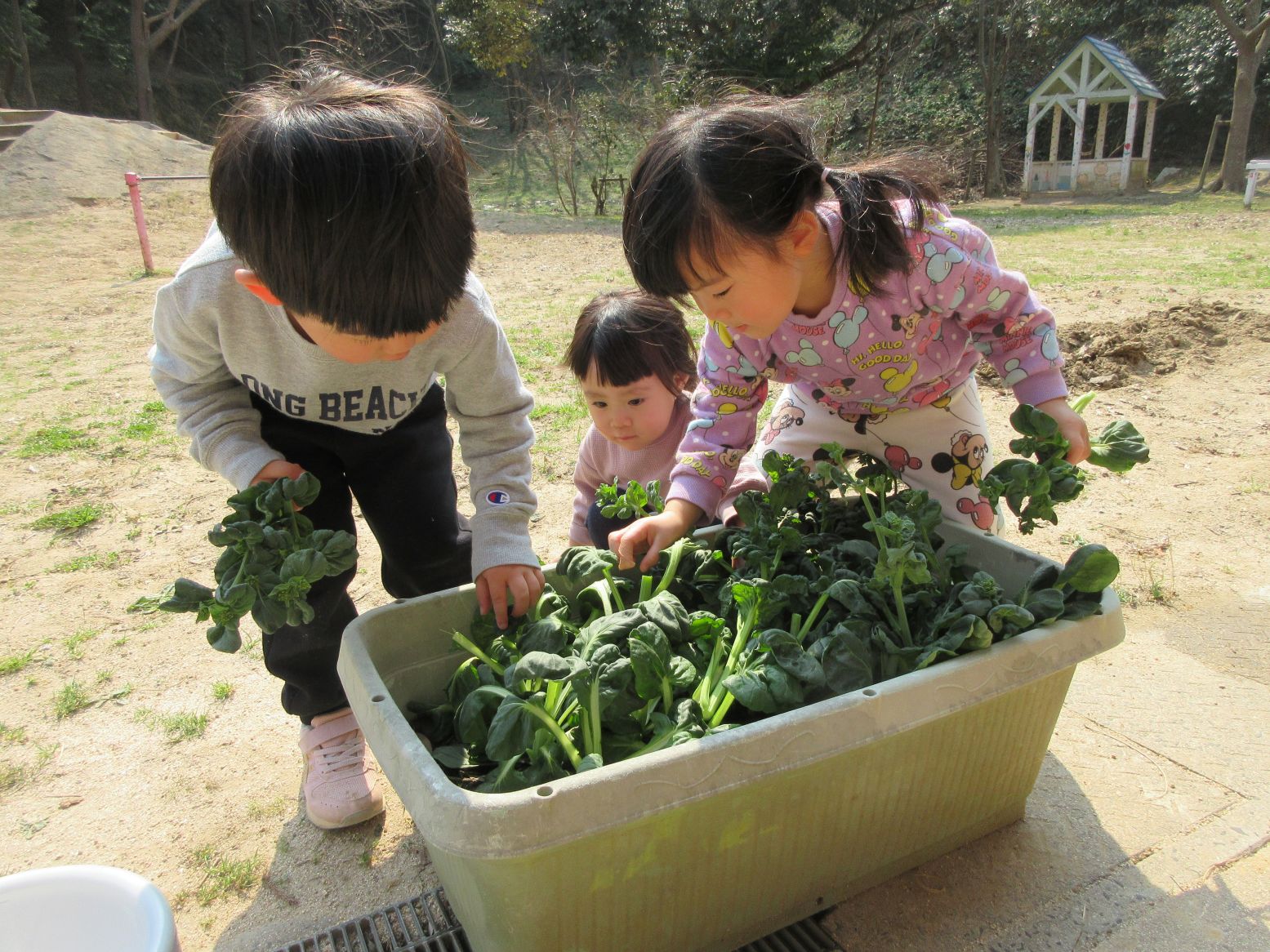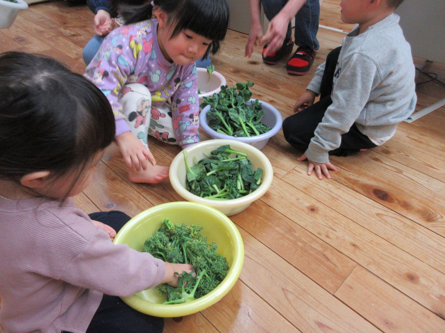 全員でお米をとぎ、1・2歳児がタァツァイとブロッコリーを収穫しました。