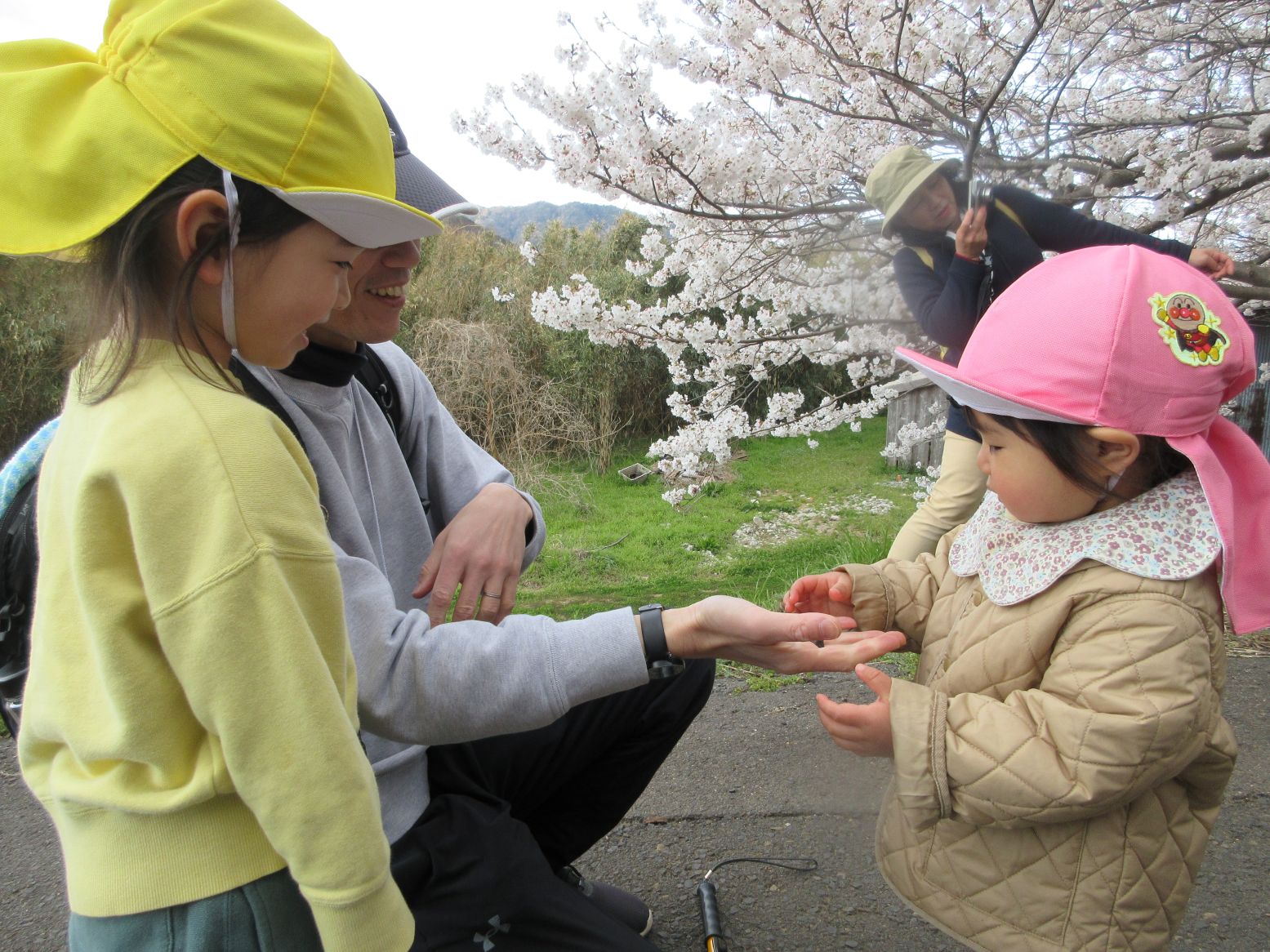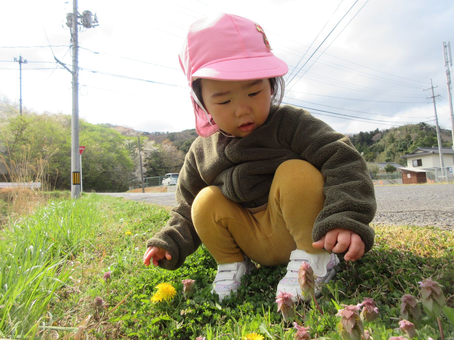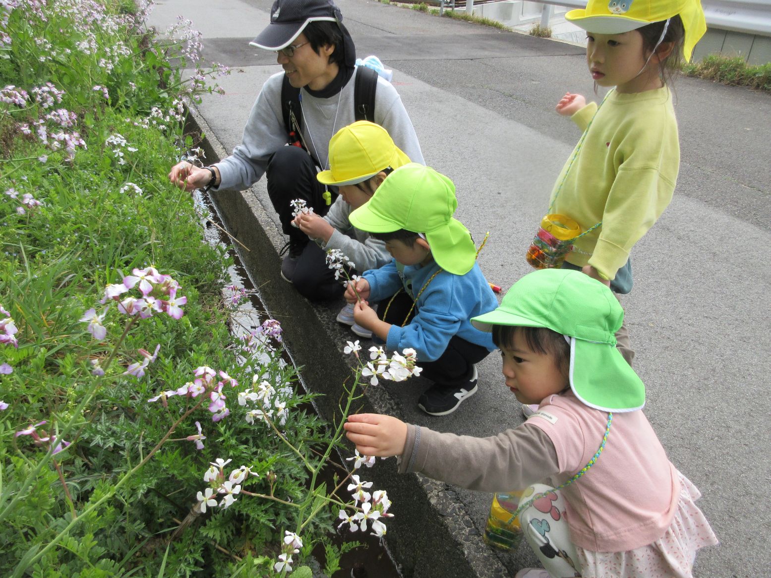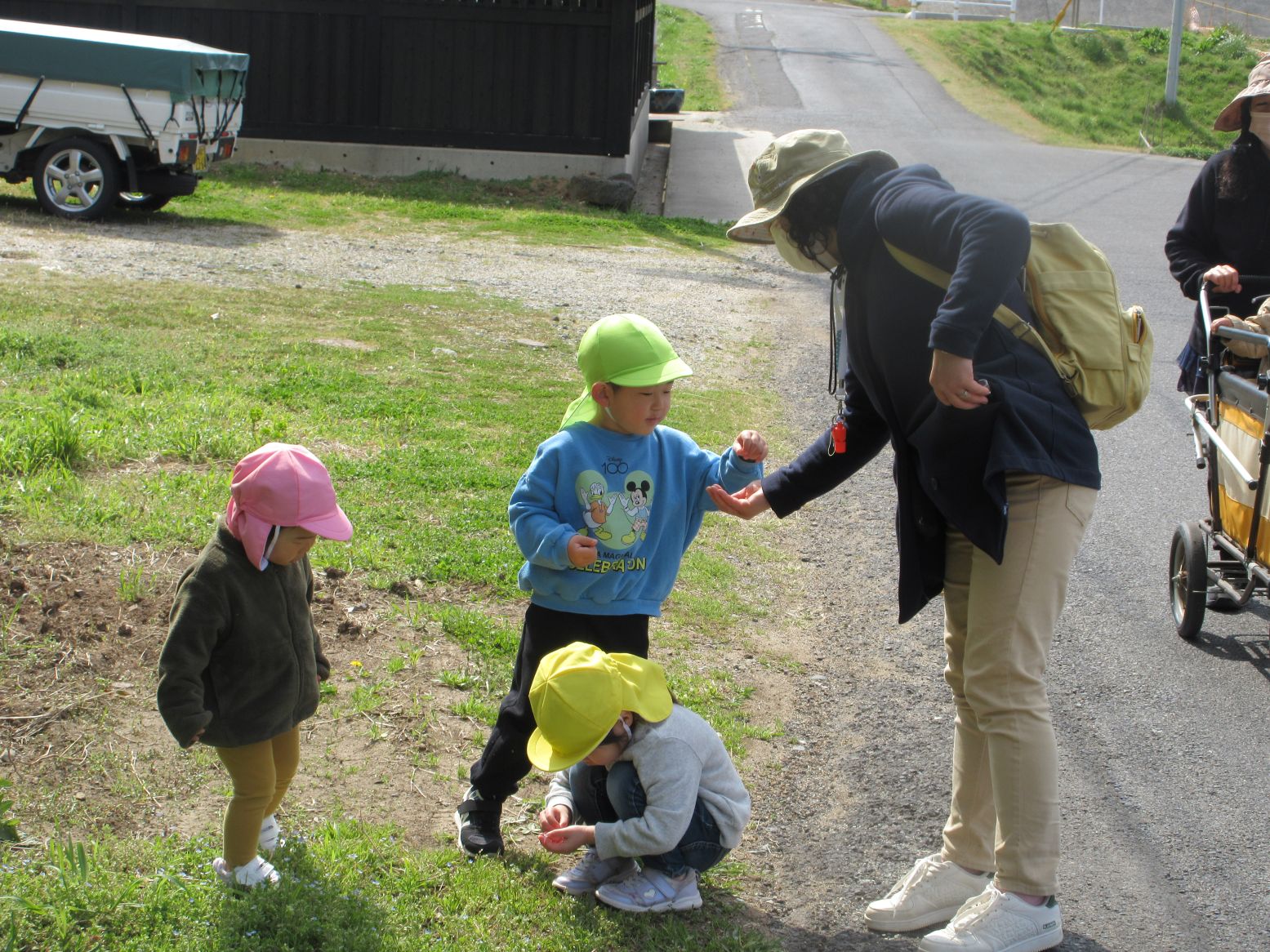 道中は、見つけた春の草花を知らせ合うかわいい姿がたくさん見られていました。じっくりお気に入りの花を探して摘み、宝物バッグに入れて持ち帰りました。