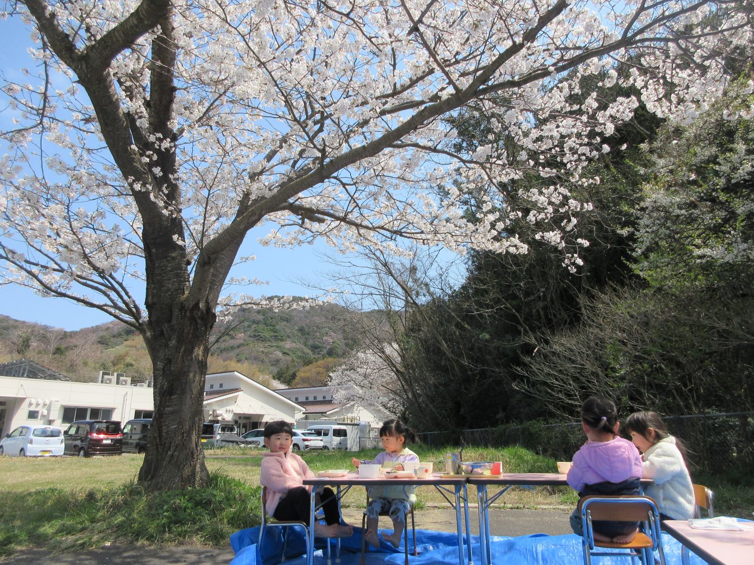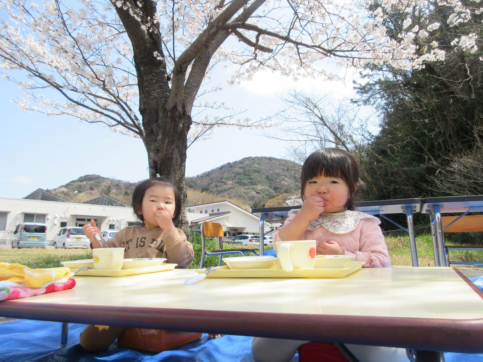 こども達はたくさん歩いて、たくさん遊んで、お腹ペコペコ…今日の給食は、桜が綺麗な保育所の駐車場で食べました。おかわりをたくさんしましたよ♪