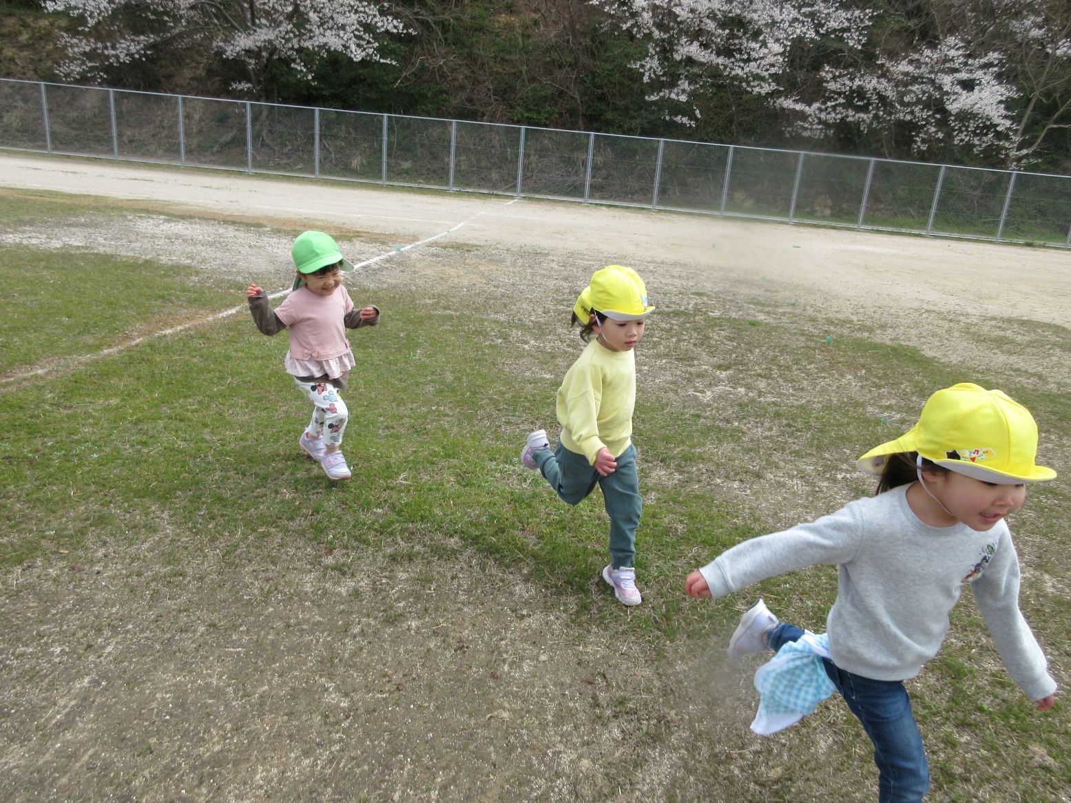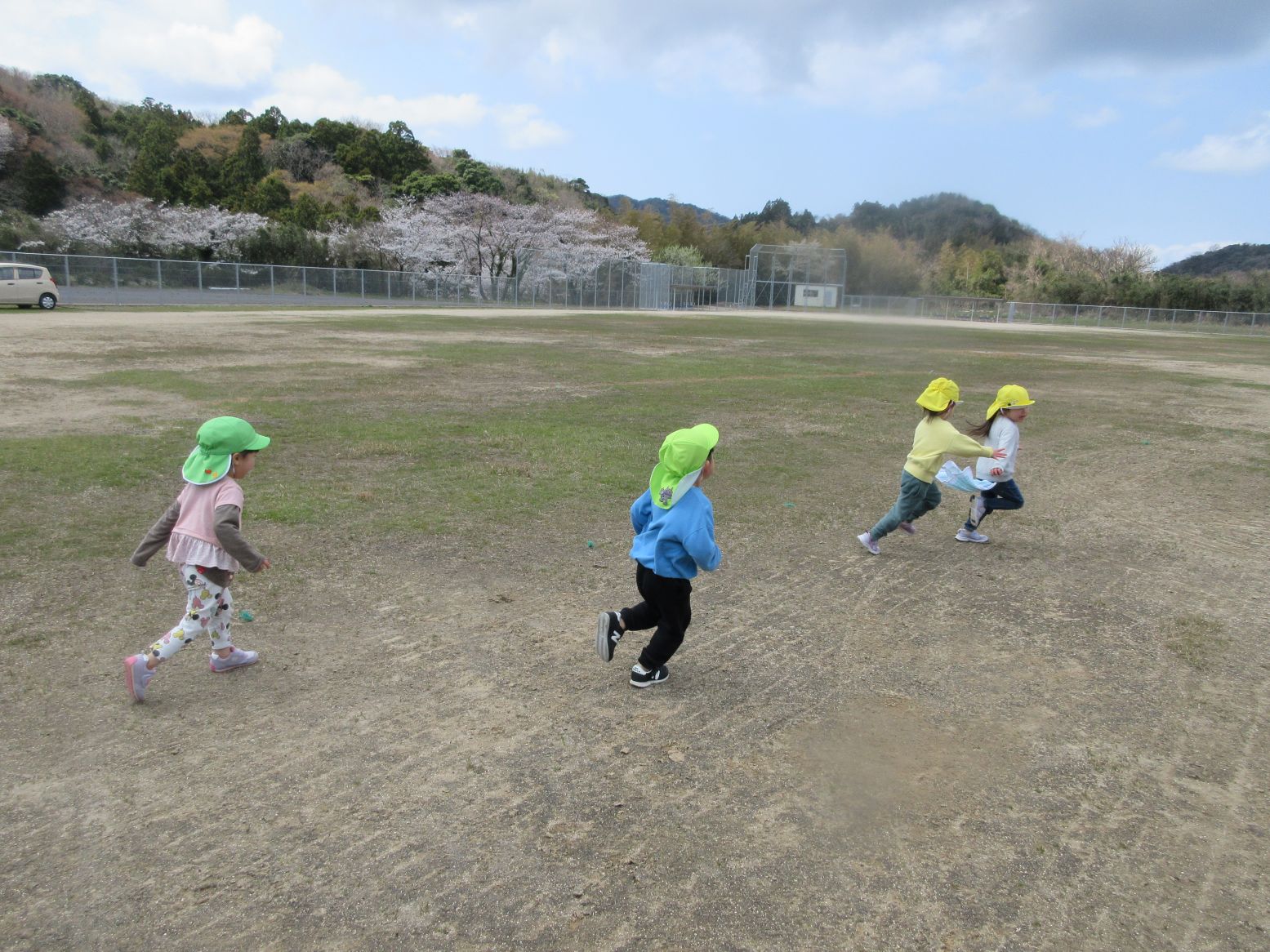 にじそら組は、色々な春の草花を見つけながらスポーツ広場へ。広場では、しっぽ取りの鬼ごっこを、思いきり楽しみました。