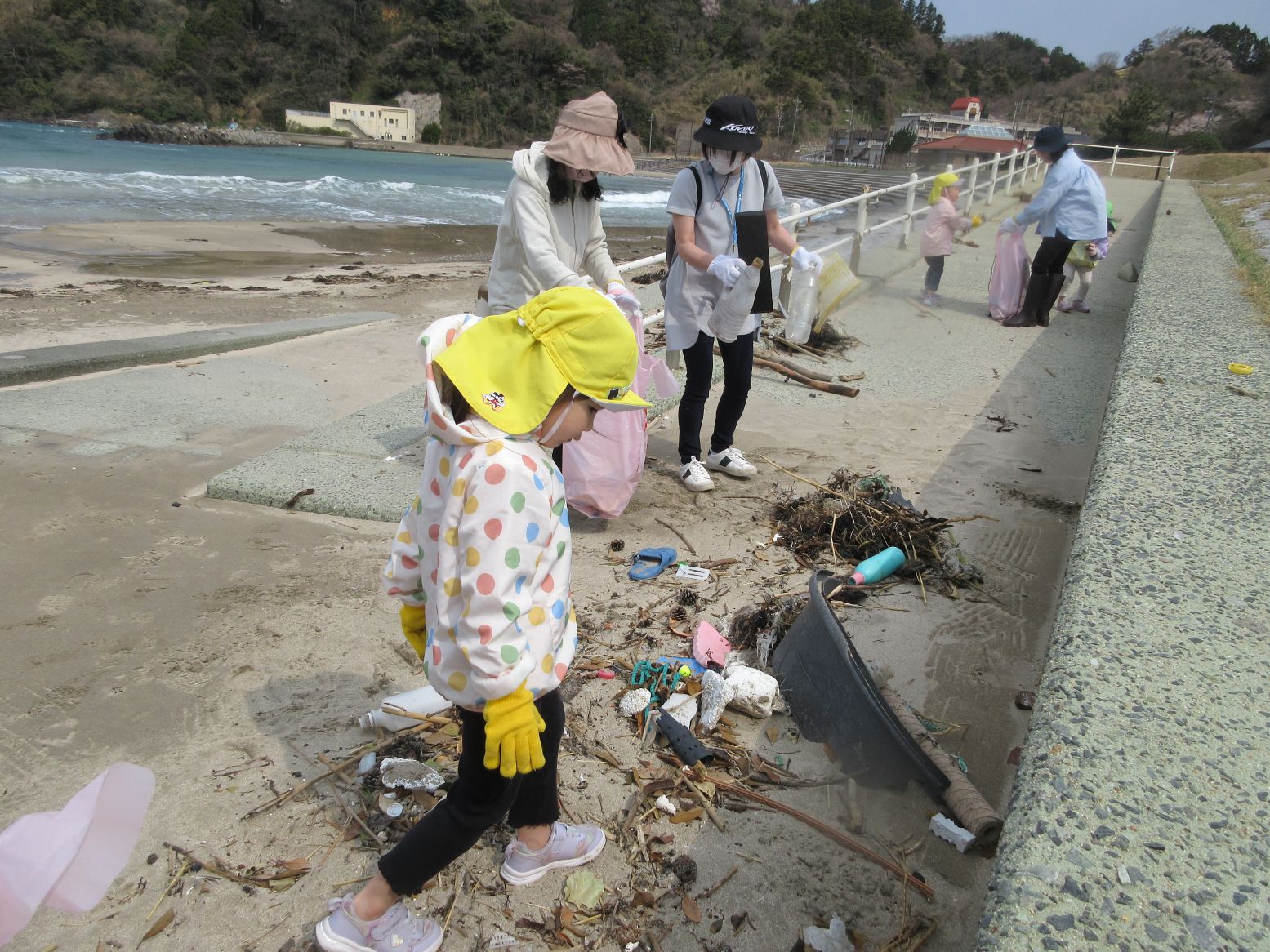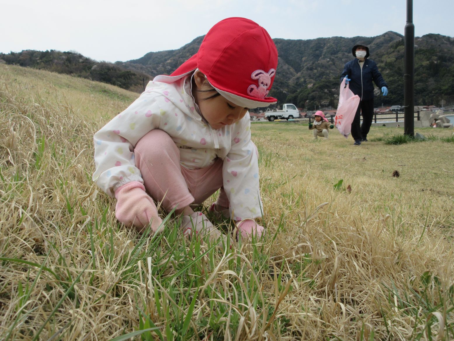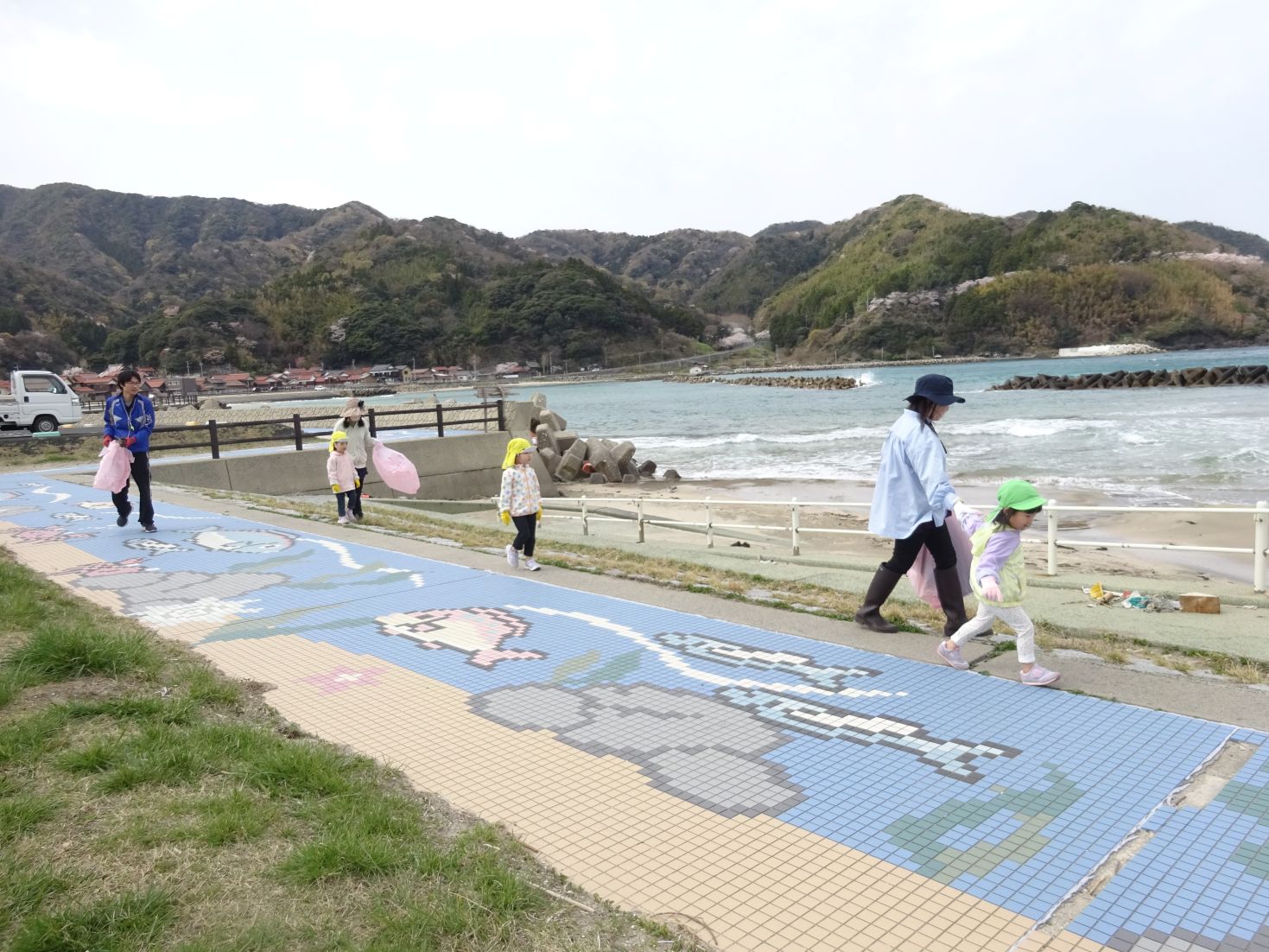 道中、風が強く吹く中を歩いて行くと、目の前には波しぶきをあげる海が見えてきました。この風で、ゴミが流れて来ていました。今日は、海から離れて芝生を中心に、安全に考慮して行いました。