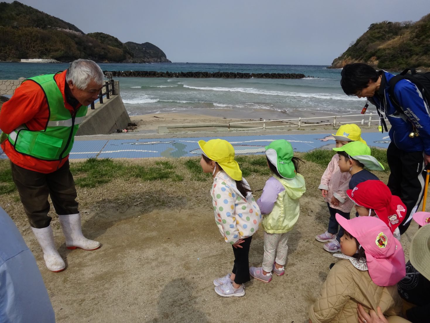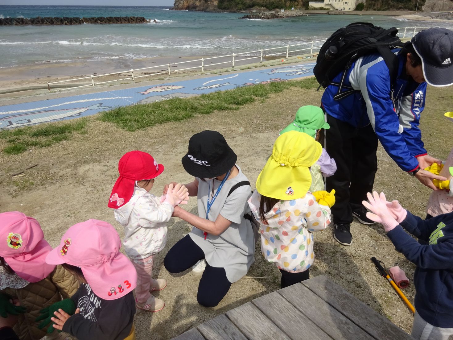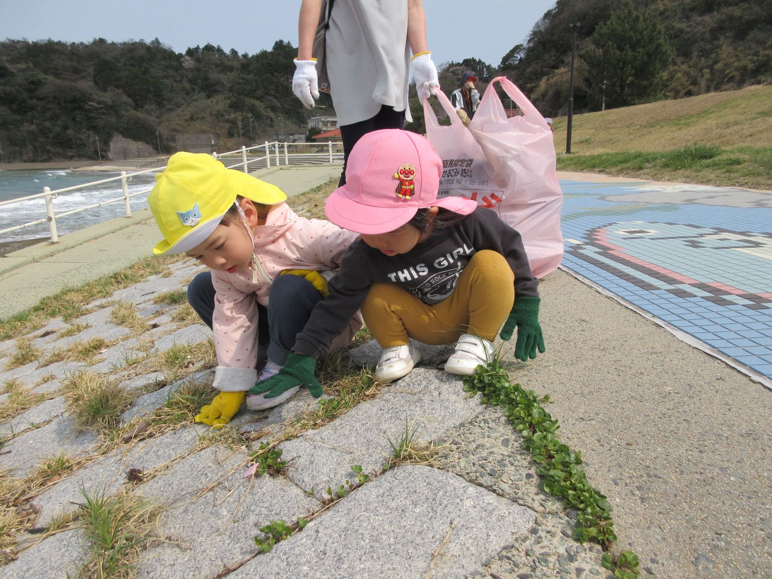 道中、風が強く吹く中を歩いて行くと、目の前には波しぶきをあげる海が見えてきました。この風で、ゴミが流れて来ていました。今日は、海から離れて芝生を中心に、安全に考慮して行いました。