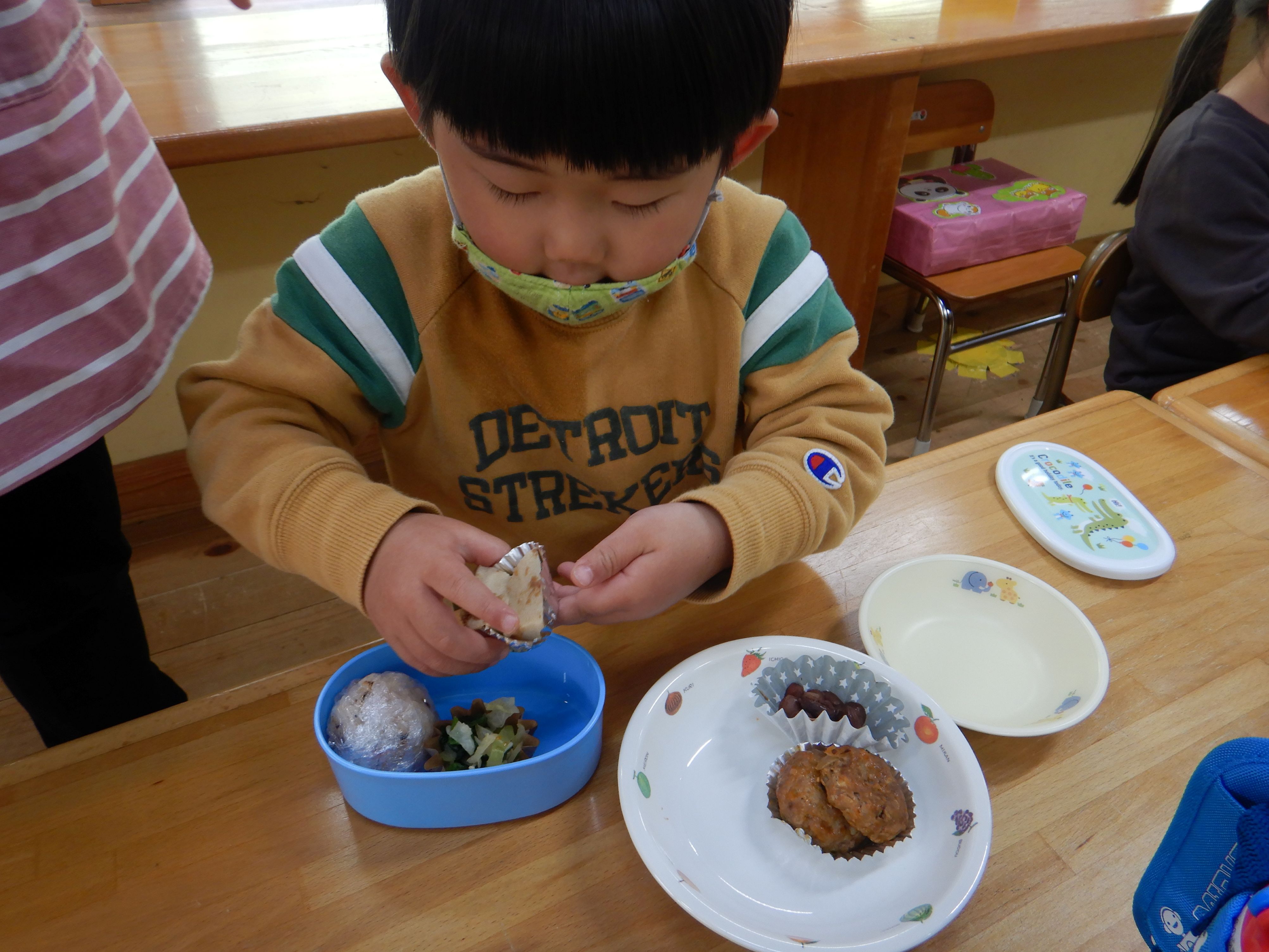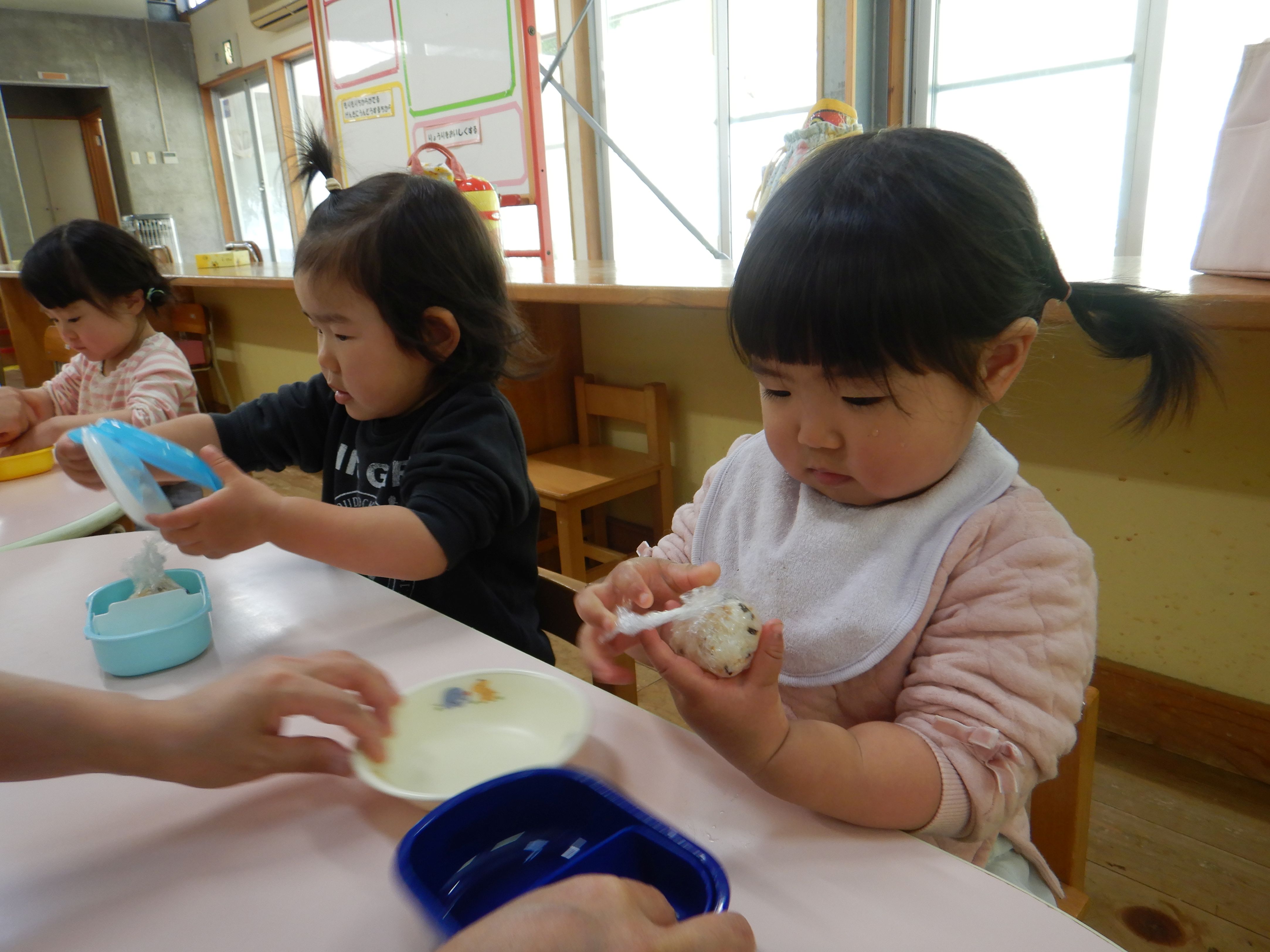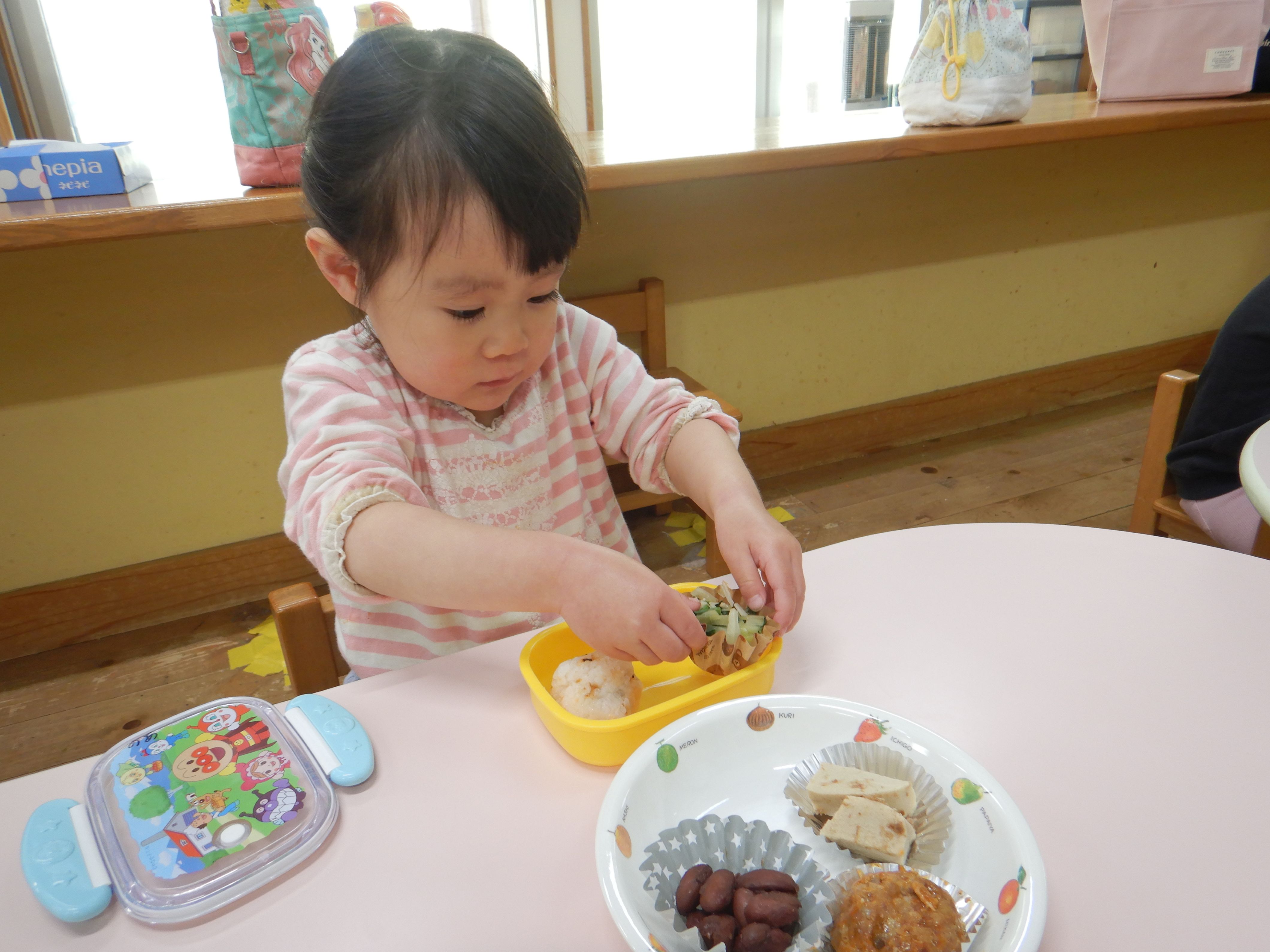今年度は誕生会のない月に、保育所のみんなで集まって楽しく過ごす”お楽しみ会”の日を設けることにしました。第1回目の今日は、スポーツ広場にお散歩に行きました。1歳児のペースに合わせてゆっくりと歩くと、野いちごの花やカラスノエンドウ、タケノコなどたくさんの春を見つけることが出来ました。保育所に帰り、家庭から持ってきた弁当箱に給食を詰めて、テラスで給食弁当を食べました。弁当箱に入った給食が嬉しくて、美味しくてみんなたくさんおかわりをして食べました。