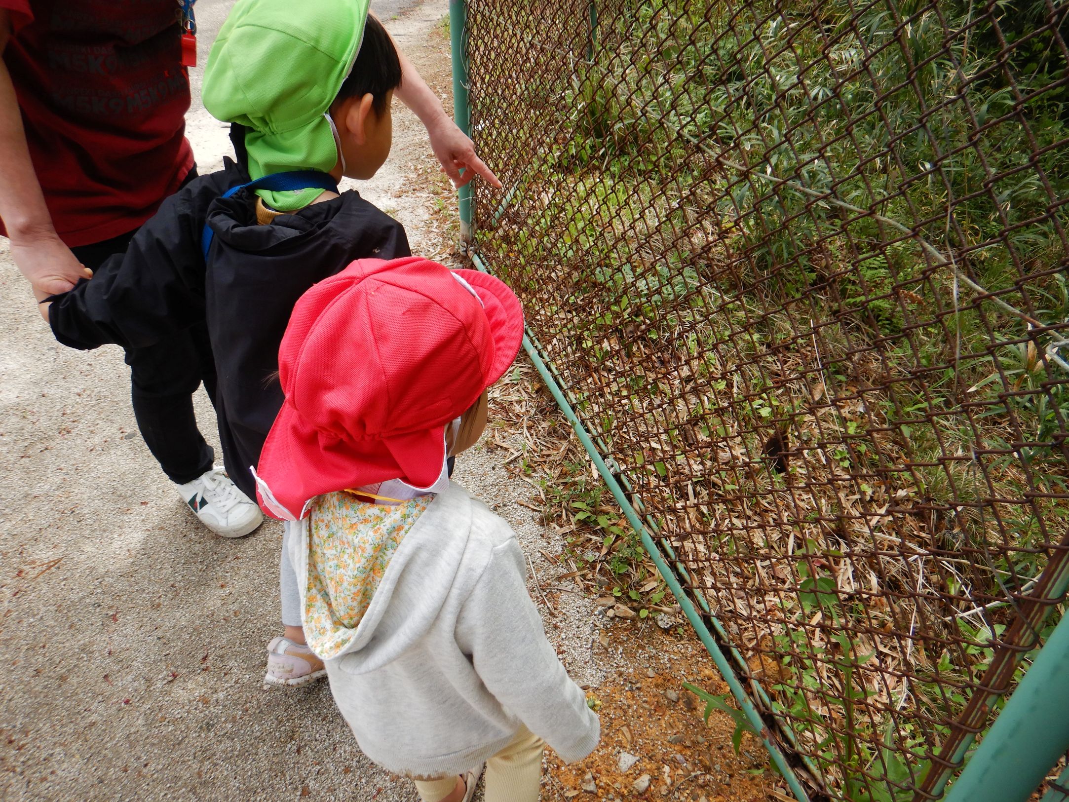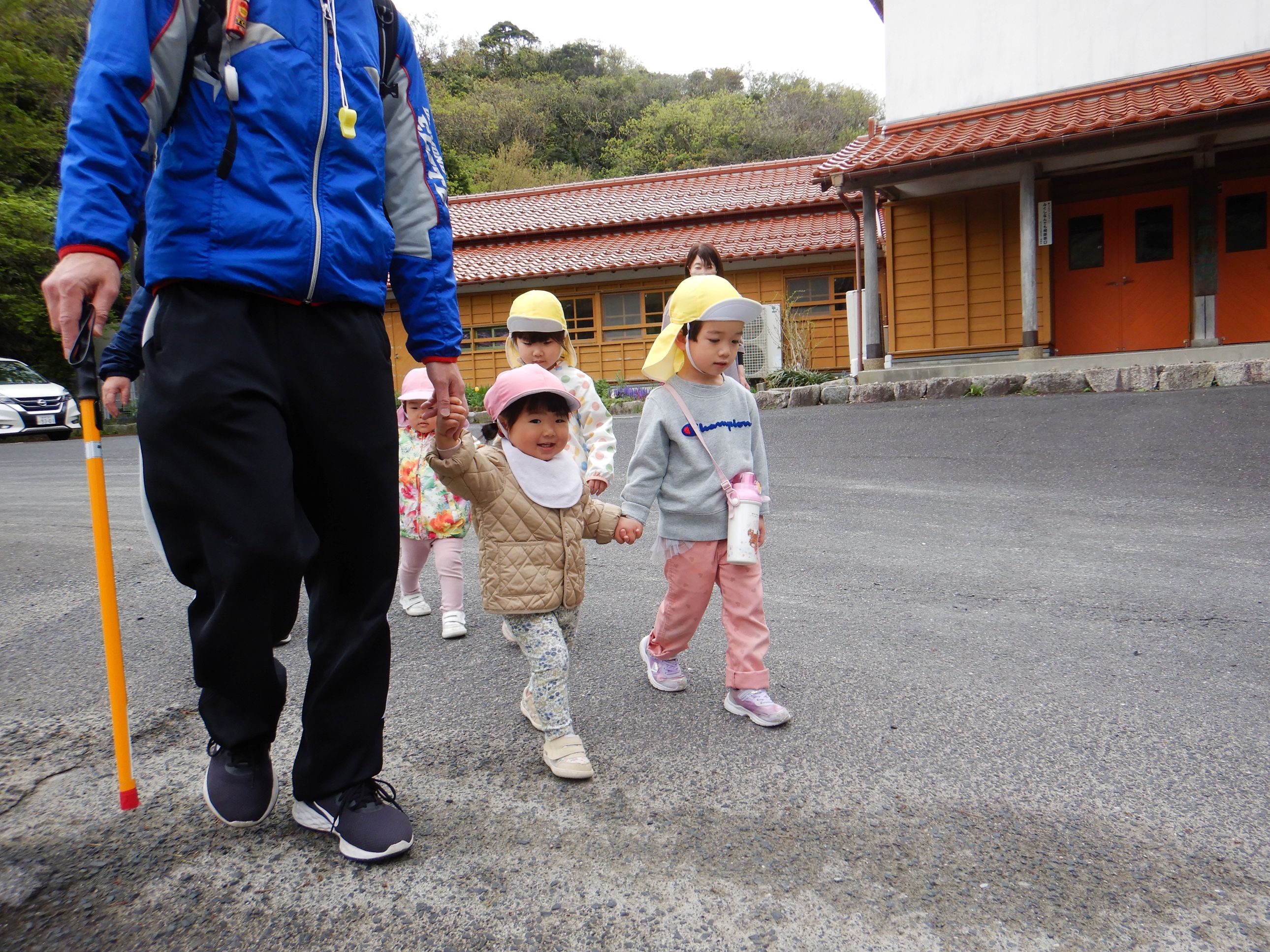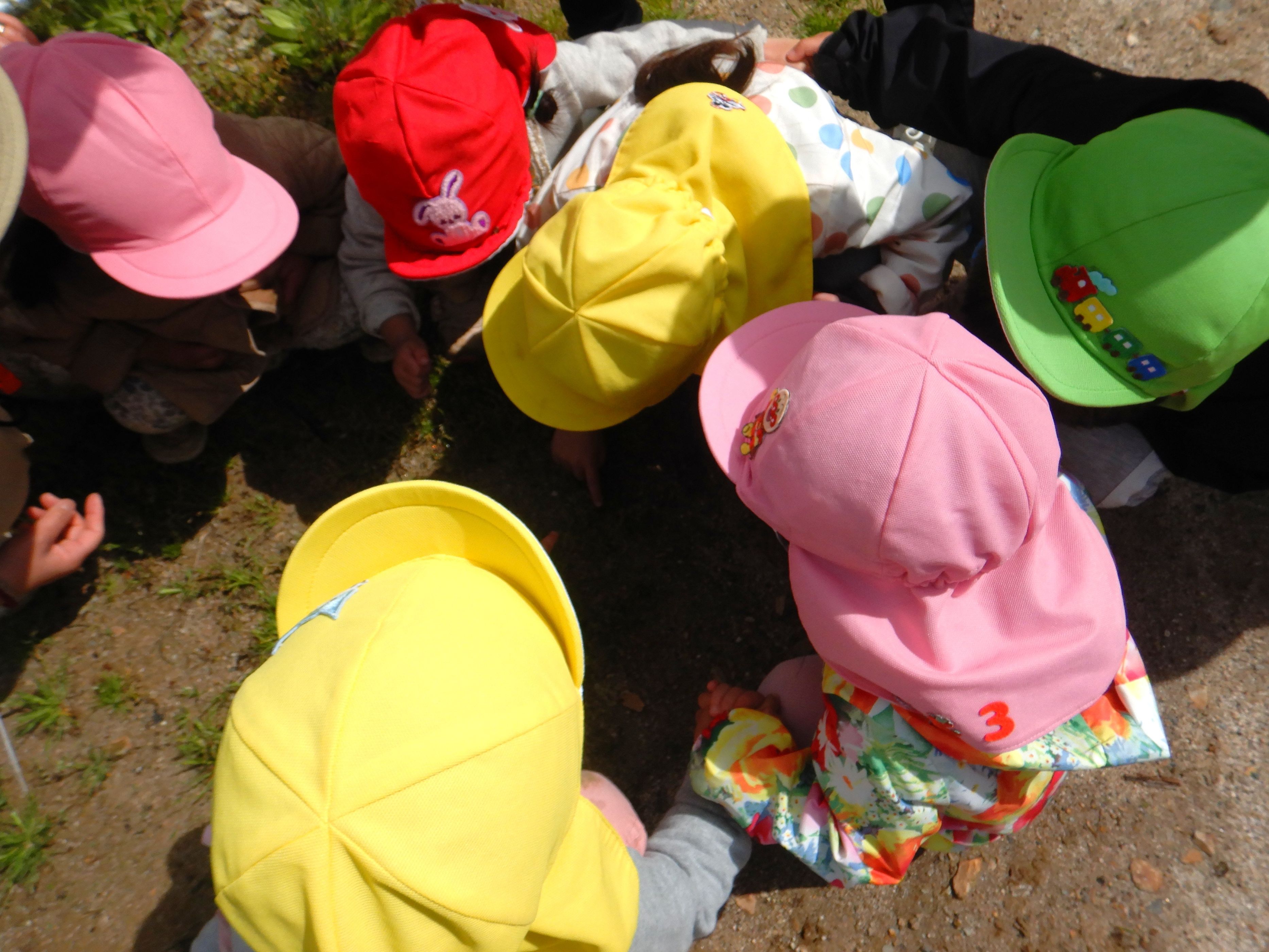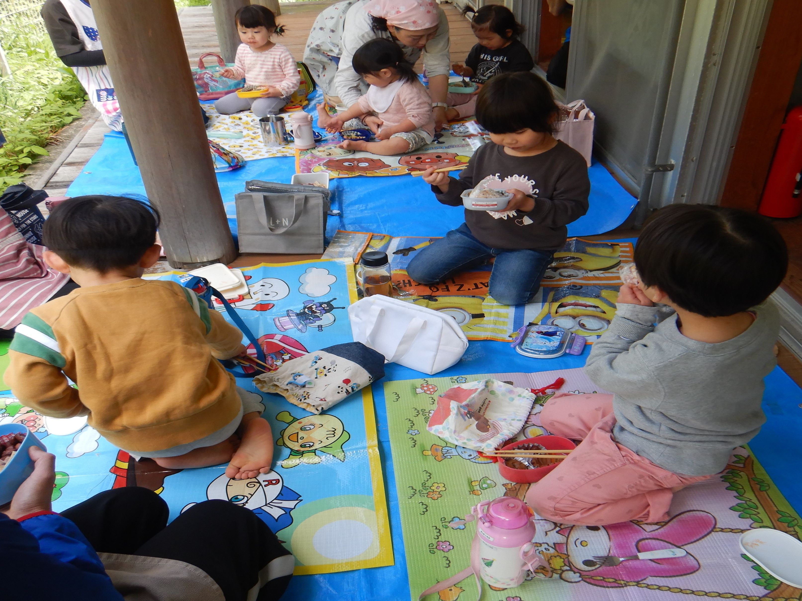 今年度は誕生会のない月に、保育所のみんなで集まって楽しく過ごす”お楽しみ会”の日を設けることにしました。第1回目の今日は、スポーツ広場にお散歩に行きました。1歳児のペースに合わせてゆっくりと歩くと、野いちごの花やカラスノエンドウ、タケノコなどたくさんの春を見つけることが出来ました。保育所に帰り、家庭から持ってきた弁当箱に給食を詰めて、テラスで給食弁当を食べました。弁当箱に入った給食が嬉しくて、美味しくてみんなたくさんおかわりをして食べました。