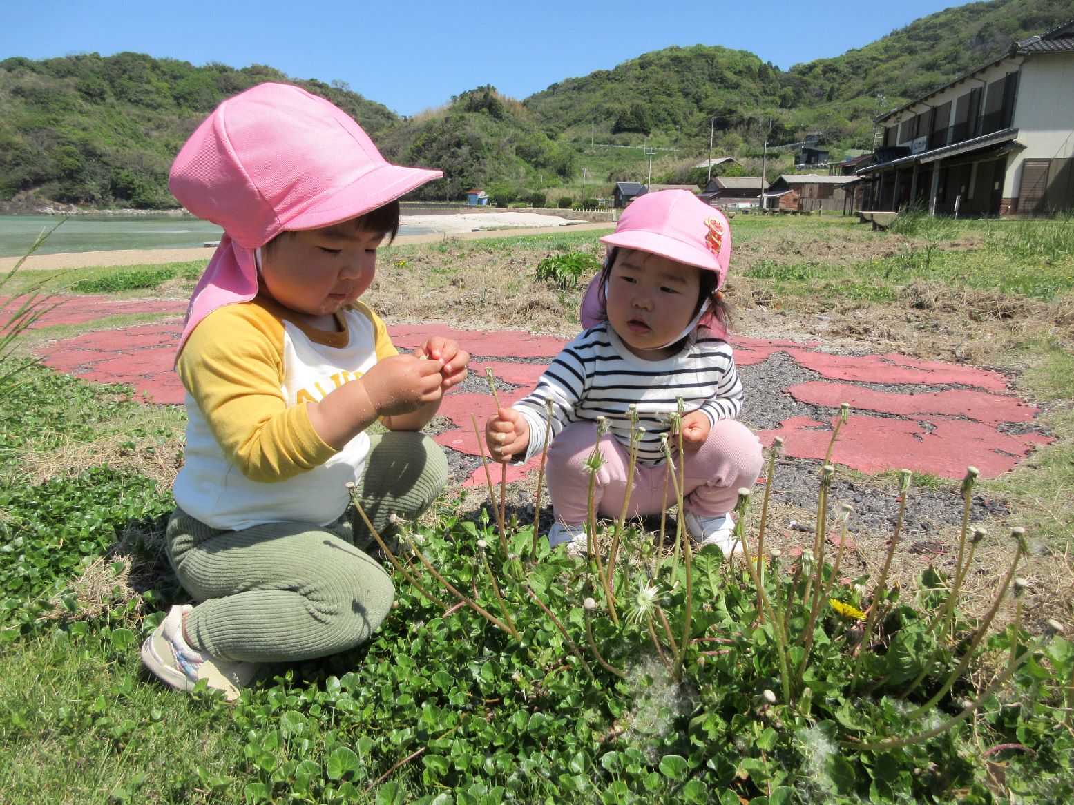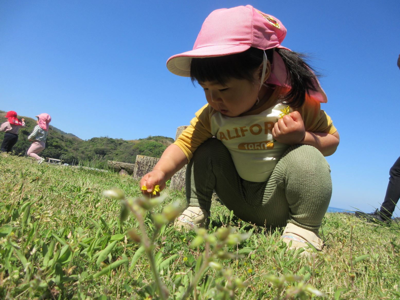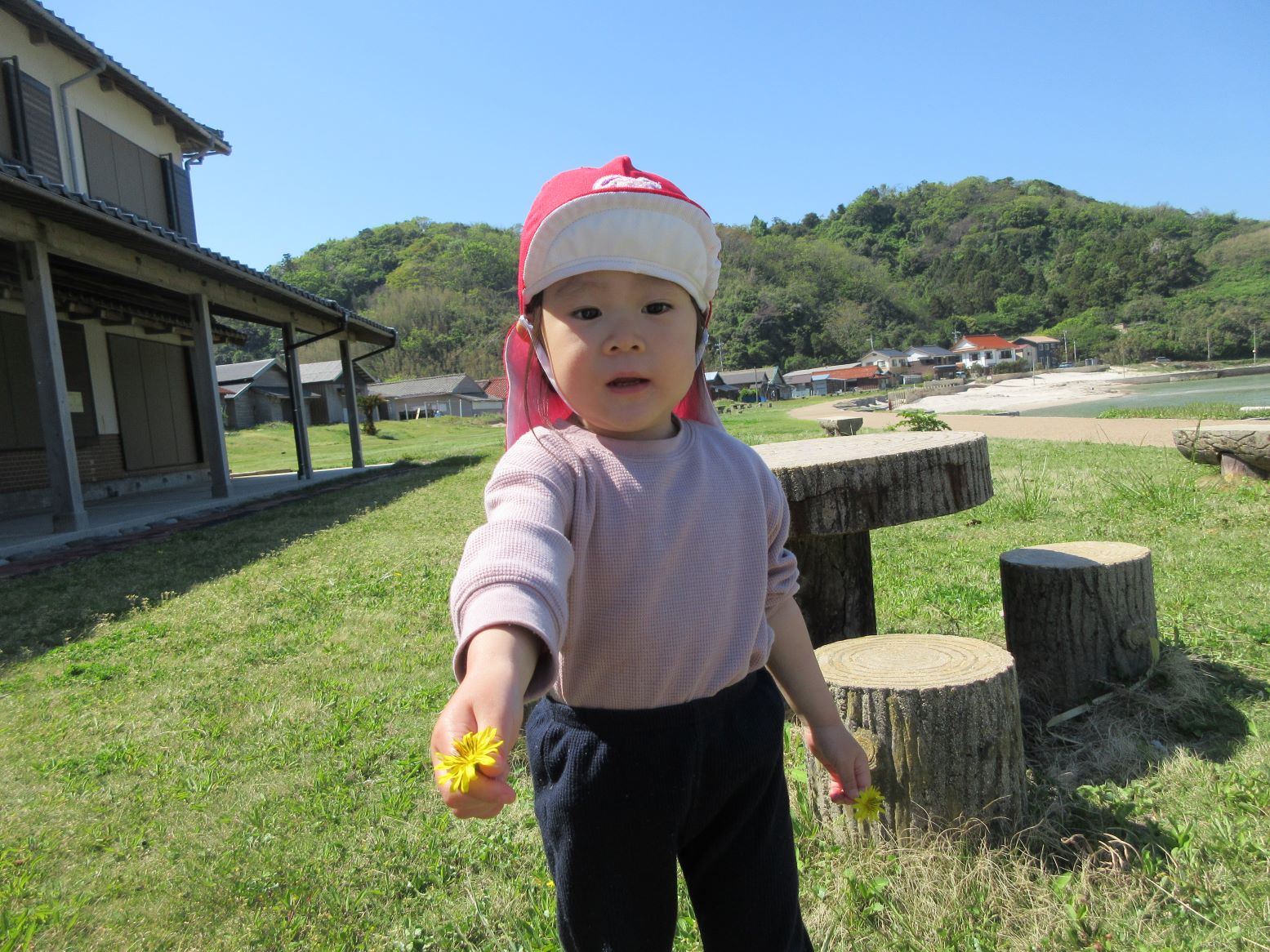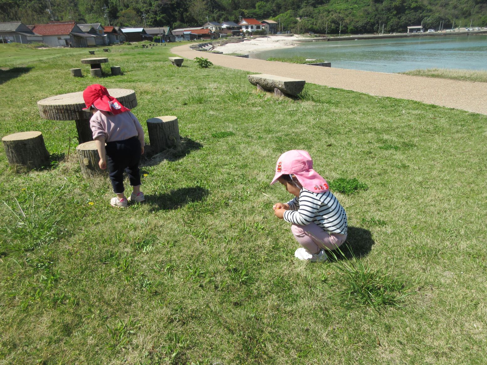 芝生で花を見つけて摘んだり、浜に下りて砂のさらさら感を楽しんだり、貝殻探しをしたり…。途中、とんびが空高く飛んでいる影が地面を動いたり自分の体にかかったりすることに気付いたこどもが、空を見上げてとんびを探していました。いろいろな発見がありました。