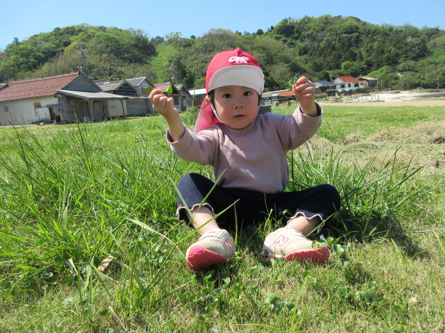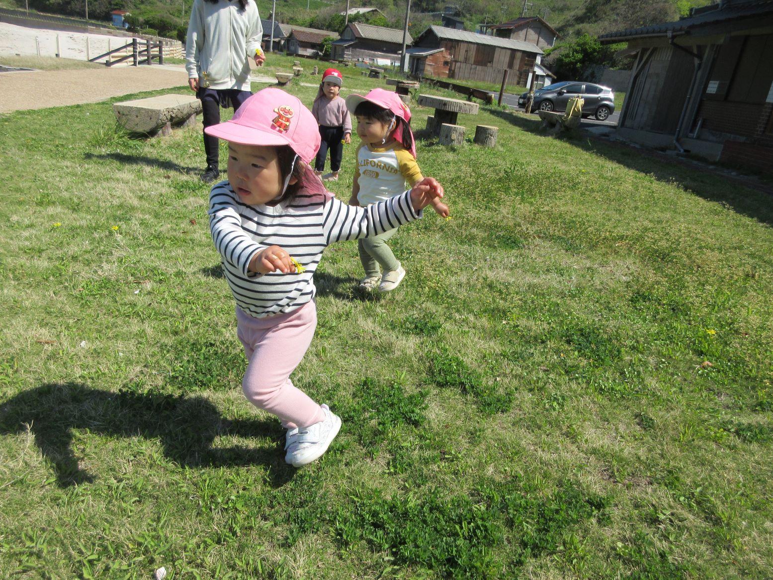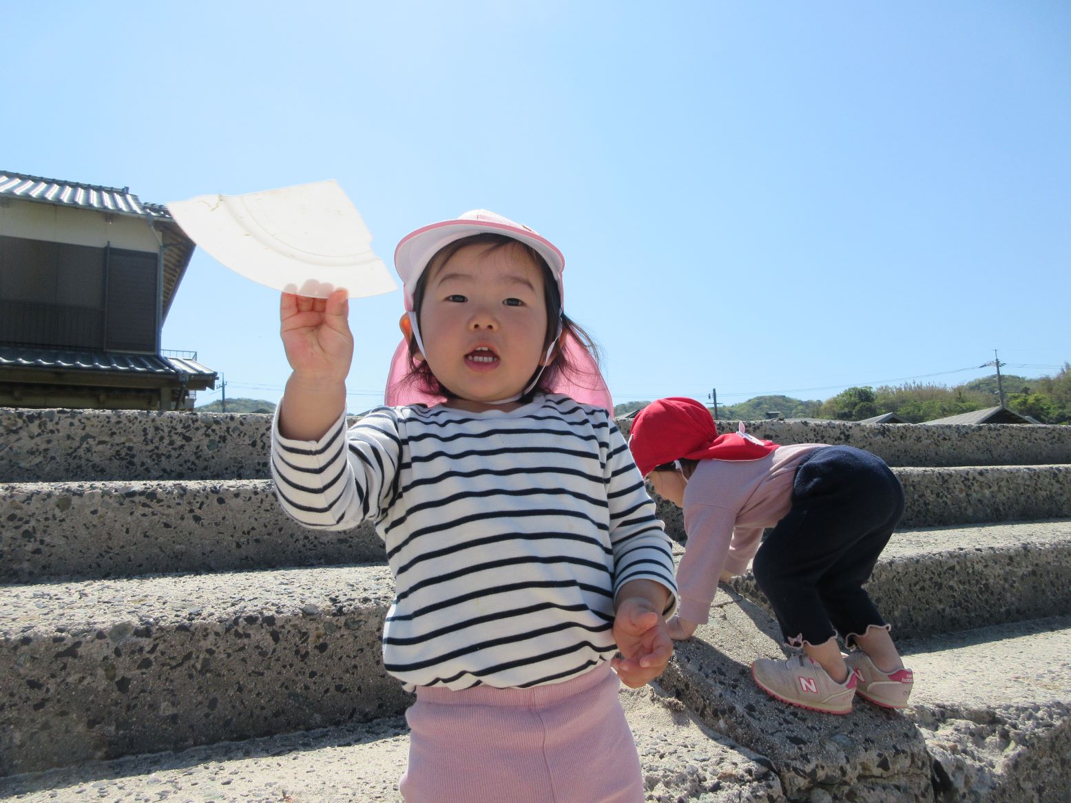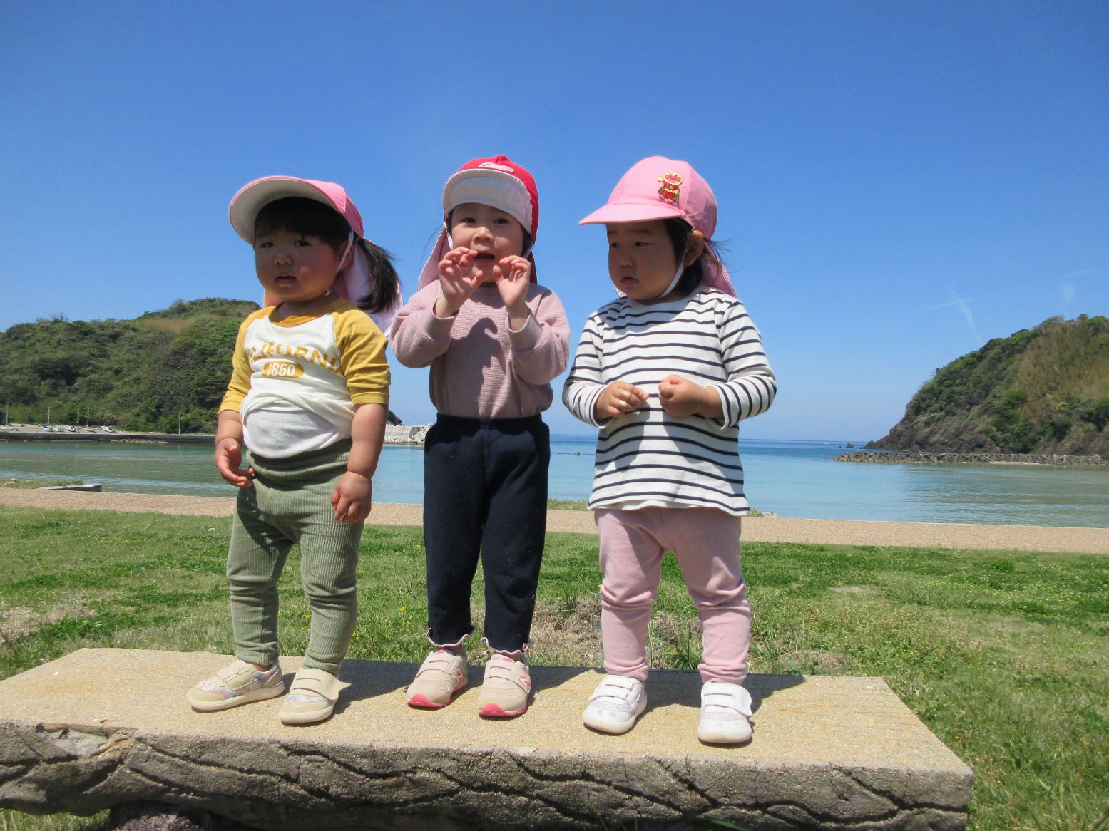 芝生で花を見つけて摘んだり、浜に下りて砂のさらさら感を楽しんだり、貝殻探しをしたり…。途中、とんびが空高く飛んでいる影が地面を動いたり自分の体にかかったりすることに気付いたこどもが、空を見上げてとんびを探していました。いろいろな発見がありました。
