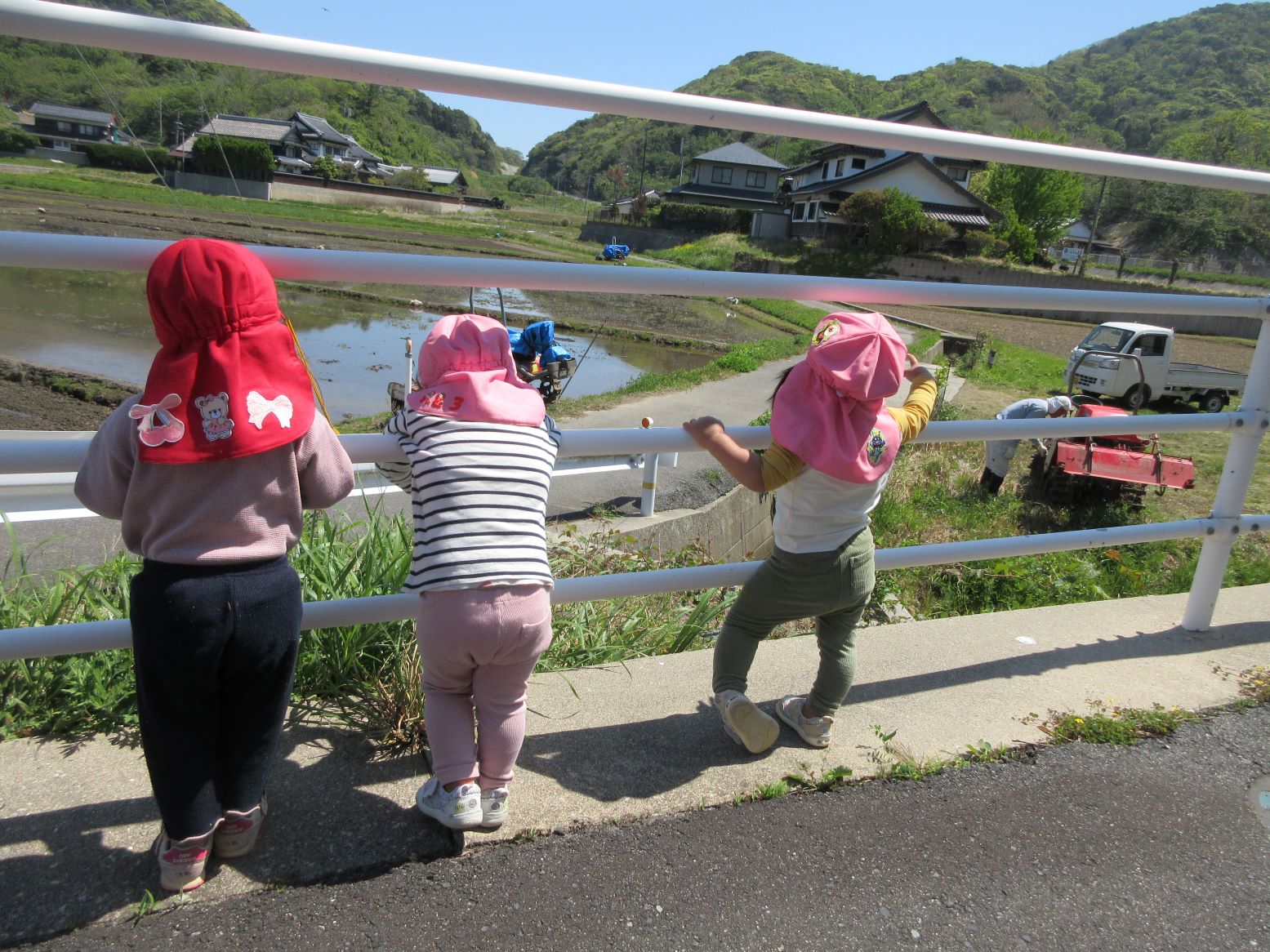 道中は畑の中に蝶々を見つけたり、田植え機に興味をもって見たりしていました。