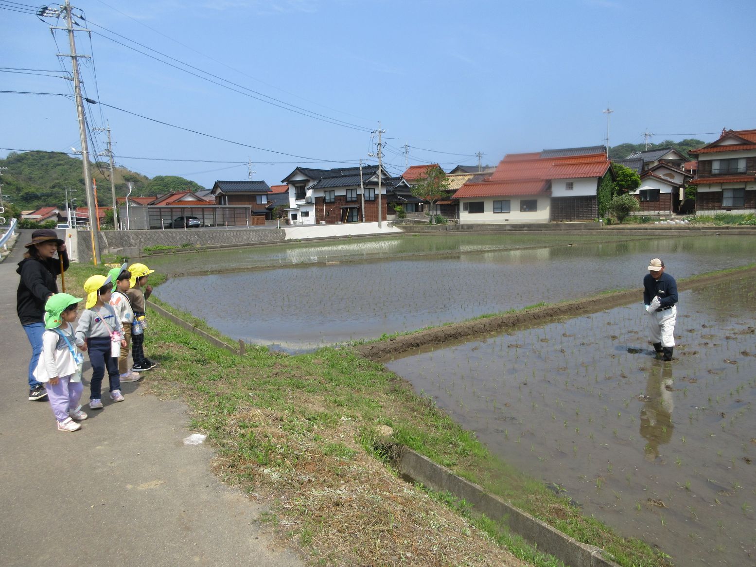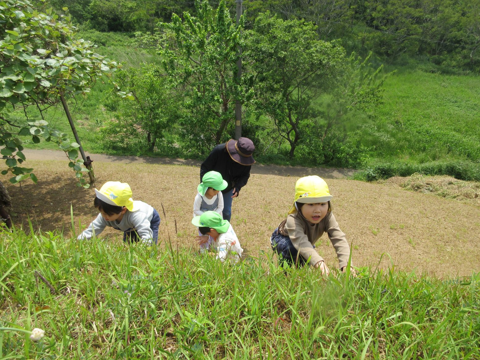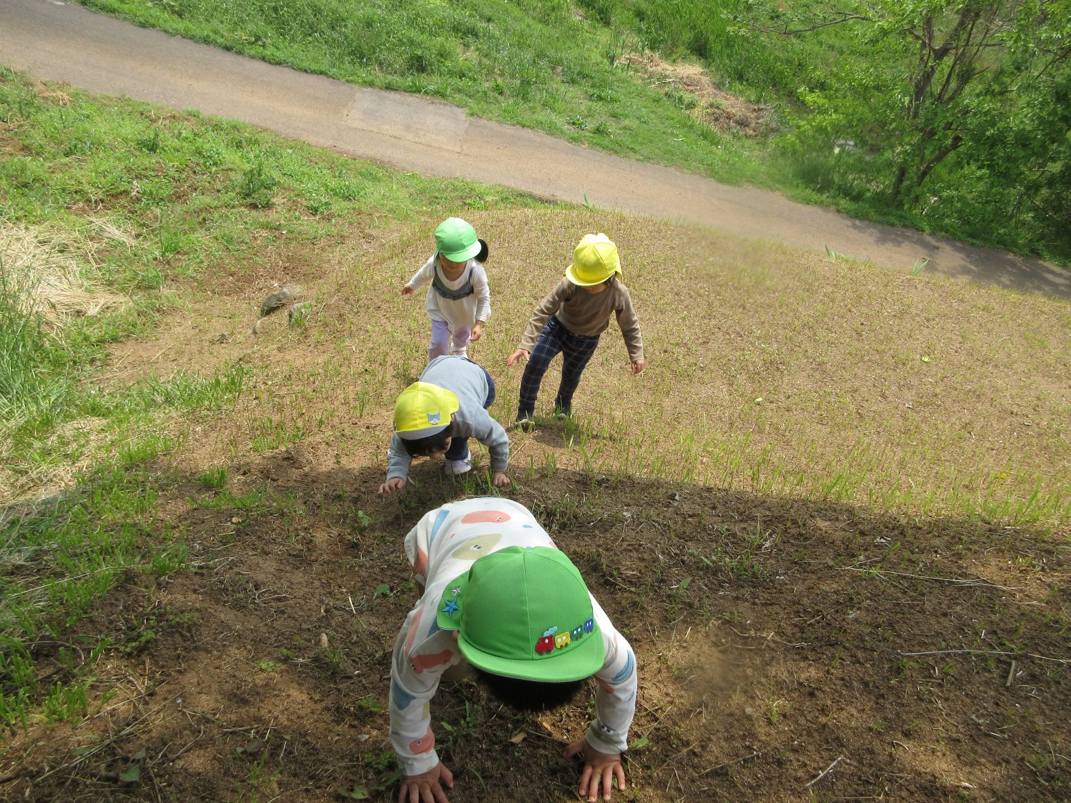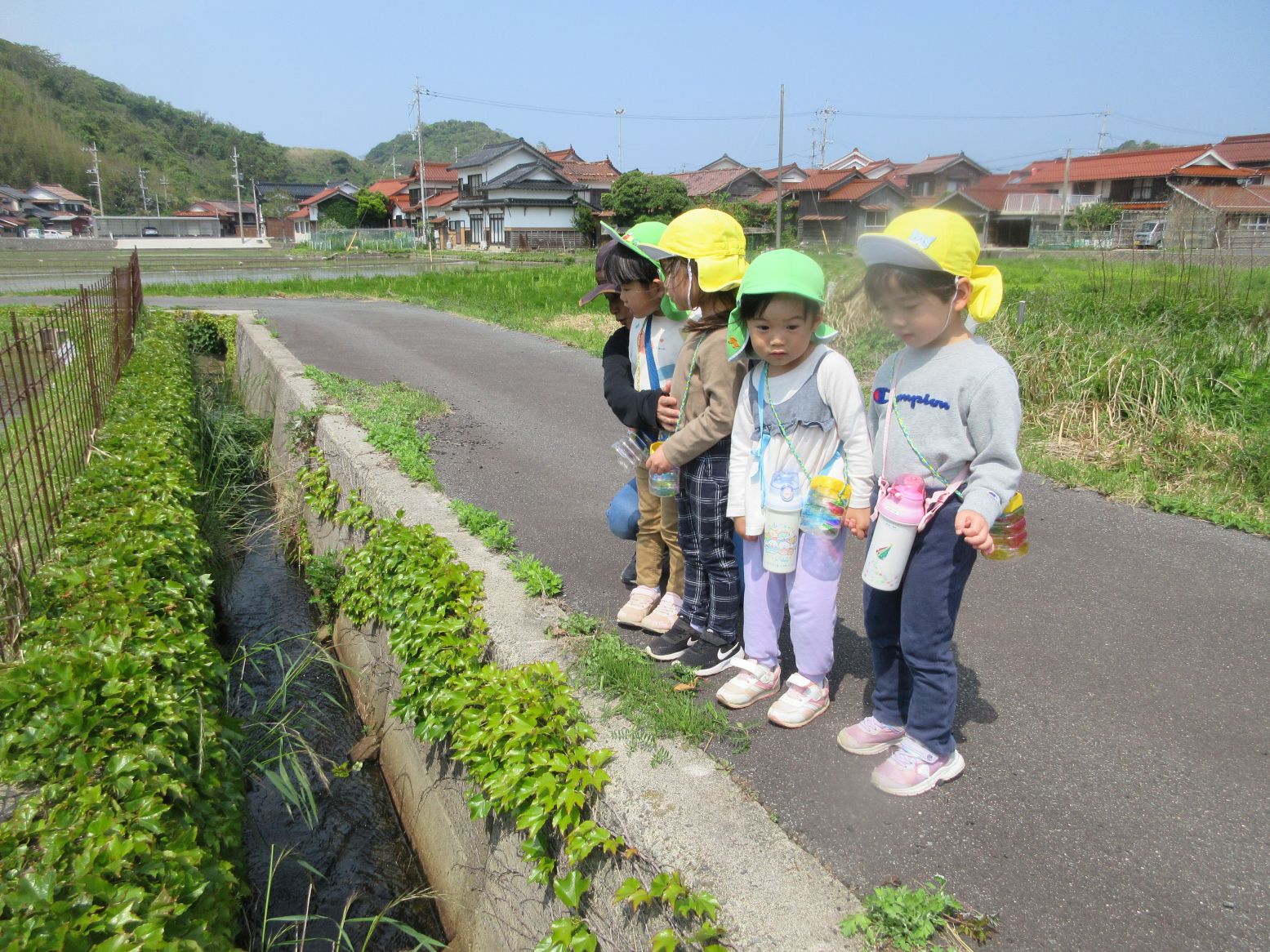 「いってきま~す!」と玄関を出たところで…きれいな花に出会い、ダンゴムシに出会い、早速、春のいいものを見つけました。田んぼまで来ると地域の方が仕事をしておられる様子を見て「なにしてるのかな~」「なにをしているんですか~?」と、こども達。「田んぼのお仕事だよ」と優しく教えてくださいました。コロコロ斜面に着くまでに、地域の“ステキ”に、たくさん出会いました。写真で紹介していきます。ご覧ください。