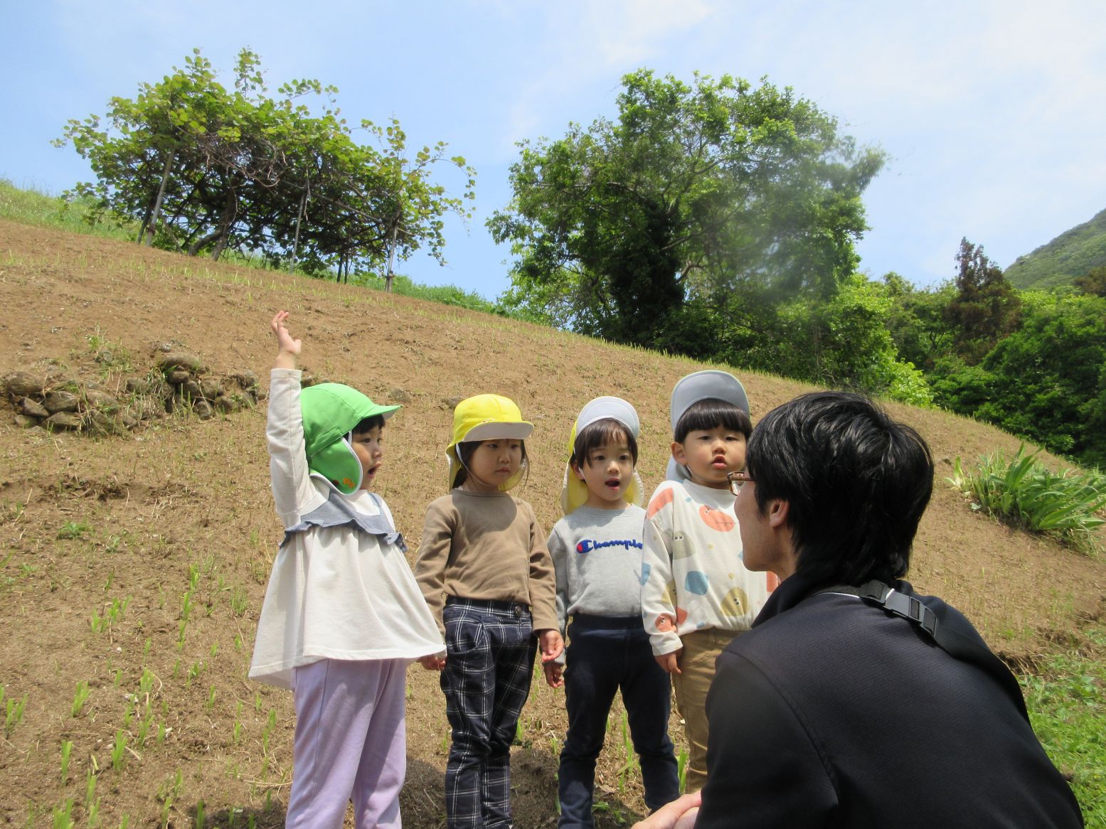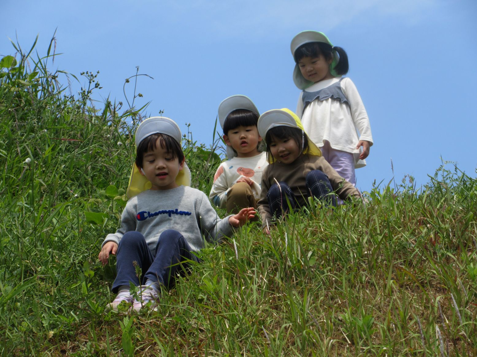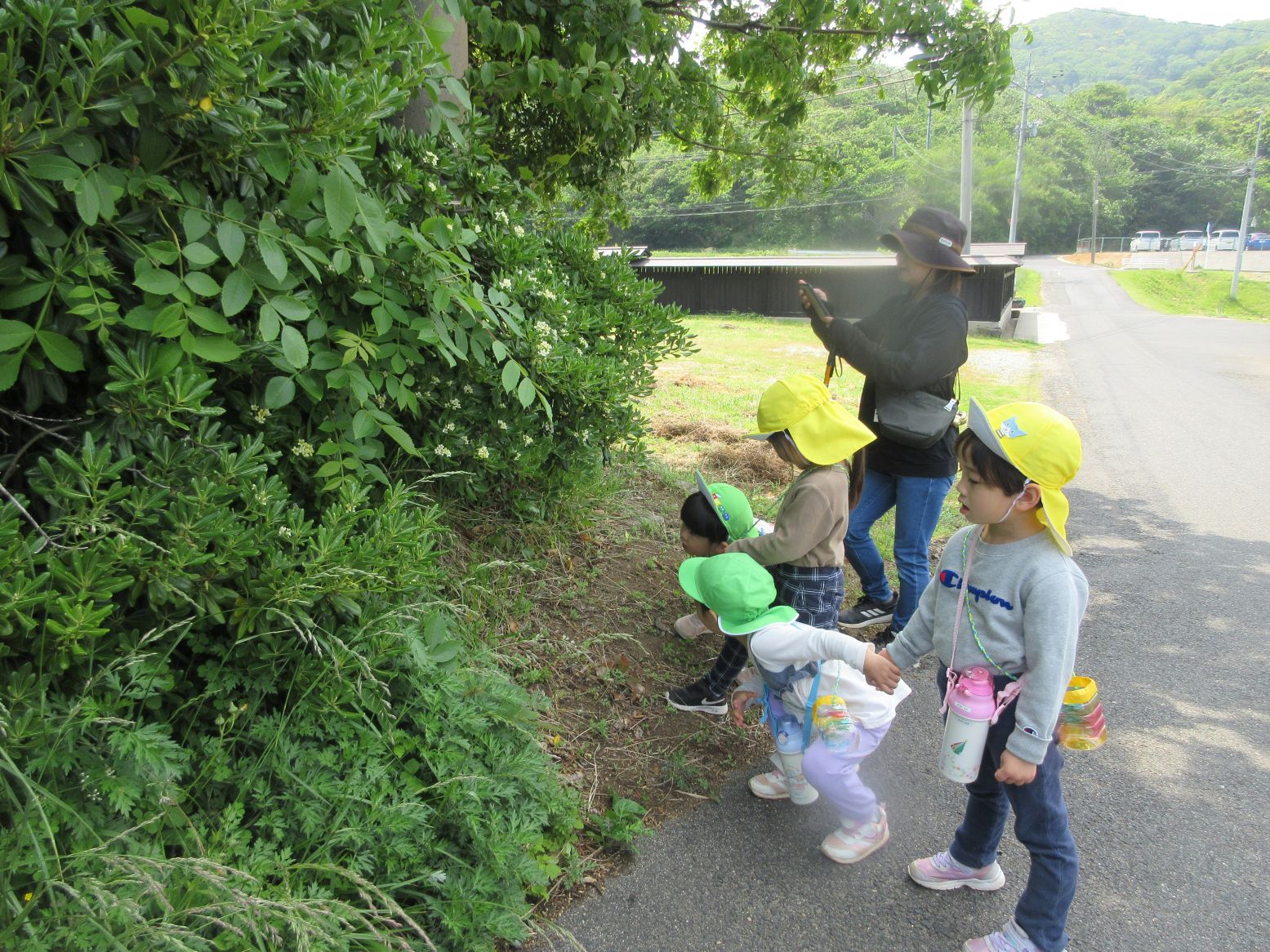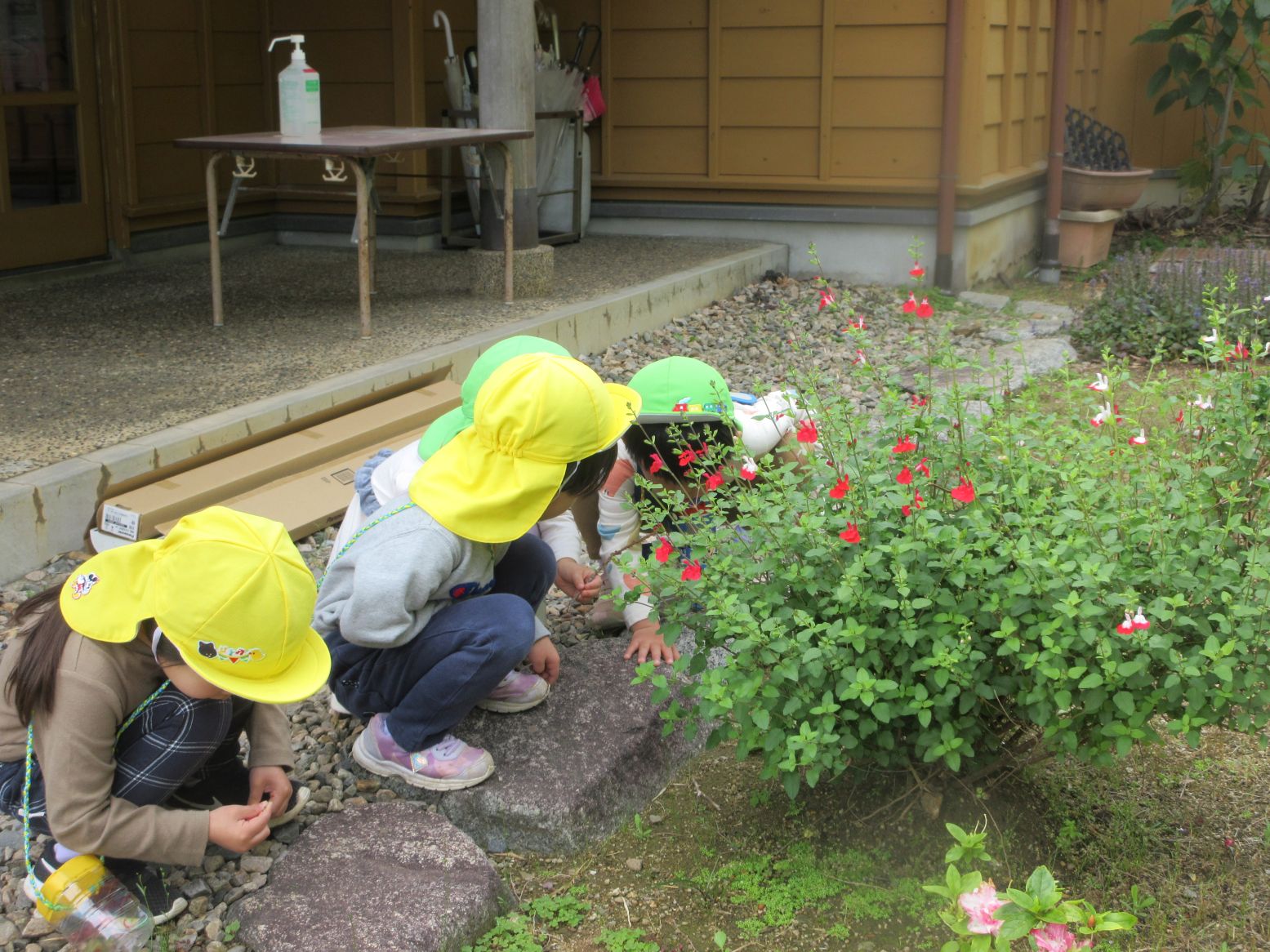「いってきま~す!」と玄関を出たところで…きれいな花に出会い、ダンゴムシに出会い、早速、春のいいものを見つけました。田んぼまで来ると地域の方が仕事をしておられる様子を見て「なにしてるのかな~」「なにをしているんですか~?」と、こども達。「田んぼのお仕事だよ」と優しく教えてくださいました。コロコロ斜面に着くまでに、地域の“ステキ”に、たくさん出会いました。写真で紹介していきます。ご覧ください。