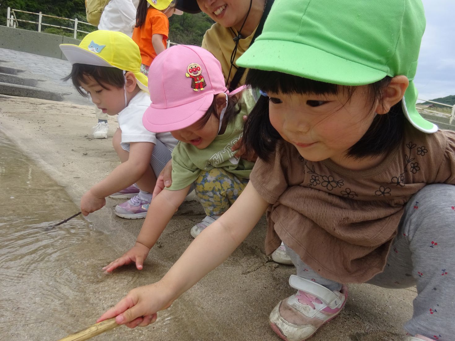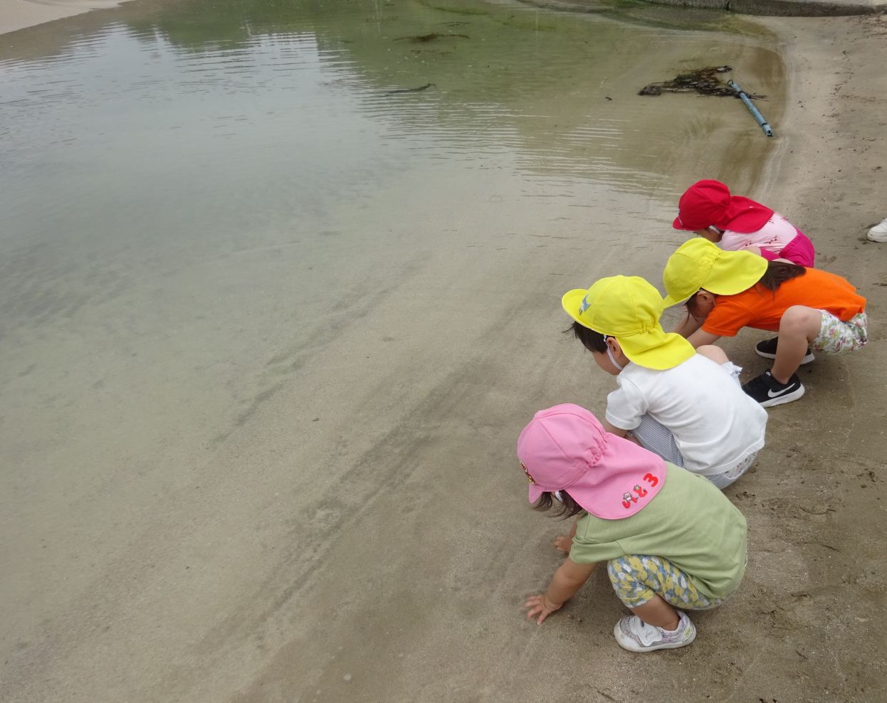 集会後は浜に下りて、足跡探しや砂の上に字や絵、模様を描いて遊びました。海水の水溜まりが出来ていたので、手や棒を浸して楽しみました。