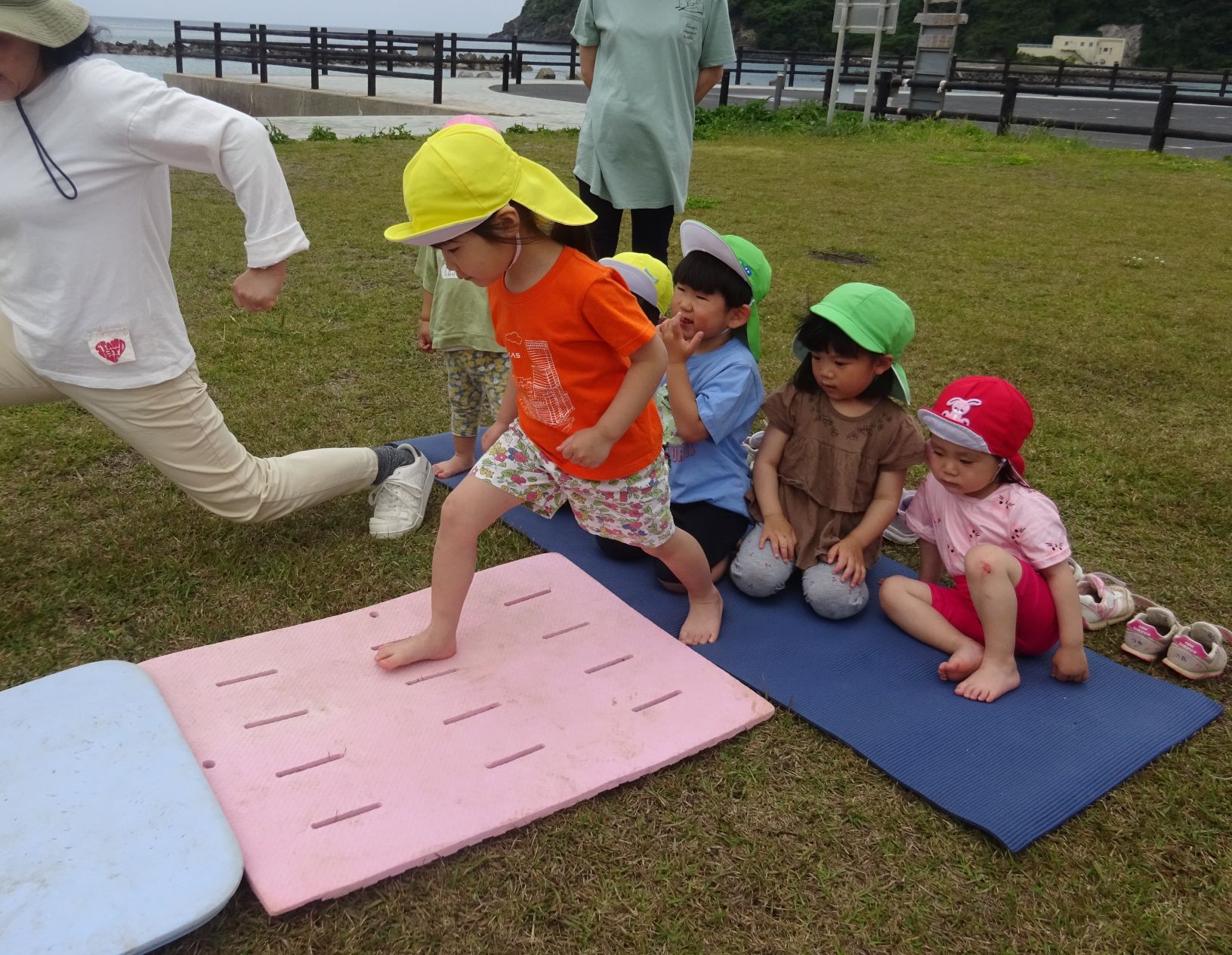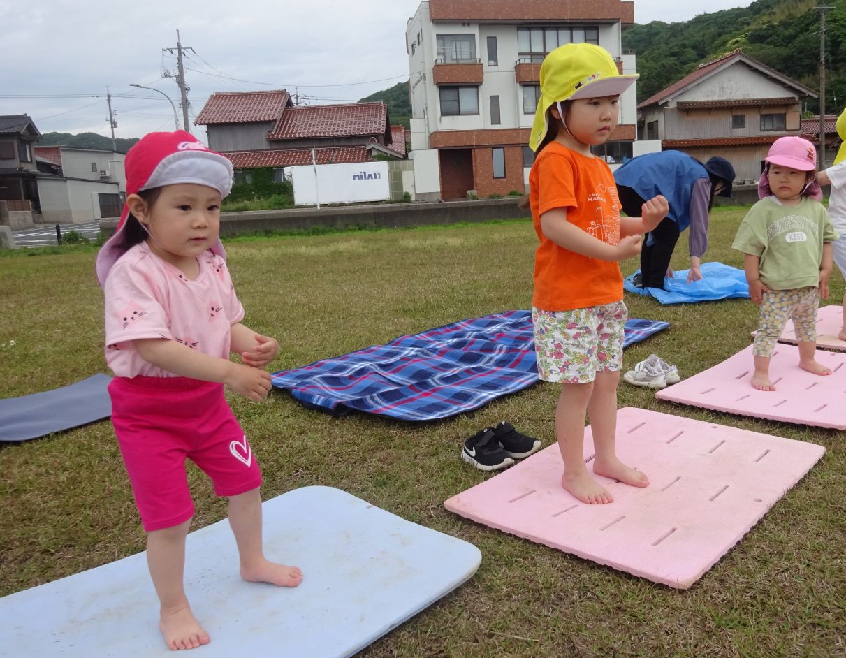 今週の“わくわくチャレンジ集会”は野波海浜公園の爽やかな風のもとで行いました。