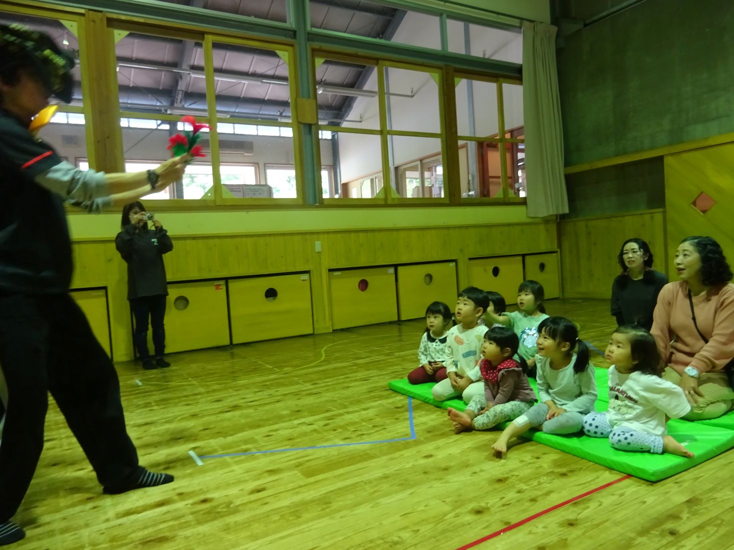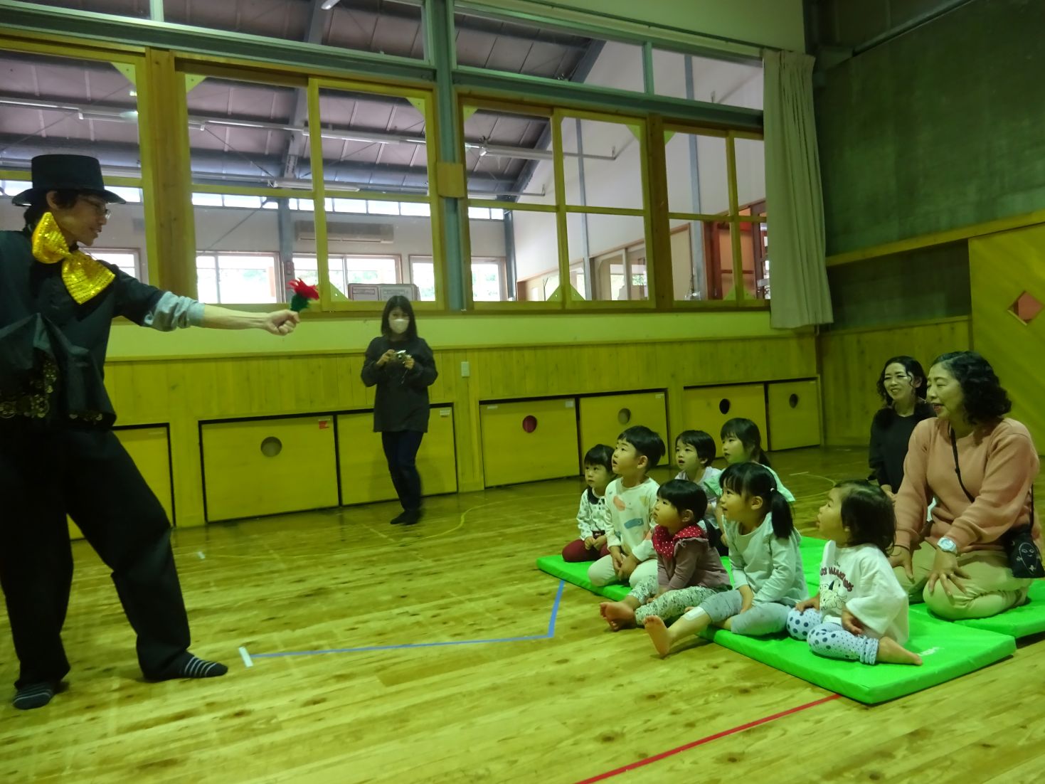 手品のお兄さん登場!1本のバラの花が3本に!!こども達は目を丸くしたり「あ~!」と指をさしたりして、手品の“不思議さ”や“面白さ”を感じていました。