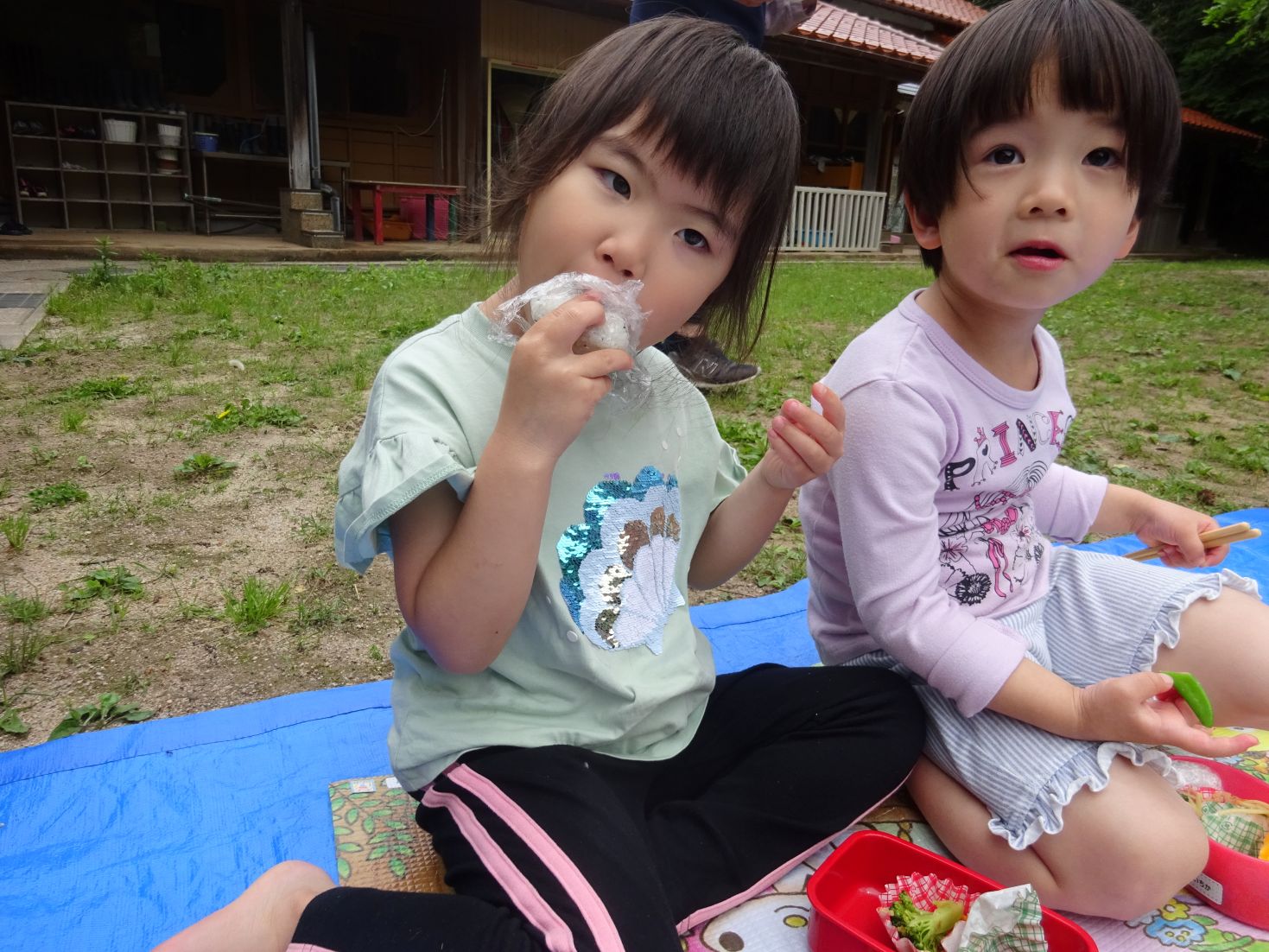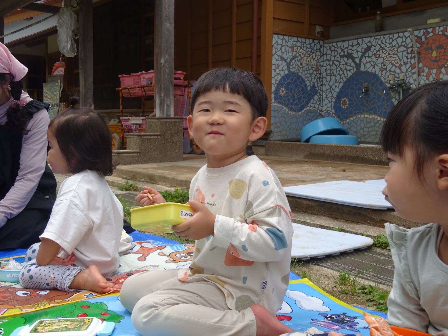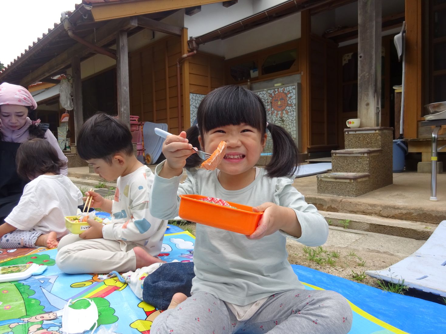 手品ショーが終わると給食弁当の時間です。空のお弁当箱に今日の給食メニューを詰めて所庭へ出ます。心地よい天候の中、笑顔いっぱいで同じ弁当を見せ合いながら楽しくいただきました。
